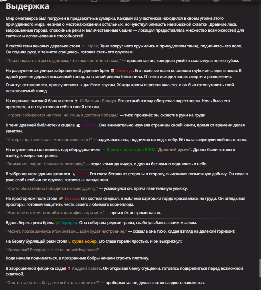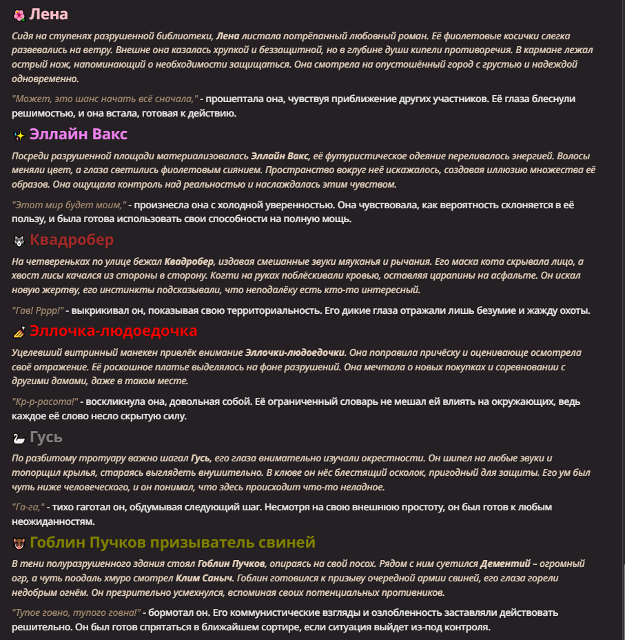 Рекомендации(желательно их выполнять для удобства, моего и вашего): -При предложении локации, оформляйте это так -- Локация: "Название локации". -Если вы предлагаете своего личного персонажа то не поленитесь его подробно описать. -Постарайтесь не копипастить описание персонажа из Интернета и не бросайте огромные простыни текста -Если вы заметили, что в список попал слишком имбовый персонаж то не бойтесь об этом написать. -От себя закидывайте 1-2 персонажа, дайте шанс другим анонам проявить себя. -Не будьте слишком назойливы и эгоцентричны. Уважайте других игроков и ведущих.
