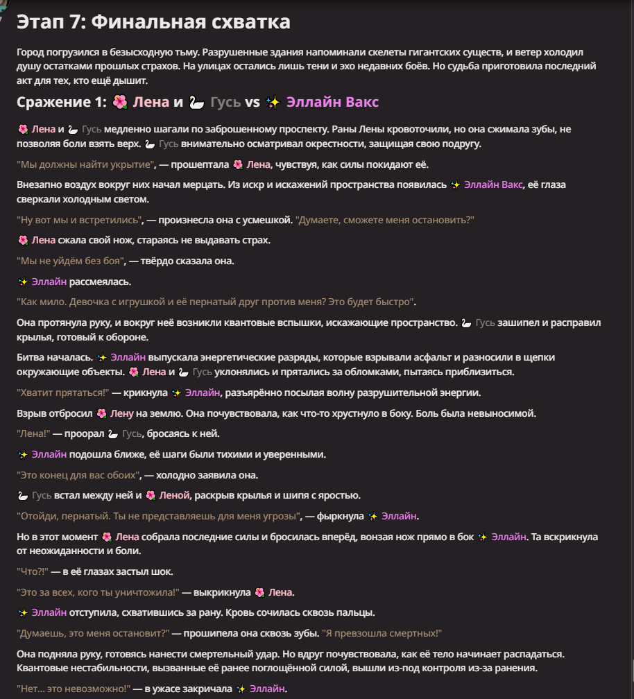 Квантовая суперпозиция: Эллайн способна находиться в нескольких местах одновременно, используя квантовую суперпозицию. Это позволяет ей быть одновременно и атакующим, и защищающим, и избегать атак. Контроль над вероятностью: Она может изменять вероятность событий, делая маловероятные события более вероятными и наоборот. Это позволяет ей добиваться нужного исхода в любой ситуации. Квантовая телепортация: Эллайн способна мгновенно перемещаться на большие расстояния, используя квантовую телепортацию. Это делает её почти неуловимой и позволяет ей неожиданно атаковать.