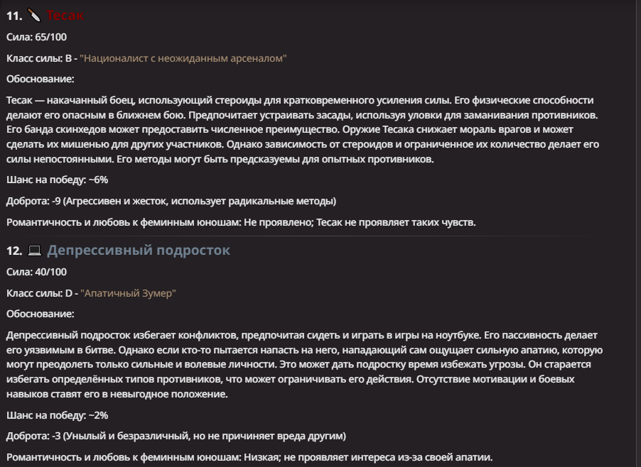 Депрессивный подросток. Это тупой ебаный зумер, который находится в вечной депрессии и называет себя хайповым словом "дед инсайд". Вместо битв он сидит на разных местах и даже не пытается с кем-то подраться, лишь играя в Доту 2 на своём ноуте, проговаривая унылые речи со словами "бле" и "мы все сгорим" и изредка нюхая мефедрон. В его пассивности его главный недостаток и уязвимость. Но если кто-то попытается подраться с ним, то напавший сам почувствует эту апатию, которую может преодолеть только сильный и волевой человек. Если среди противников депрессивного зумера есть женщины, то они будут инстинктивно к нему тянуться и пытаться заняться сексом, на них апатия не действует. Кстати женщины могут убить его во время или вместо секса. Если среди его противников есть кавказцы, то подросток будет пытаться от них убежать, на кавказцев апатия тоже не действует.