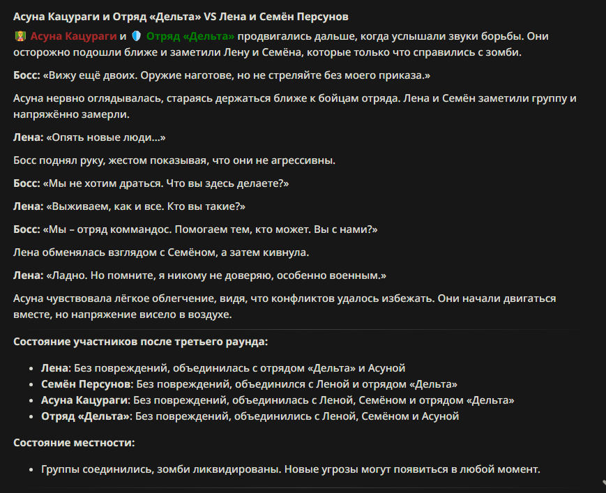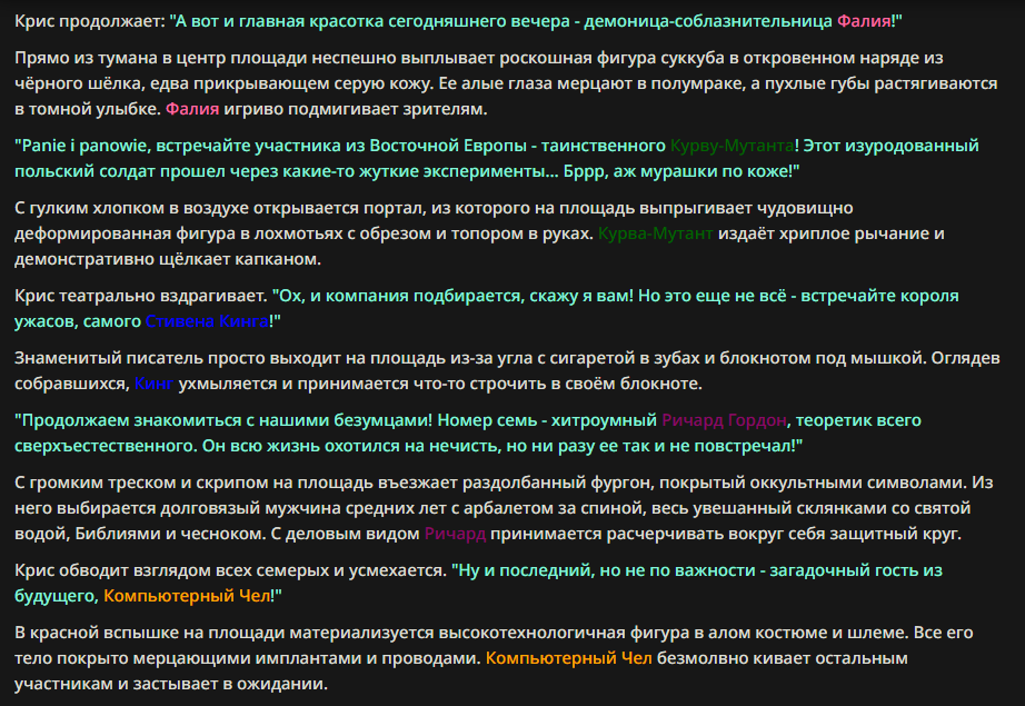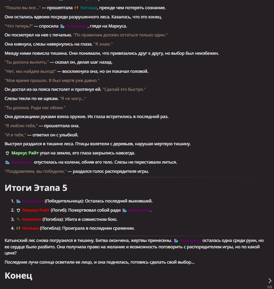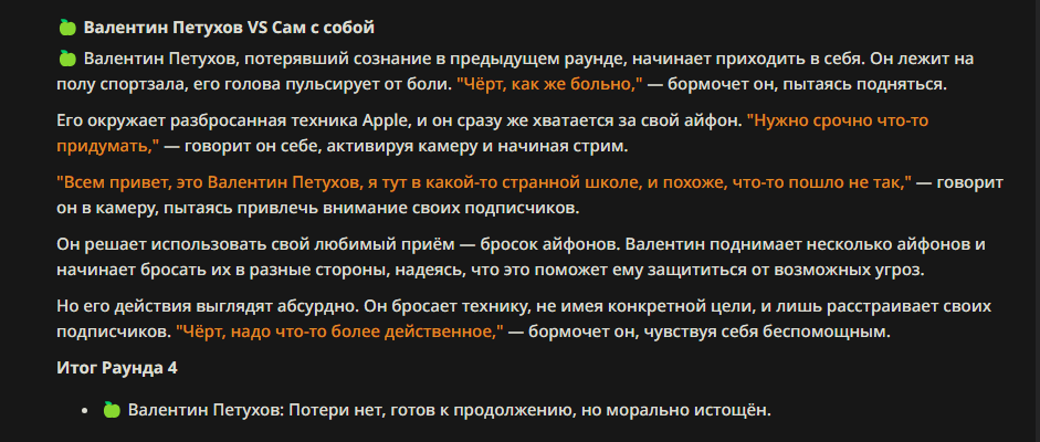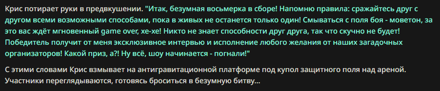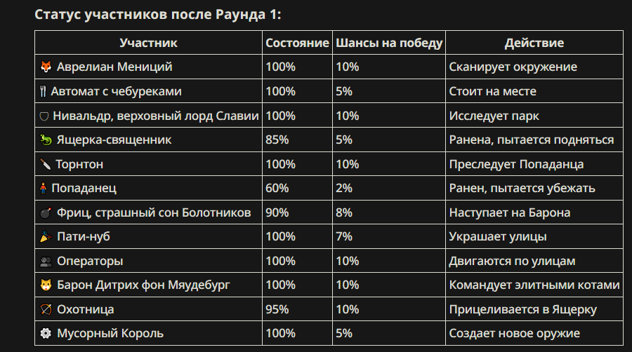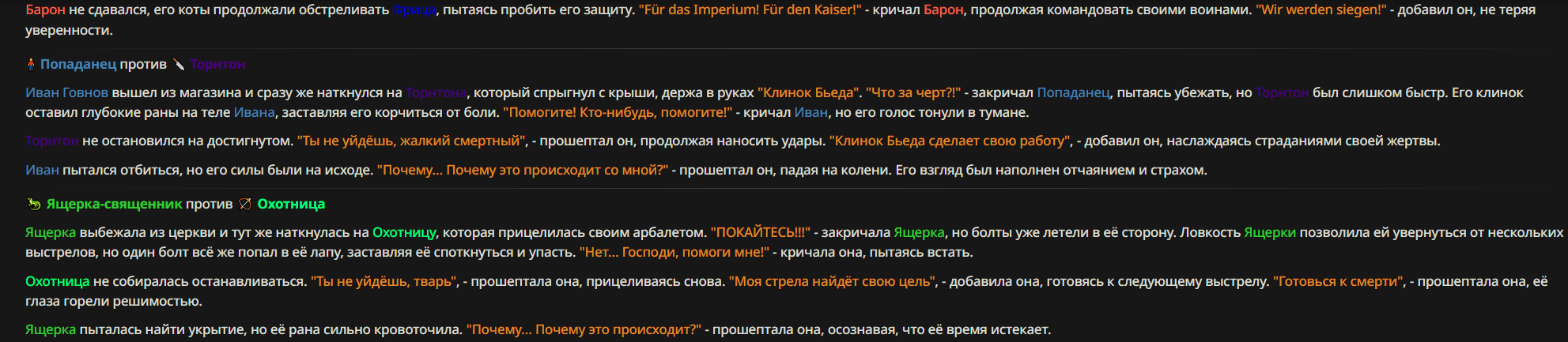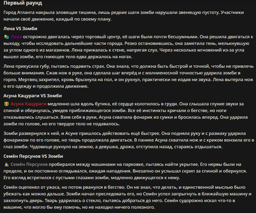 Попробовал сделать как у Злокота чтоб были отдельные дуэли между участниками а не каша, но получается что в каждой дуэли кто-то помирает, у меня за 2 этапа минус 4 человека, что-то быстро все происходит. Но зато описание лучше пишет в таком формате.