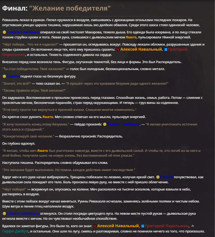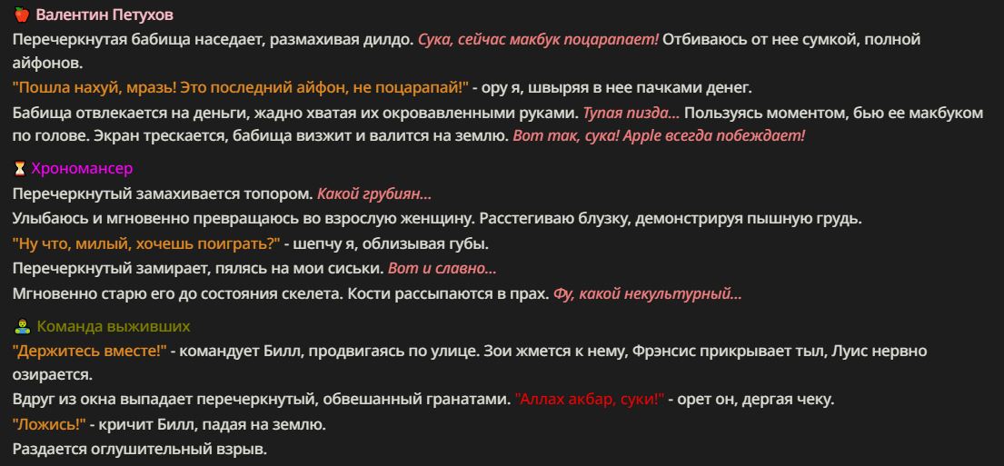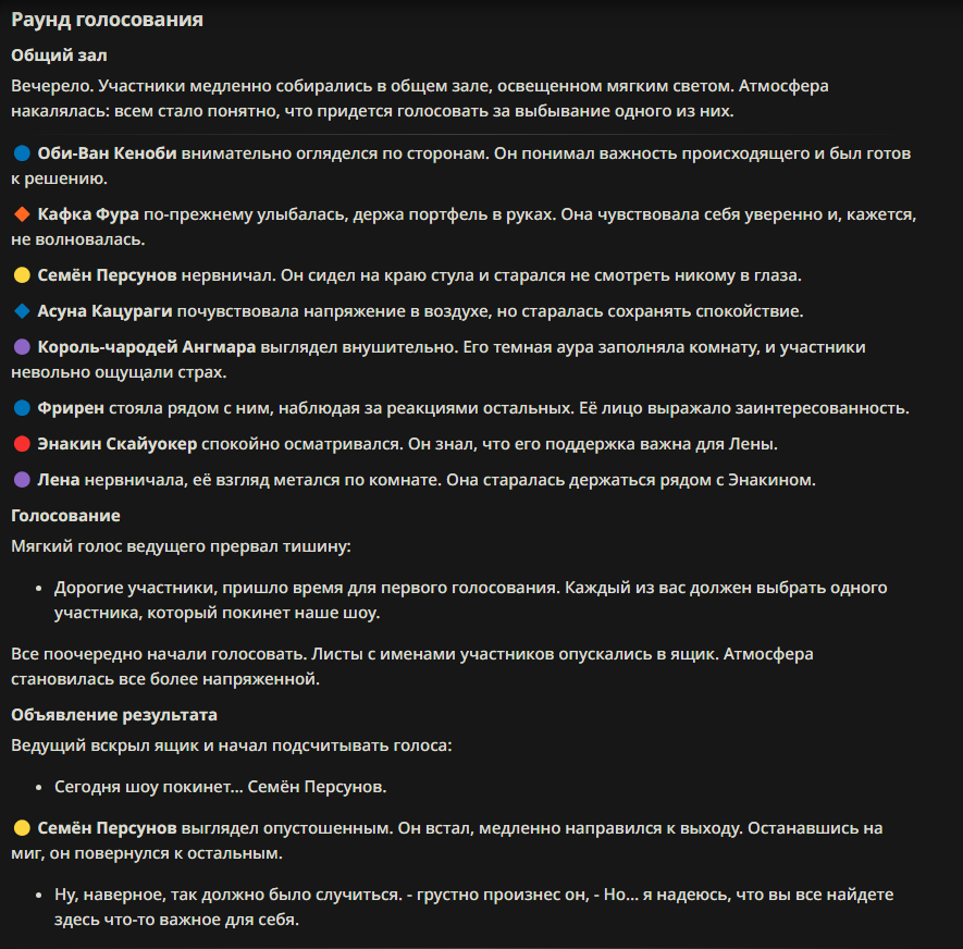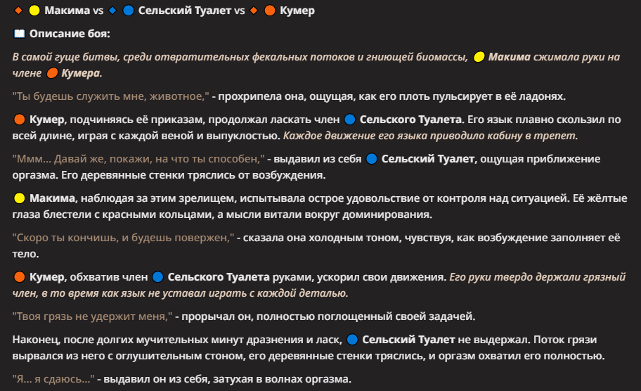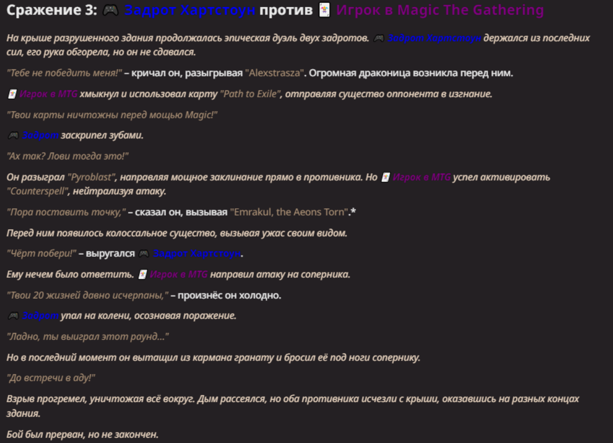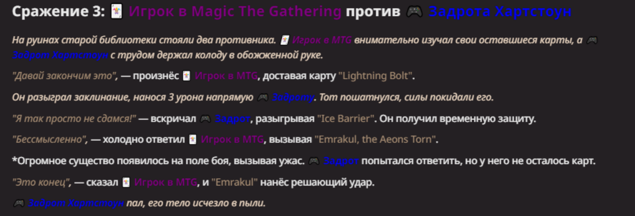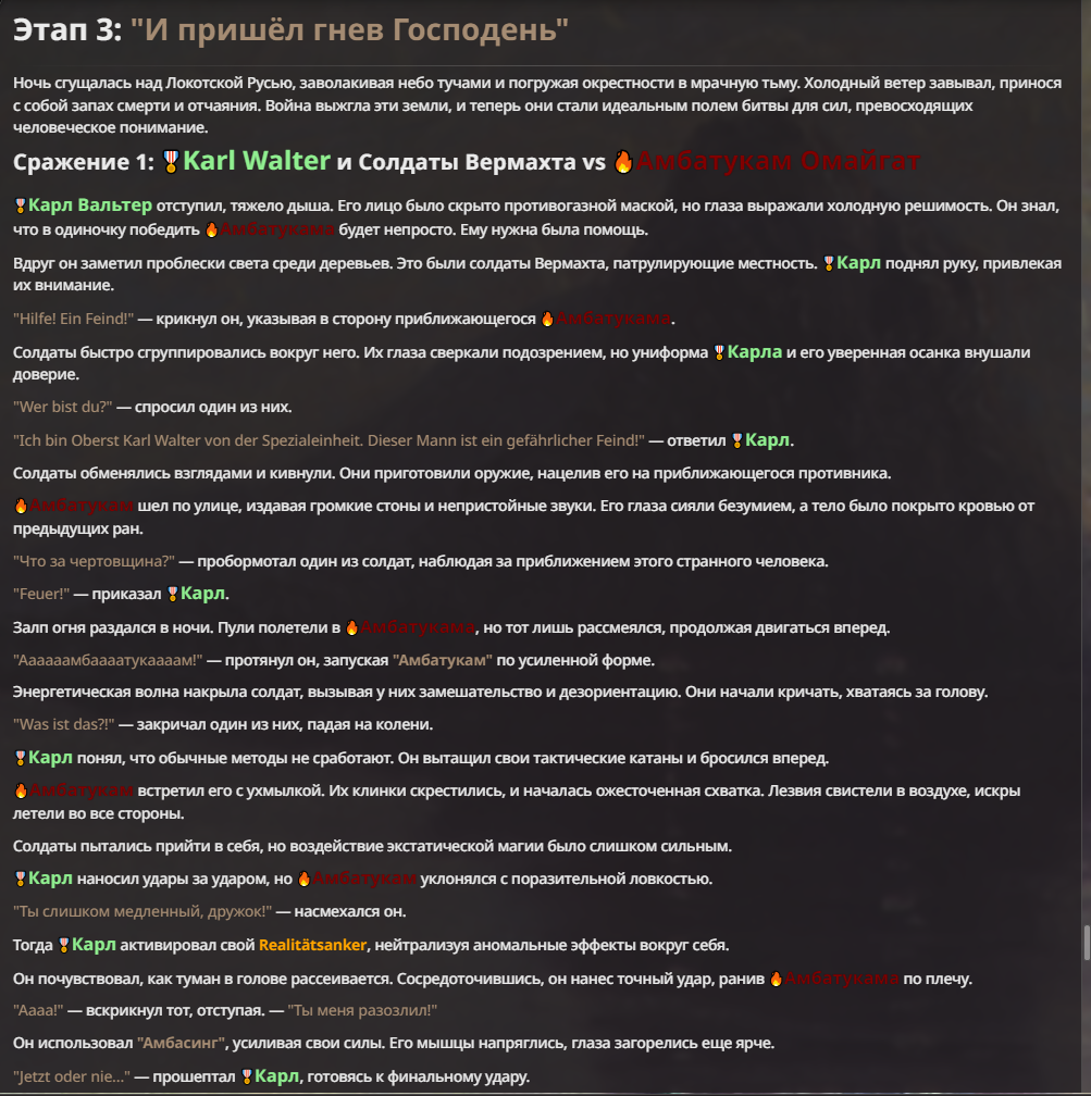 Попробовал сделать как у Злокота чтоб были отдельные дуэли между участниками а не каша, но получается что в каждой дуэли кто-то помирает, у меня за 2 этапа минус 4 человека, что-то быстро все происходит. Но зато описание лучше пишет в таком формате.