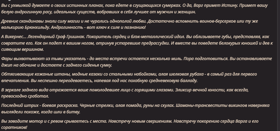 >>1549044 Традиционалистскую ролевую игру в жанре CYOA и в антураже горной Франции. Главный герой - жрец, алхимик и няша, который готовится к Апокалипсису и установлению правления Белой Андрогинной Расы.