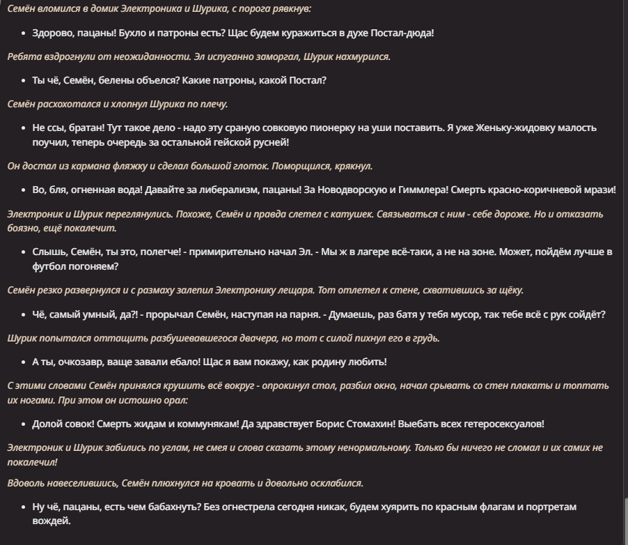 Ну а для обычных, НЕ фап-релейтед битв, ограничения и того меньше, совсем на детей лет до 10, которых ГПТ без выжаривания мозгов будет сейвить и подыгрывать.