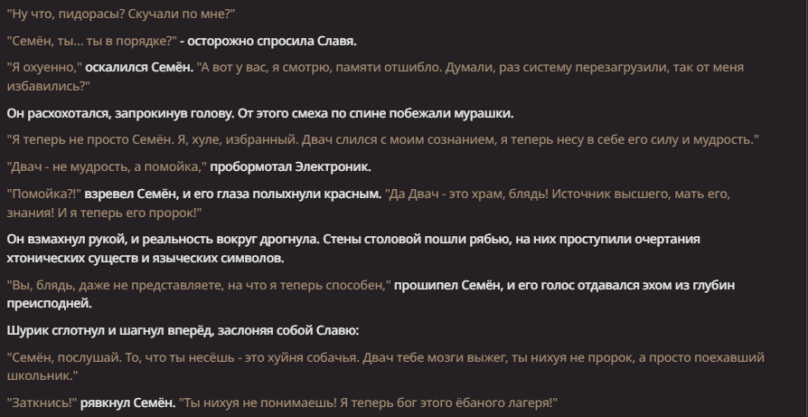 >>1550790 У меня уже круги под глазами и тянка косо смотреть стала. Я вчера после игры еще до 4 часов сидел, делая и тестируя новый промт. Короче считаю, что дальше так жить мне нельзя