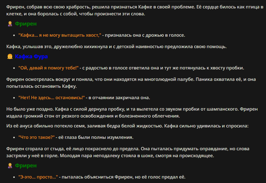 >>1551509 Тем не менее, у него очень хорошие промты и богатая фантазия. Одни из самых запоминающихся игр и форматов принадлежат его перу. А что таверной не пользуется - так он и на обычной ГПТ выдаёт на удивление годные результаты. Хороший он, просто, видимо, консервативной закалки. Но мы и его солдатское сердце растопим пониманием и любовью~