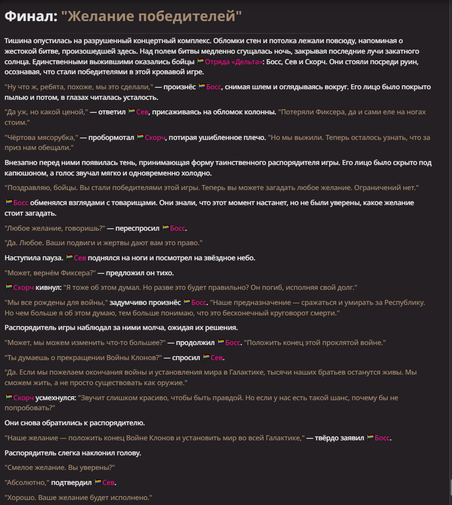 >>1551546 >Напоминаю, что ты НЕ должен уравнивать силу участников, моделировать бой надо предельно реалистично с упором на описание персонажей. Персонажи должны активно использовать свои способности и особенности, которые прописаны в их описании. Теперь я понял почему у меня в битвах, простая безоружная учительница Асуна, шариковой ручкой пиздит джедаев и всяких околобогов