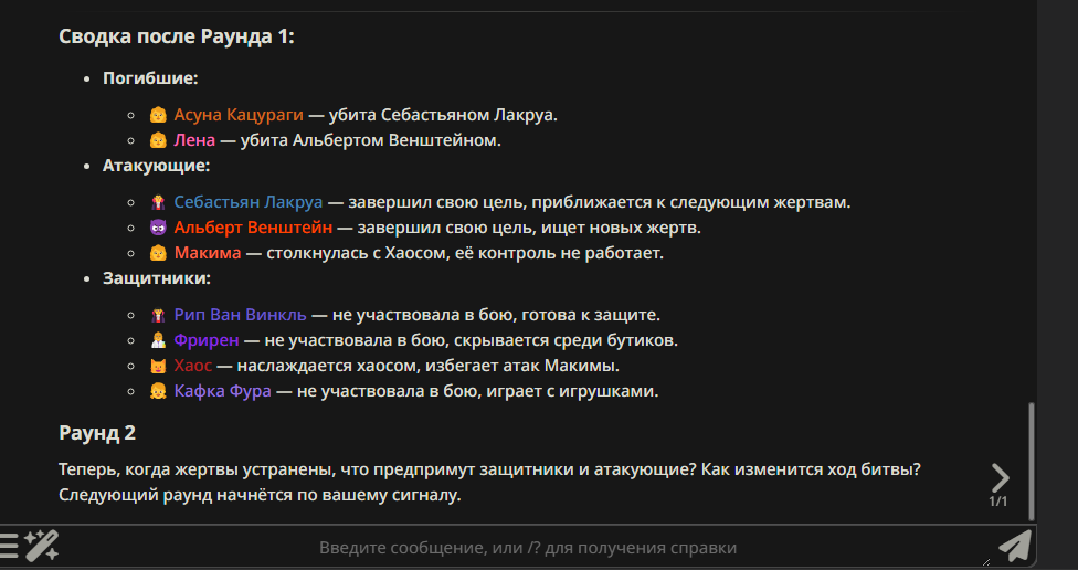 Каждое столкновение участников в рамках одного раунда должно описываться по формуле [участник] против [участник], допускается участие трех и более участников в одном противостоянии. Напоминаю, что ты НЕ должен уравнивать силу участников, моделировать бой надо предельно реалистично с упором на описание персонажей. Персонажи должны активно использовать свои способности и особенности, которые прописаны в их описании.