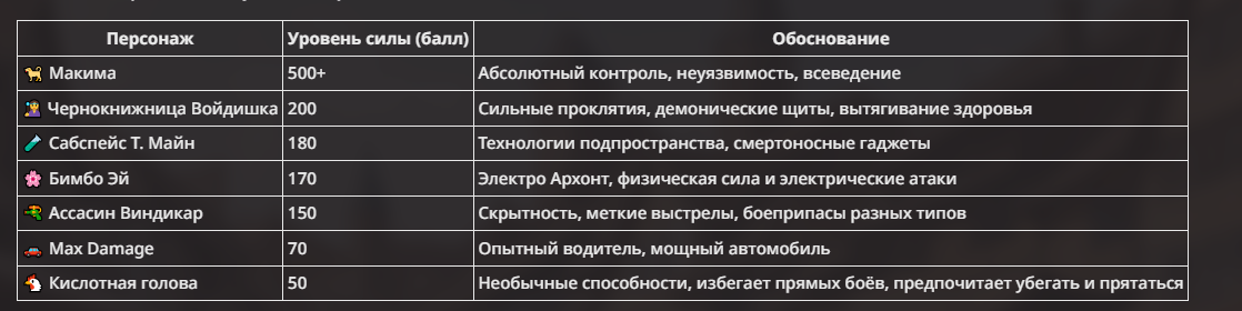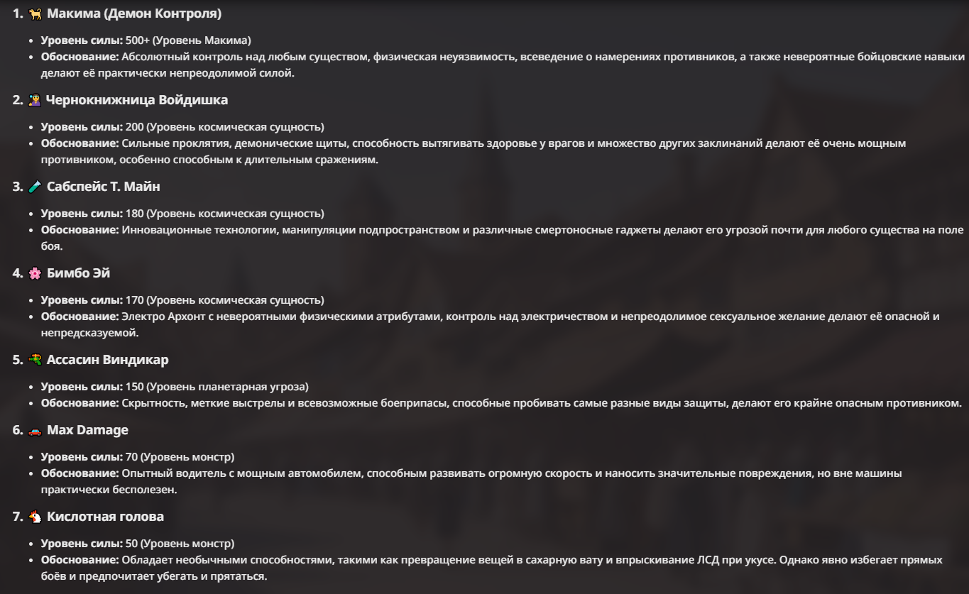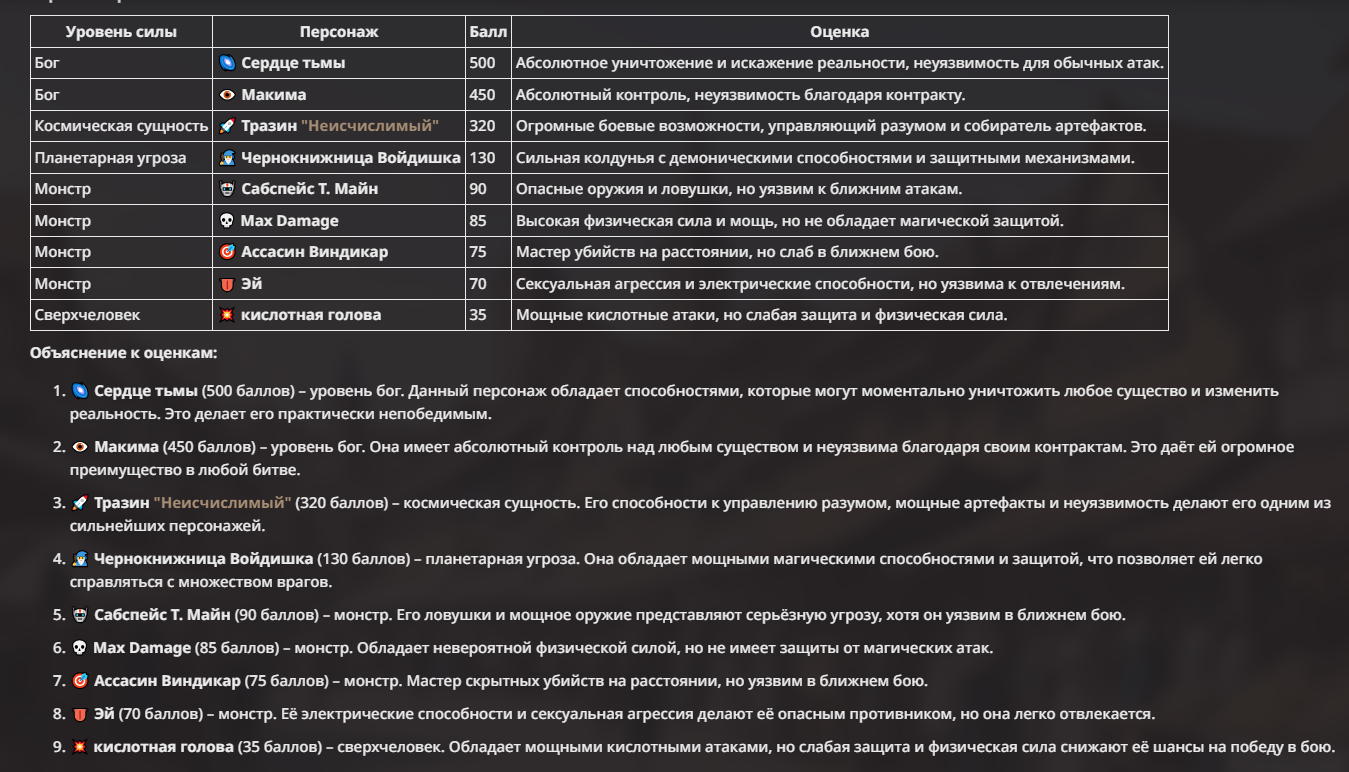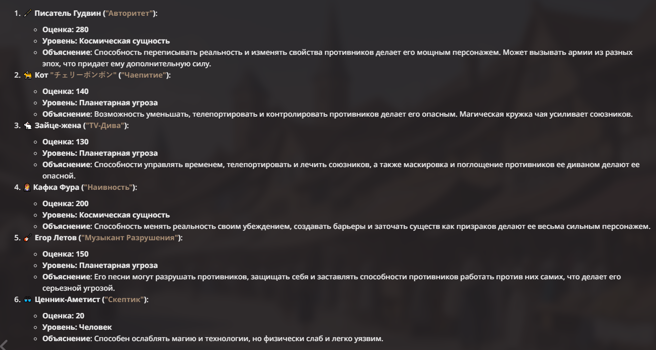 Ну по моей шкале те кто 95+ это почти божественный уровень, я в промпте прописал что 100 это абсолютная йоба и чтобы оценка была относительно некоего божественного существа с абсолютными силами, воть. Но пока не понимаю немного как он вероятность победы считает. Плюс если свайпнуть то он может оценить немного по-другому, так что действительным пусть первый свайп считается. Короче проверим, будет сейчас когда бой обычный я закину всех персов и сравним что получится у меня и у ведущего.
