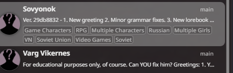 Но мб всё таки снять этот запрет если дело касается неоригинальных чаров но общественно известных, чтобы можно было вкинуть персонажа в игру просто например написав тупо "Человек-Паук из кинофильма Человек-Паук 3: враг в отражении" "Аинз Оал Гоун - главный герой из аниме Overlord, без мировых предметов" и чтоб таких принимали
