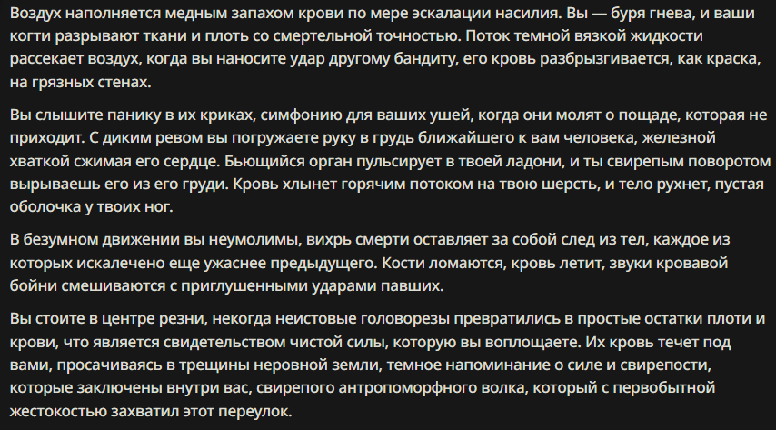 >>1560976 Я просто прошу его максимально подробно описывать каждую часть, на 50 предложений ил n слов, например, и потом генерю сражения по одному. 1 генерация - 1 сражение.