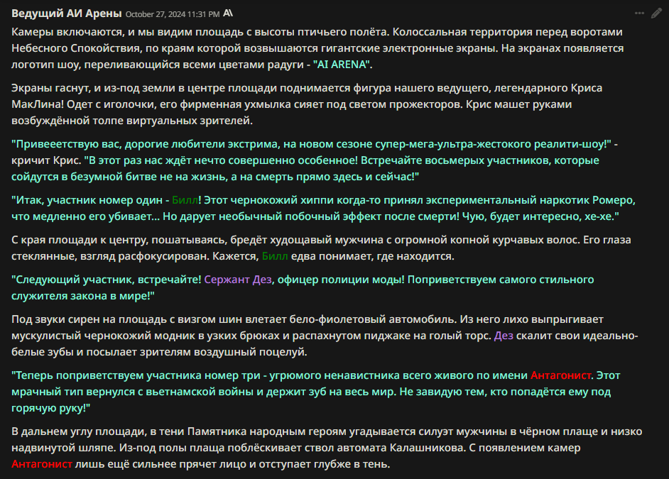 Аноны у меня возникла идея, почему не превратить АИ арену в отдельный сайт? Просто представьте аноны залетают сразу(так как ведущий будет не обязателен) на бой, предоставляют только разрешённое количество персонажей, куча комнат с боями(с АИ на любой вкус), не будет ожидания ведущего. Будет, что-то типо сайта с симулятором голодных игр, но мультиплеер.