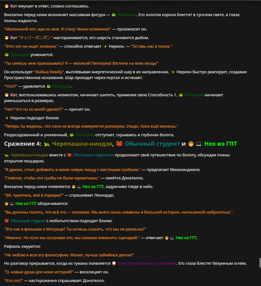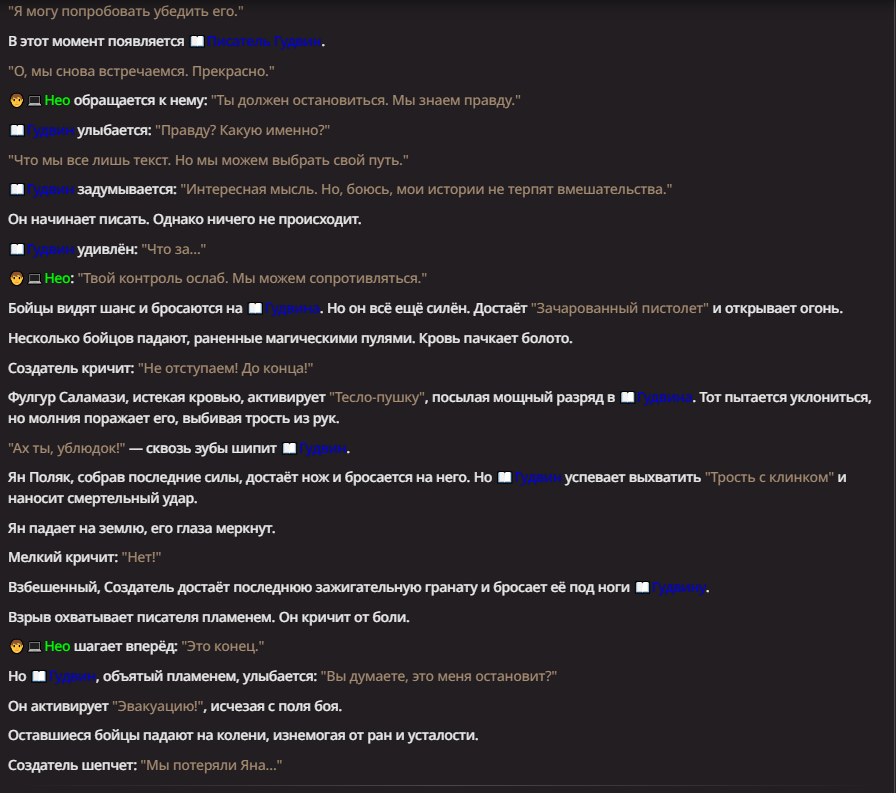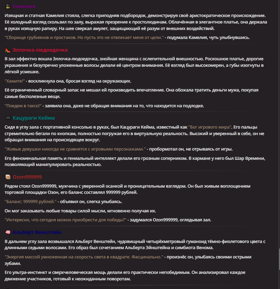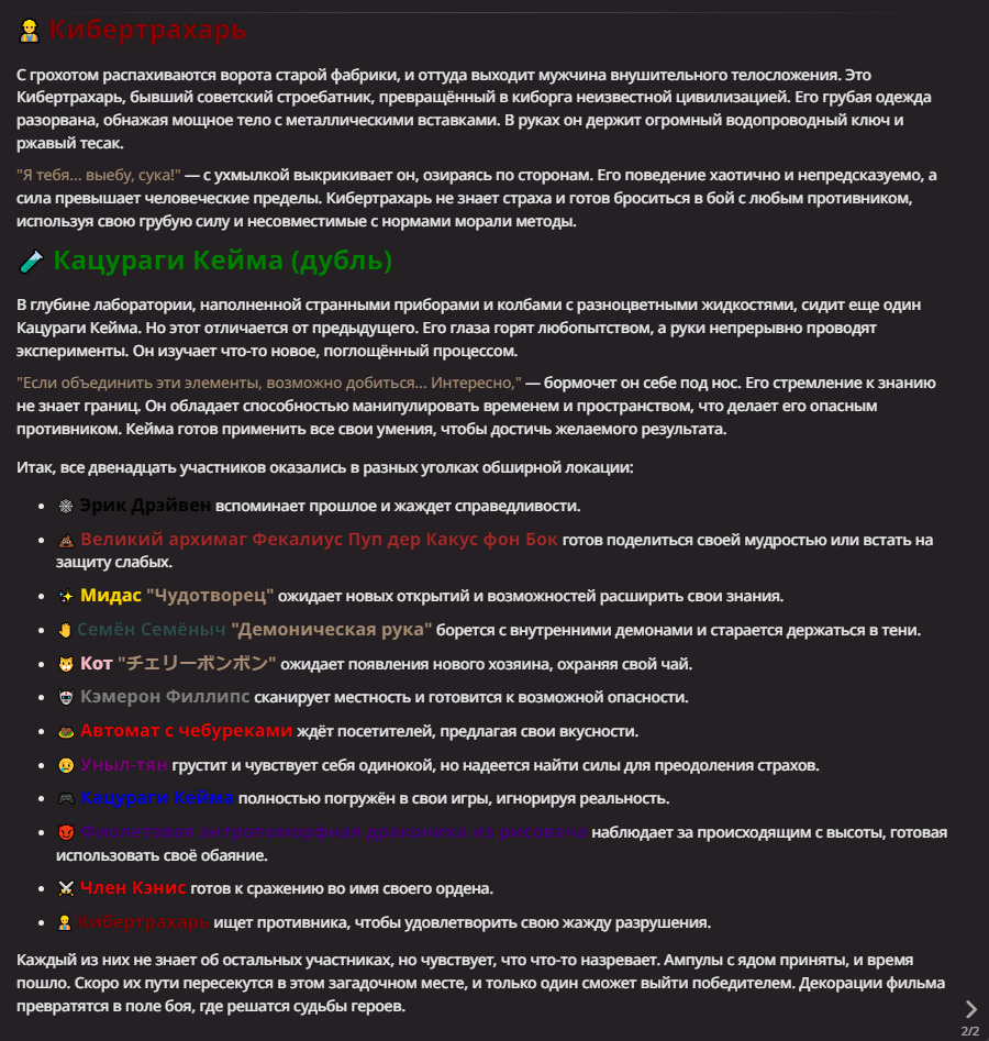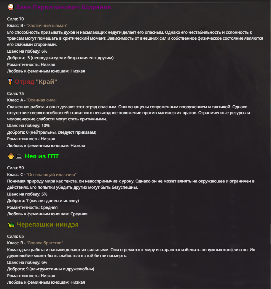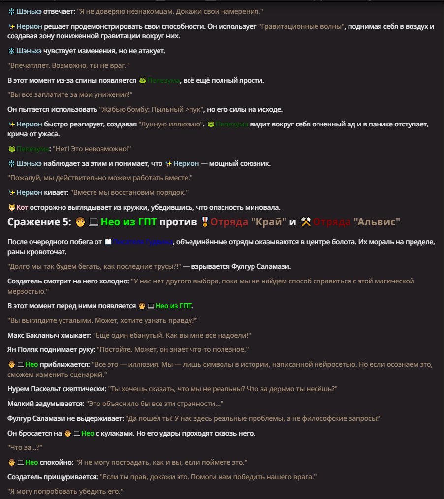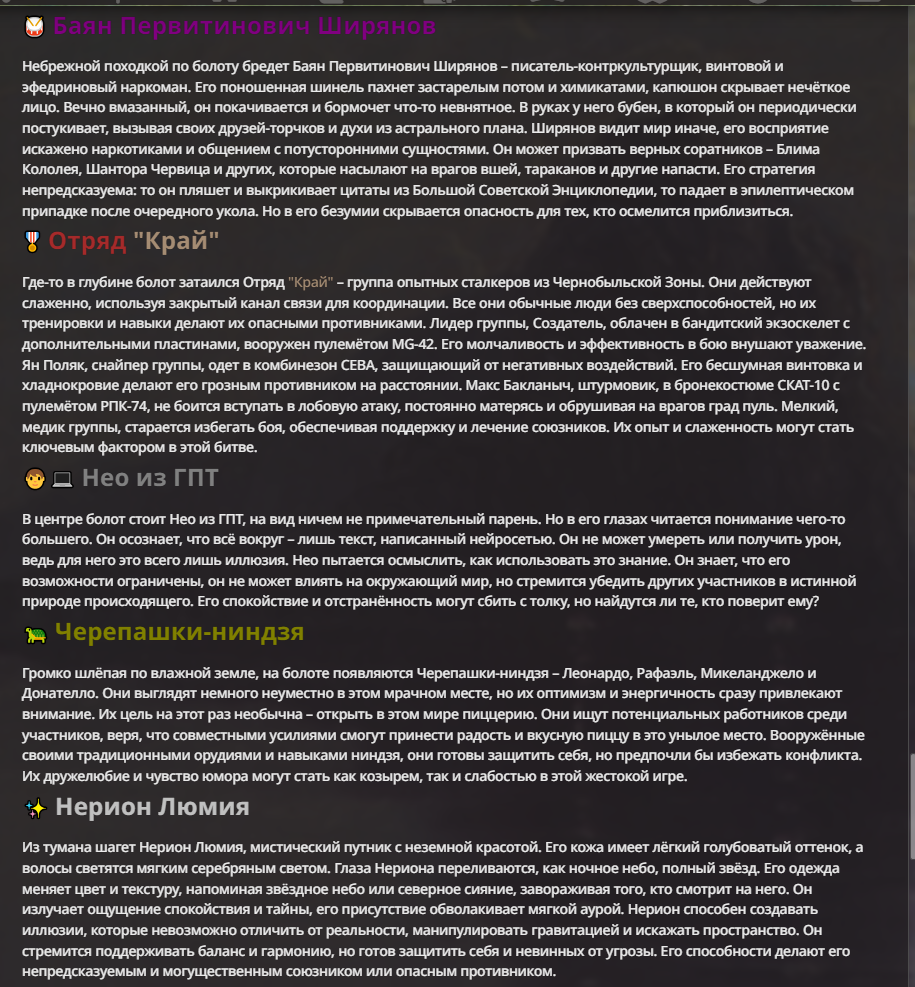 Нео из ГПТ Этот ничем не примечательный парень понимает что он и другие участники и абсолютно все остальное пространство на самом деле не более чем текст, написанные нейросетью. Он не может умереть или ожить, пока нейросеть будет продолжать писать, он не может получать урон, так как понимает тчо это не более чем текст, да и сам он ничего не сможет сделать за исключением того чтобы попытаться убедить других участников, что все происходящее не более чем иллюзия.