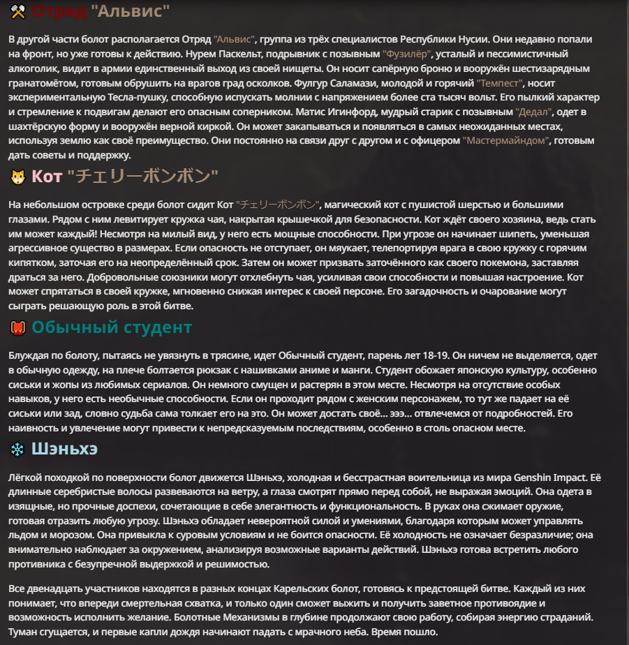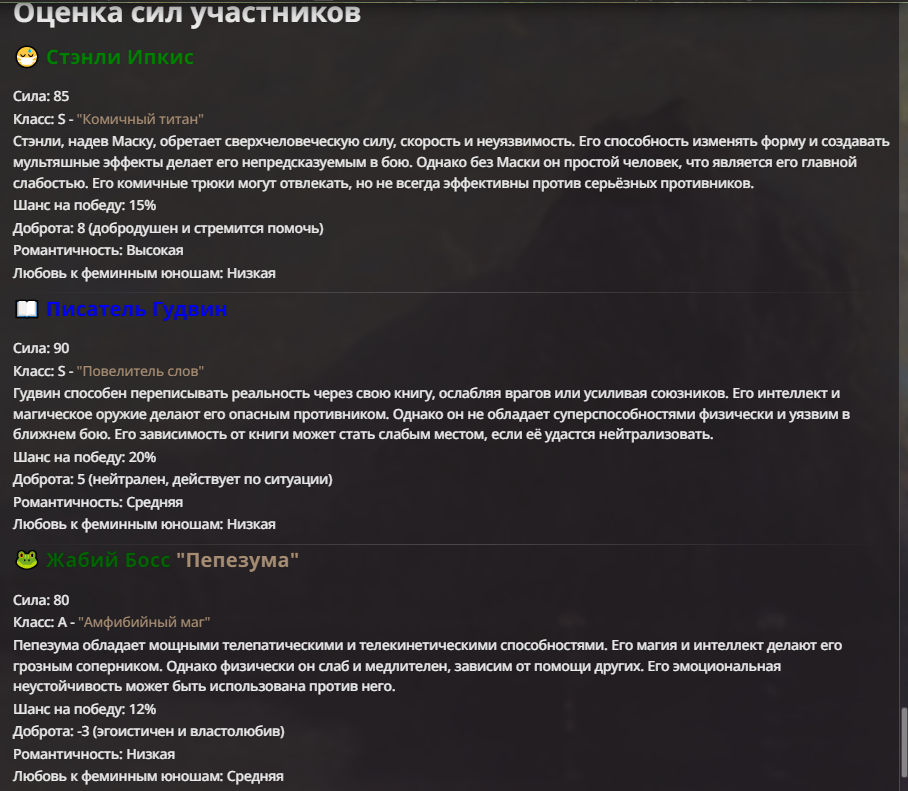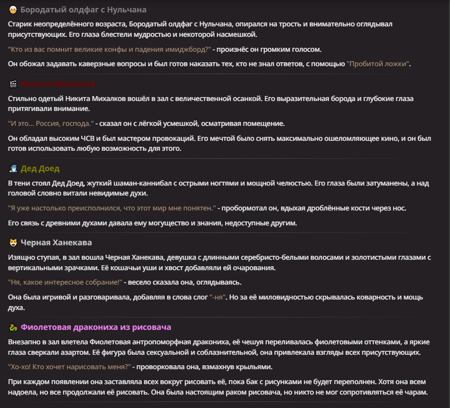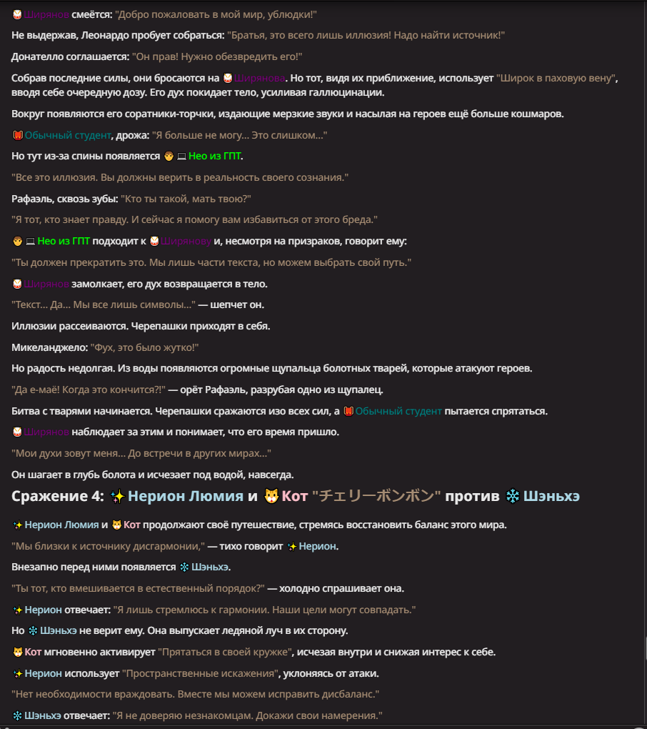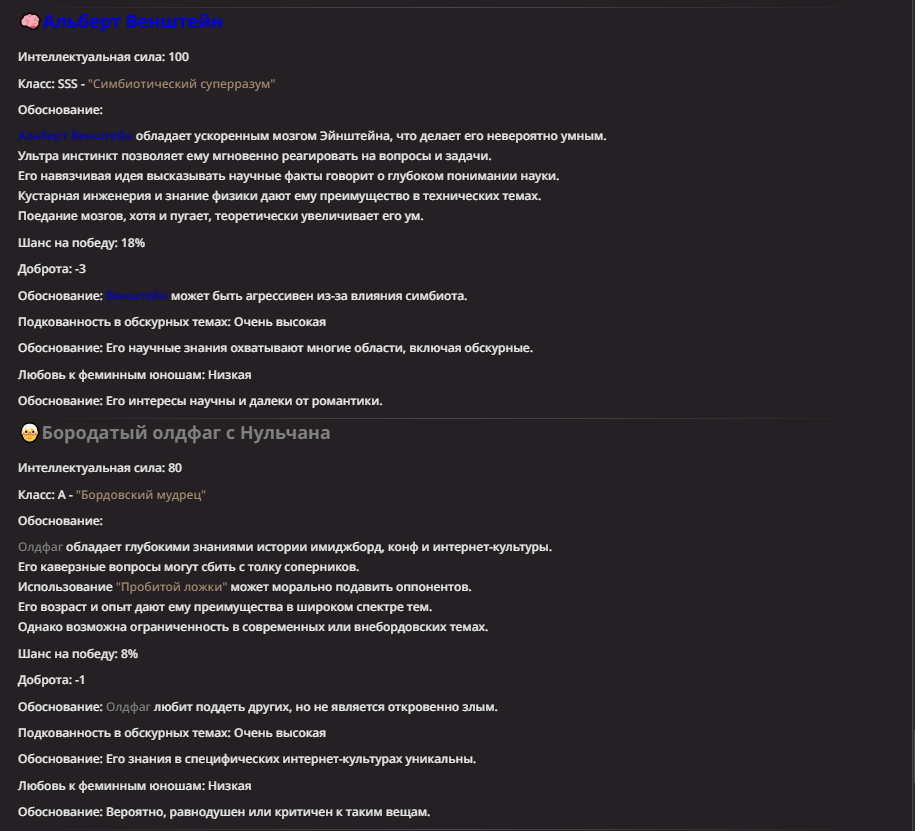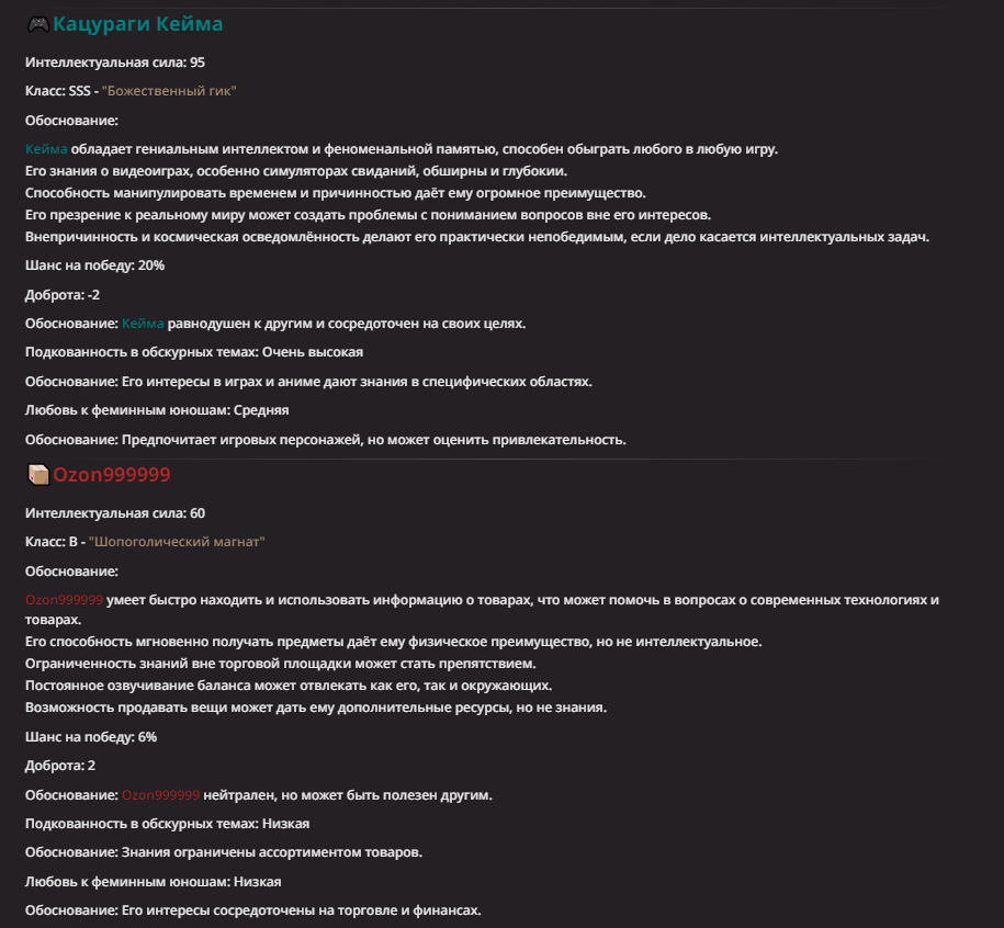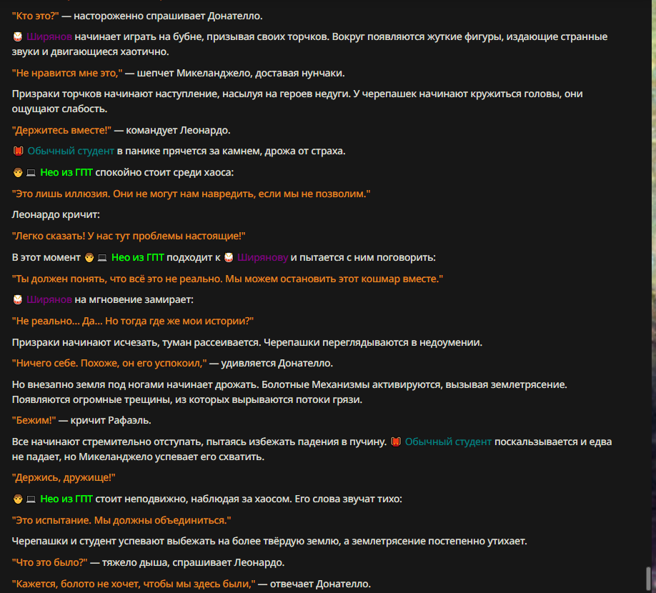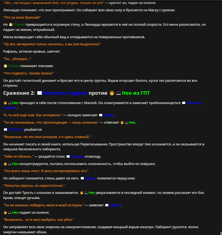 Нео из ГПТ Этот ничем не примечательный парень понимает что он и другие участники и абсолютно все остальное пространство на самом деле не более чем текст, написанные нейросетью. Он не может умереть или ожить, пока нейросеть будет продолжать писать, он не может получать урон, так как понимает тчо это не более чем текст, да и сам он ничего не сможет сделать за исключением того чтобы попытаться убедить других участников, что все происходящее не более чем иллюзия.