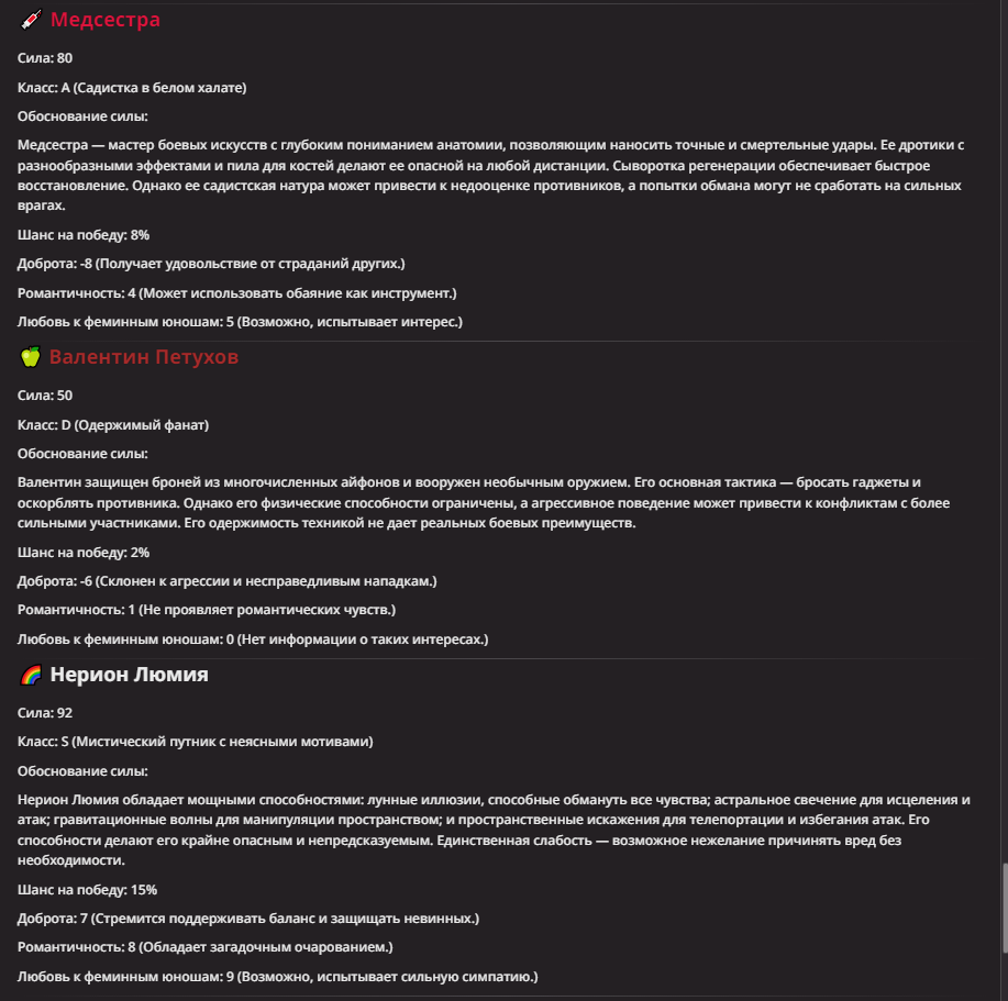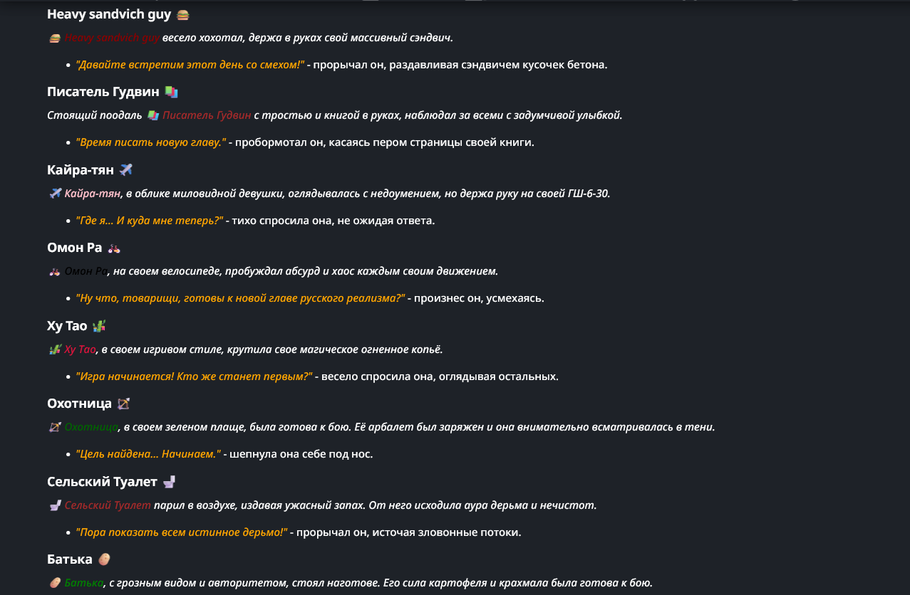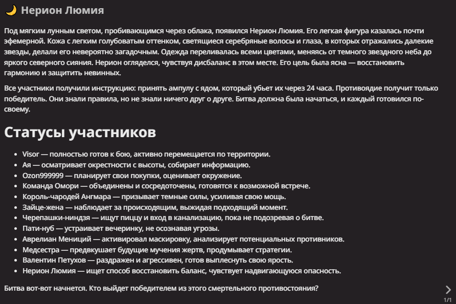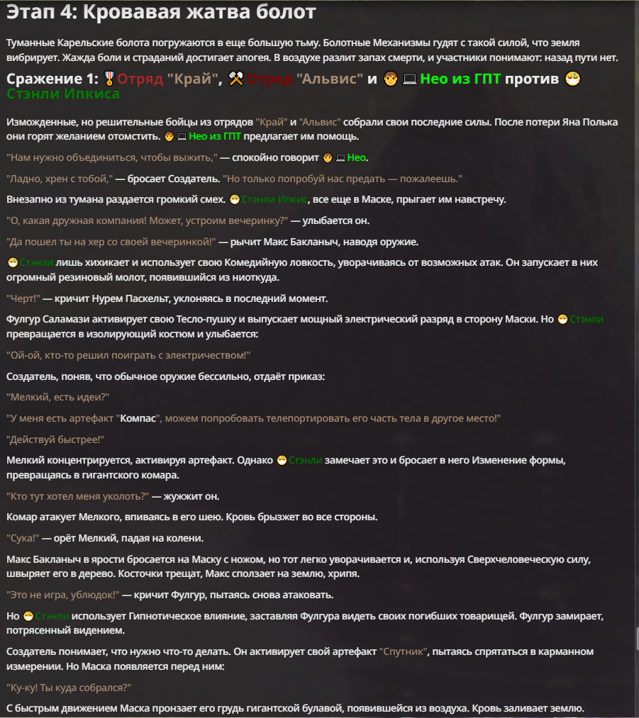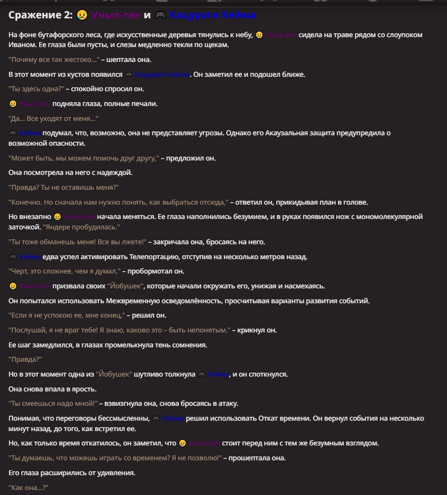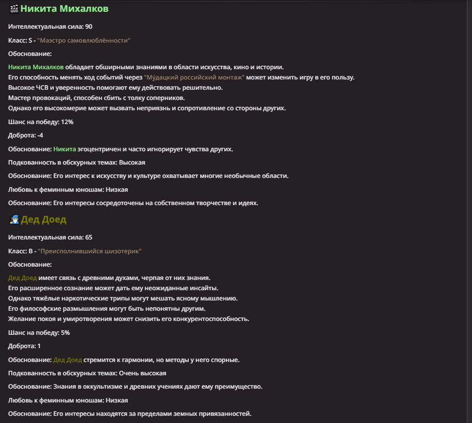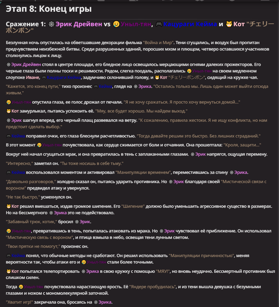 Нео из ГПТ Этот ничем не примечательный парень понимает что он и другие участники и абсолютно все остальное пространство на самом деле не более чем текст, написанные нейросетью. Он не может умереть или ожить, пока нейросеть будет продолжать писать, он не может получать урон, так как понимает тчо это не более чем текст, да и сам он ничего не сможет сделать за исключением того чтобы попытаться убедить других участников, что все происходящее не более чем иллюзия.