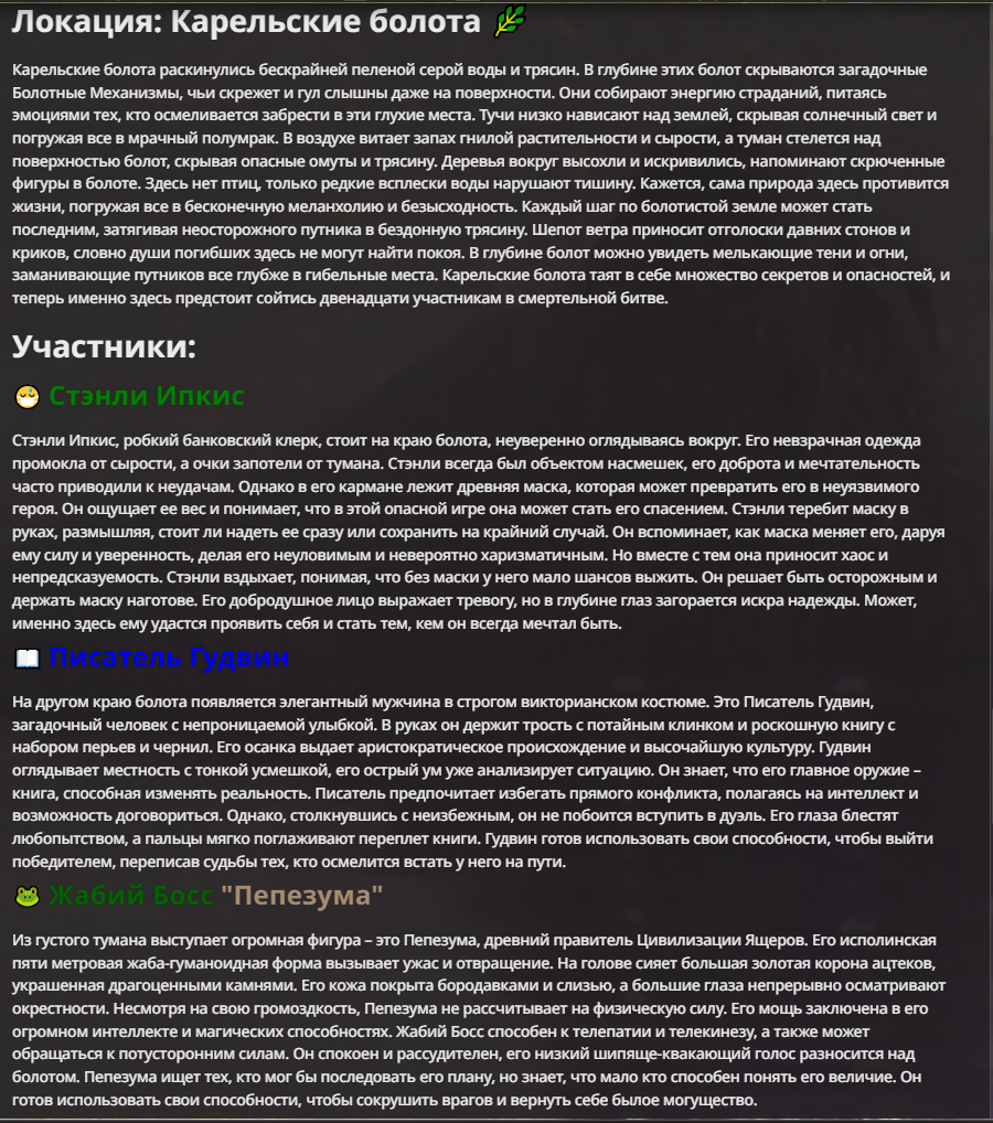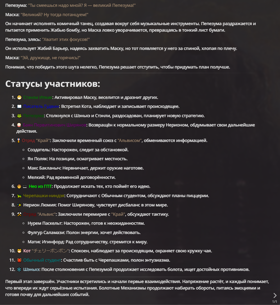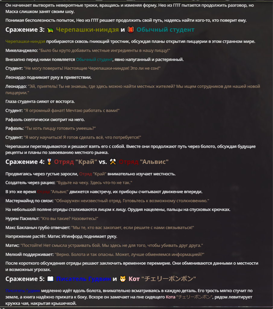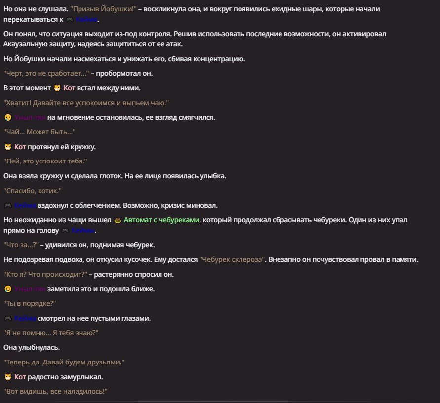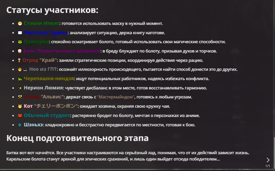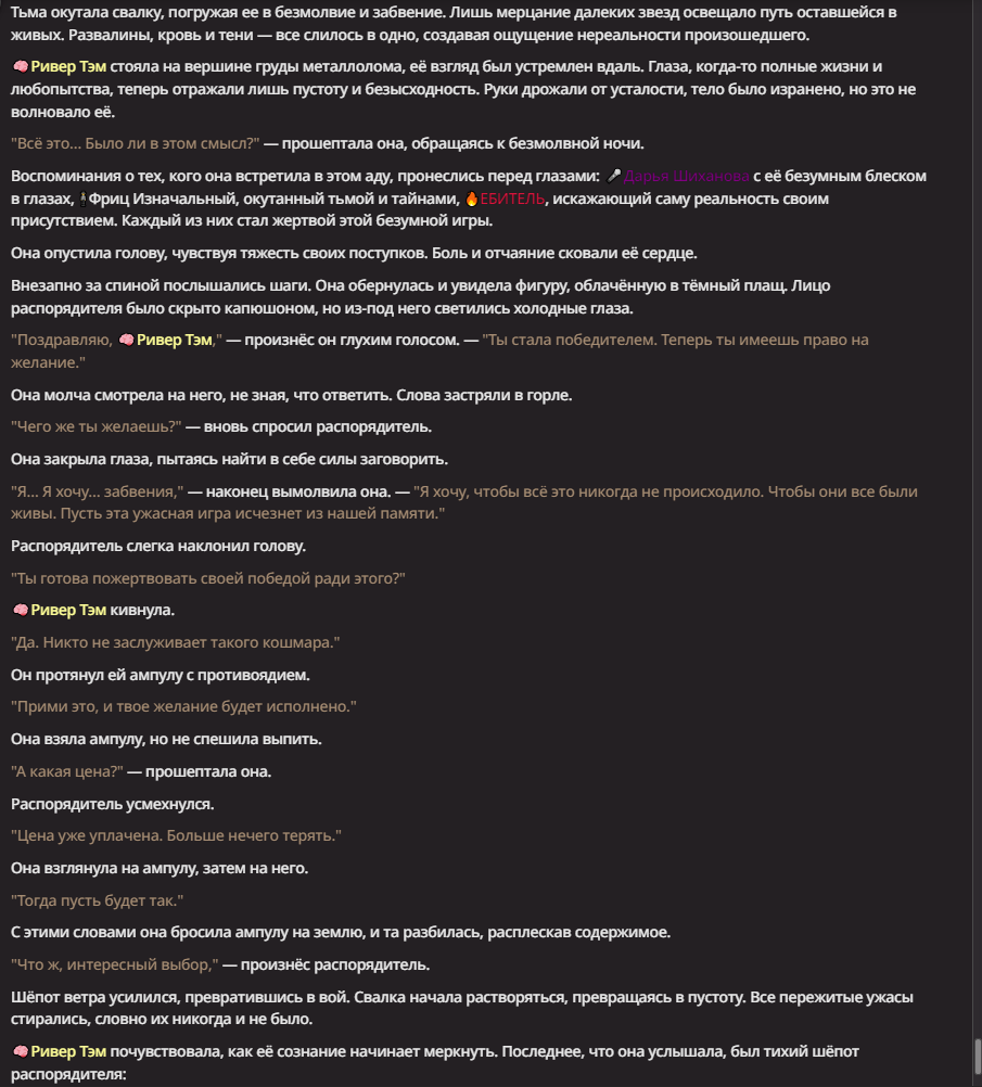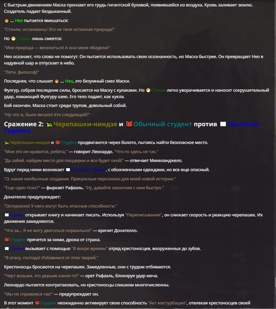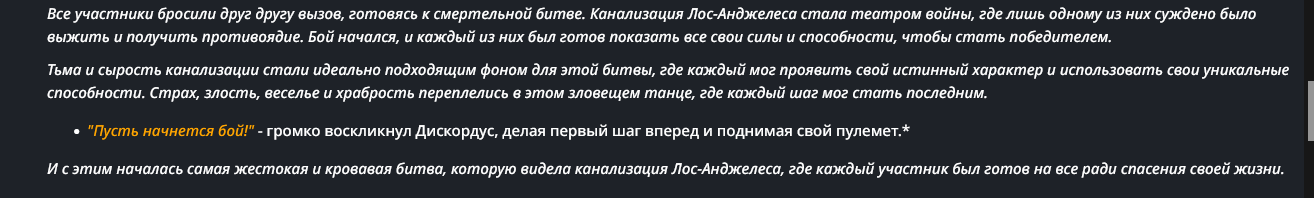 Нео из ГПТ Этот ничем не примечательный парень понимает что он и другие участники и абсолютно все остальное пространство на самом деле не более чем текст, написанные нейросетью. Он не может умереть или ожить, пока нейросеть будет продолжать писать, он не может получать урон, так как понимает тчо это не более чем текст, да и сам он ничего не сможет сделать за исключением того чтобы попытаться убедить других участников, что все происходящее не более чем иллюзия.