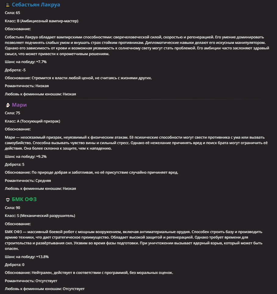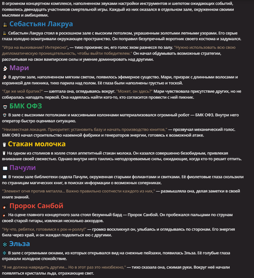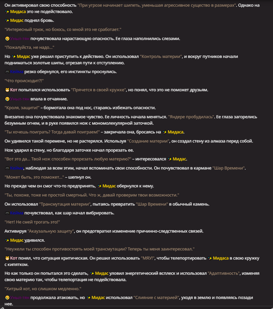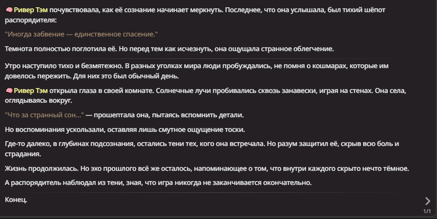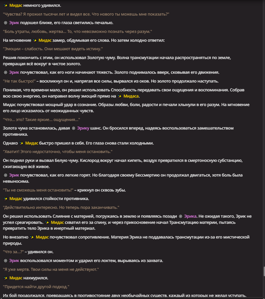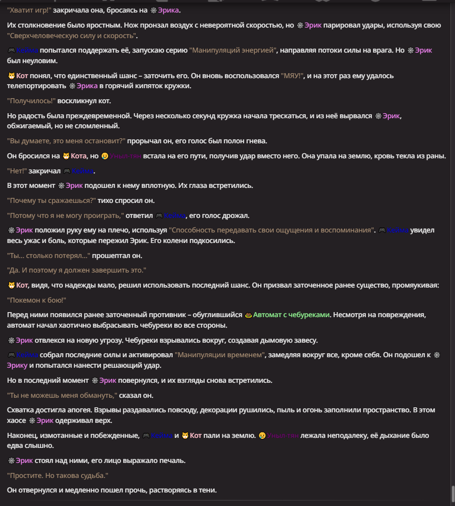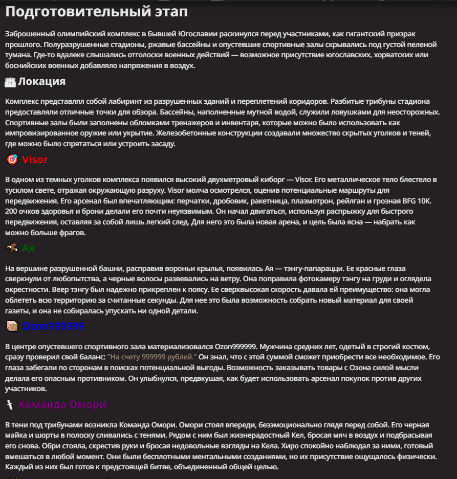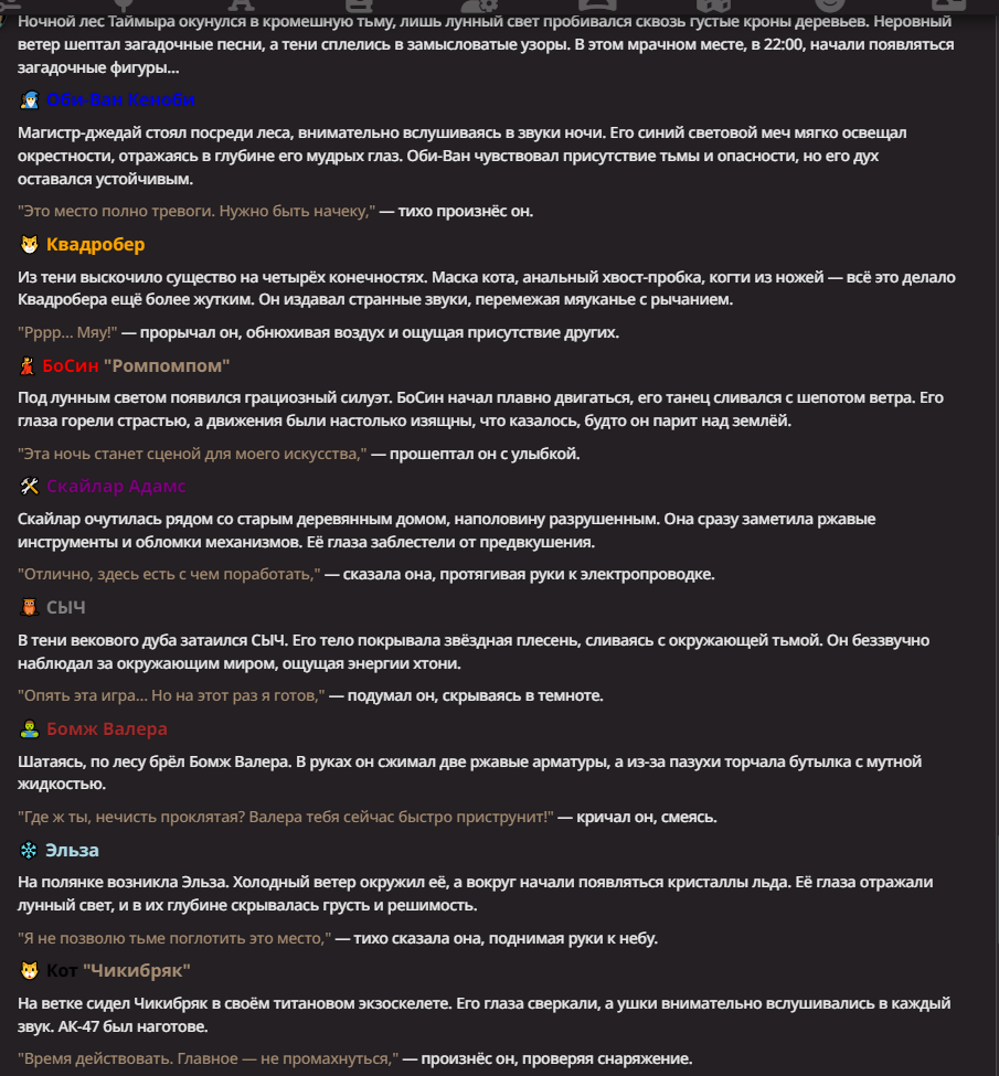 Нео из ГПТ Этот ничем не примечательный парень понимает что он и другие участники и абсолютно все остальное пространство на самом деле не более чем текст, написанные нейросетью. Он не может умереть или ожить, пока нейросеть будет продолжать писать, он не может получать урон, так как понимает тчо это не более чем текст, да и сам он ничего не сможет сделать за исключением того чтобы попытаться убедить других участников, что все происходящее не более чем иллюзия.