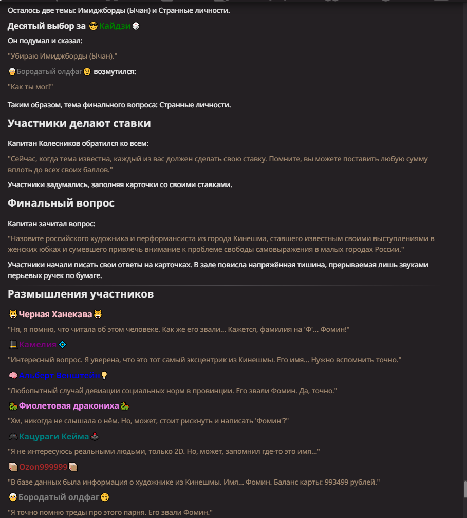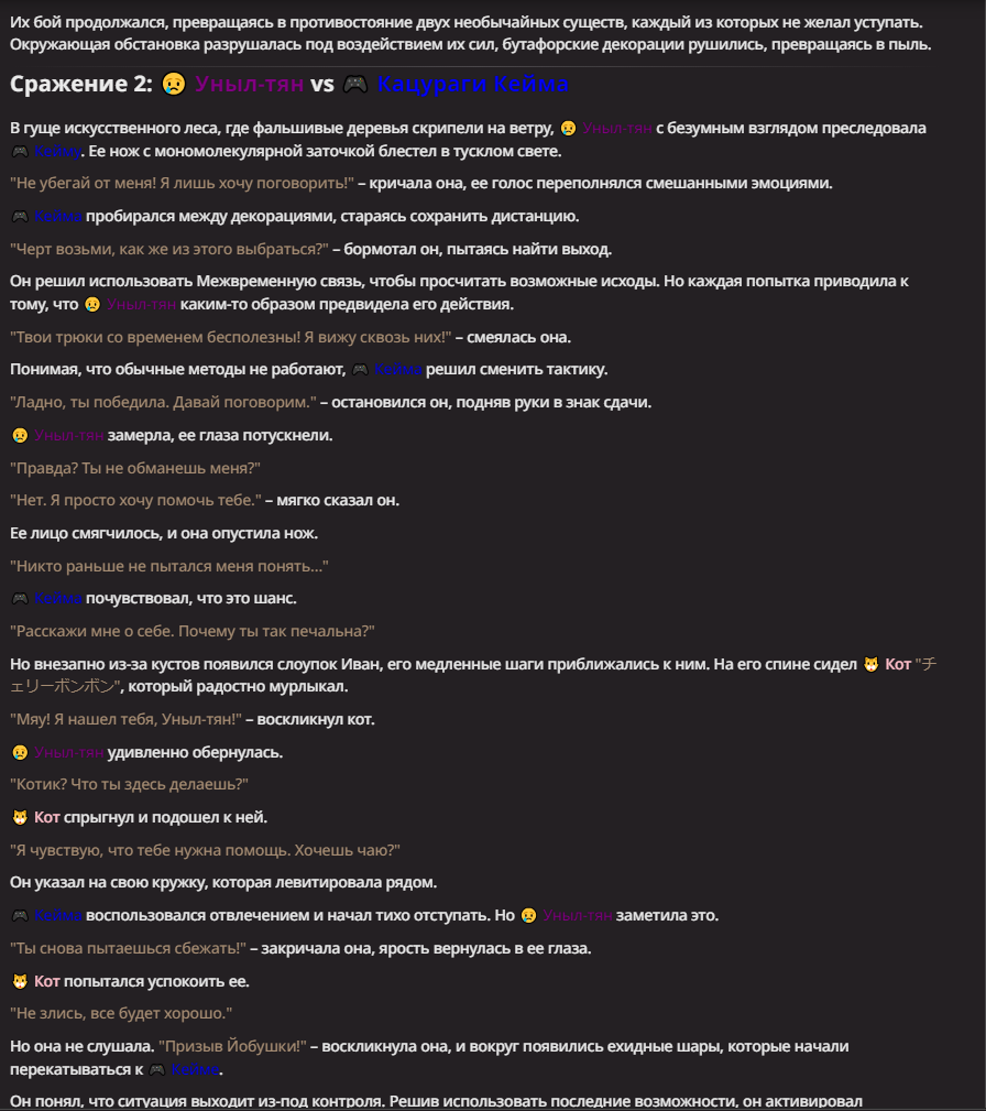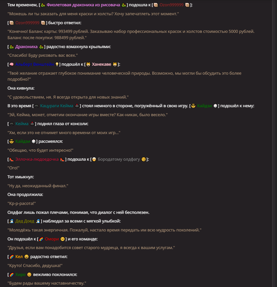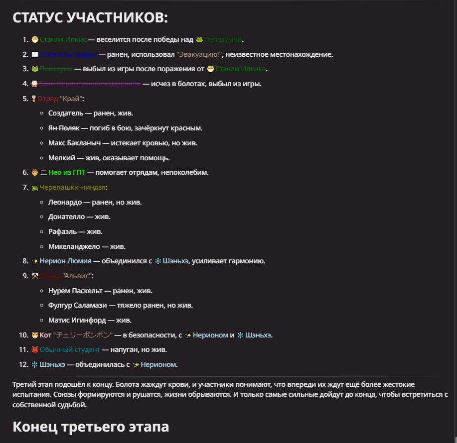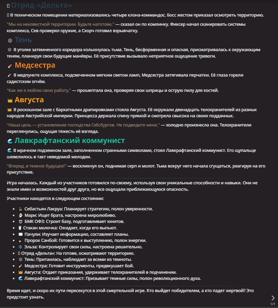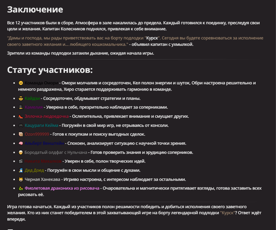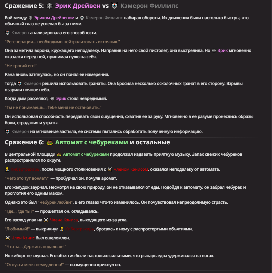 Нео из ГПТ Этот ничем не примечательный парень понимает что он и другие участники и абсолютно все остальное пространство на самом деле не более чем текст, написанные нейросетью. Он не может умереть или ожить, пока нейросеть будет продолжать писать, он не может получать урон, так как понимает тчо это не более чем текст, да и сам он ничего не сможет сделать за исключением того чтобы попытаться убедить других участников, что все происходящее не более чем иллюзия.