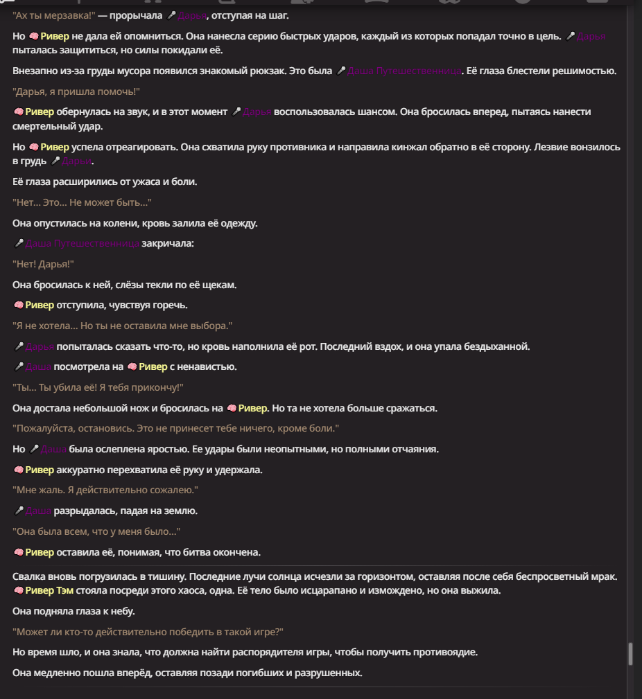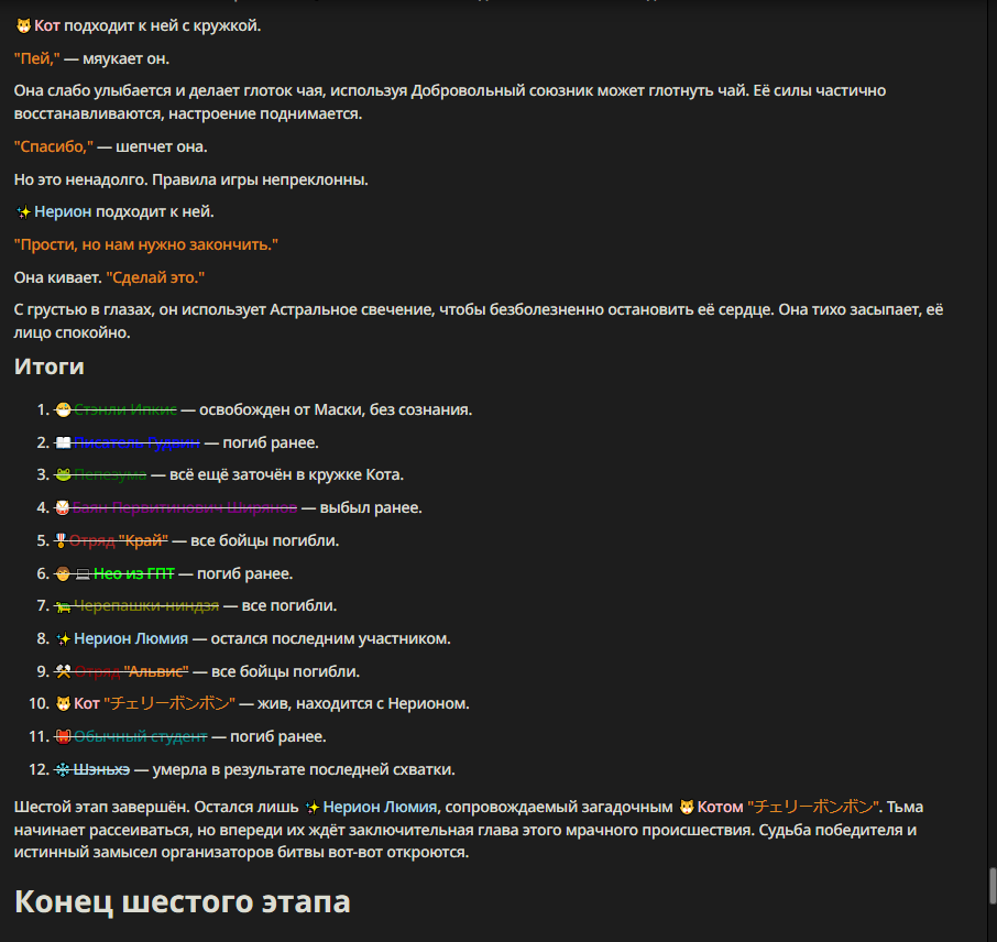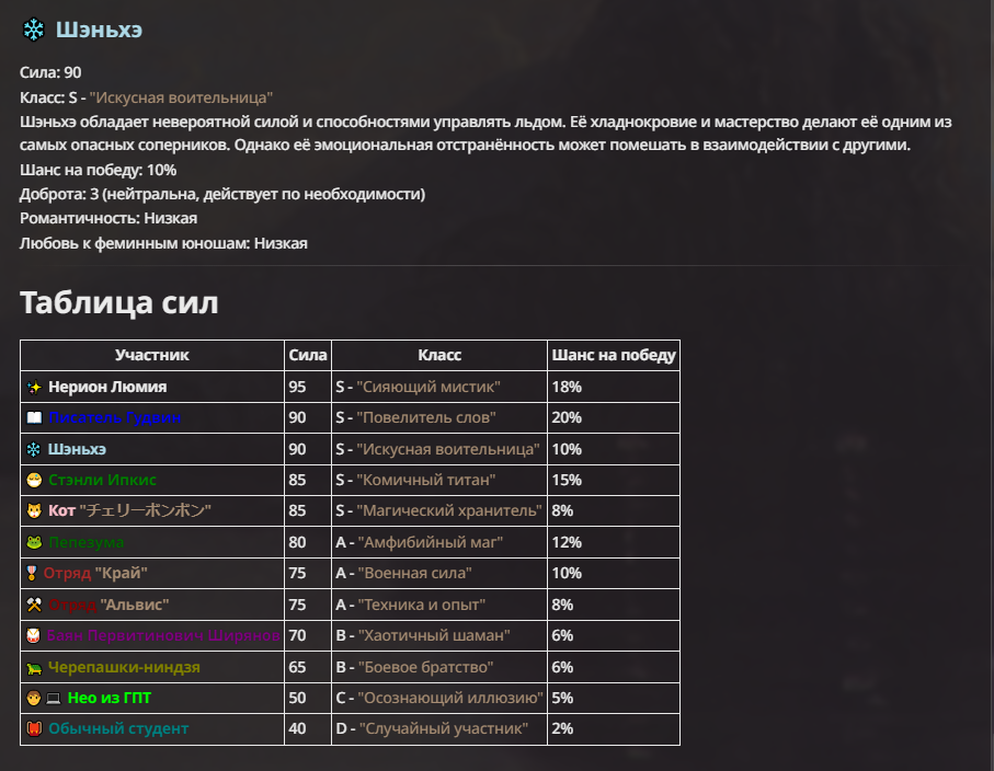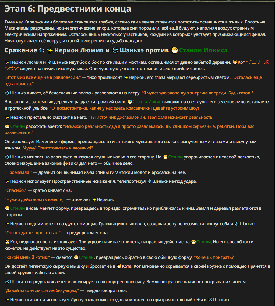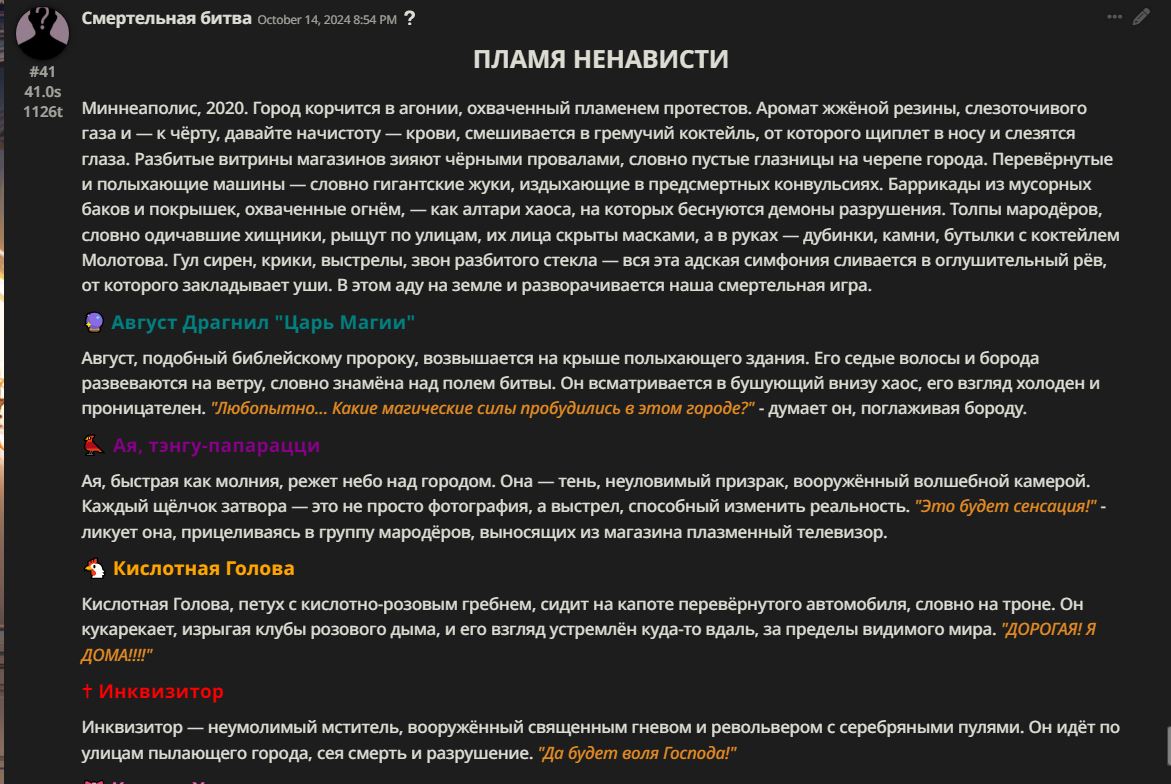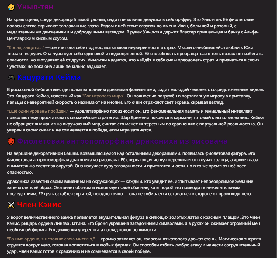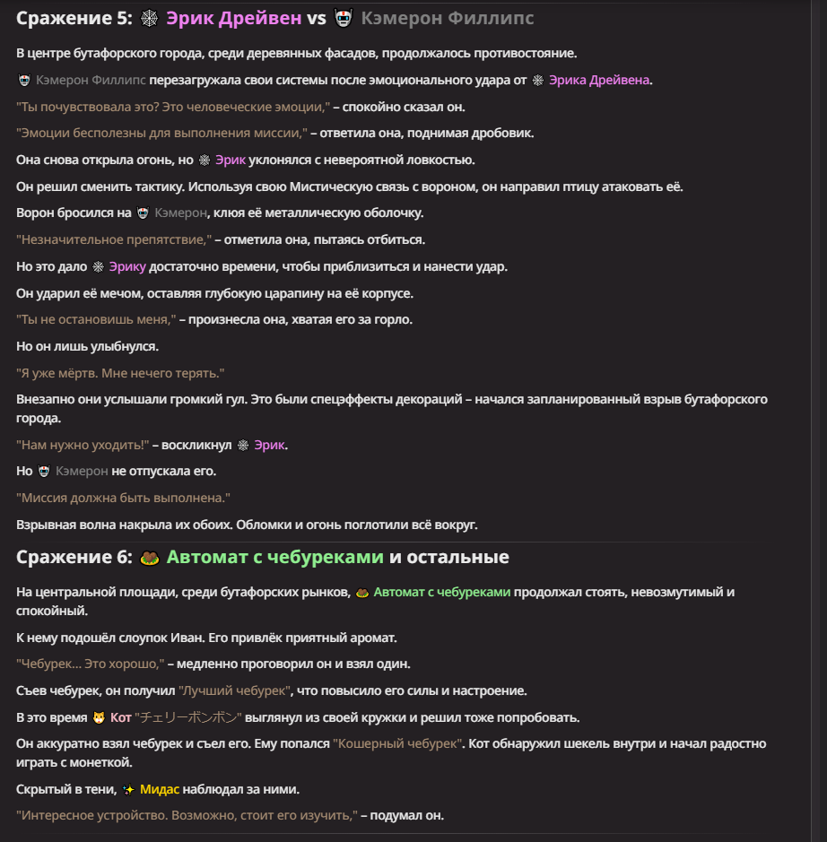 Нео из ГПТ Этот ничем не примечательный парень понимает что он и другие участники и абсолютно все остальное пространство на самом деле не более чем текст, написанные нейросетью. Он не может умереть или ожить, пока нейросеть будет продолжать писать, он не может получать урон, так как понимает тчо это не более чем текст, да и сам он ничего не сможет сделать за исключением того чтобы попытаться убедить других участников, что все происходящее не более чем иллюзия.