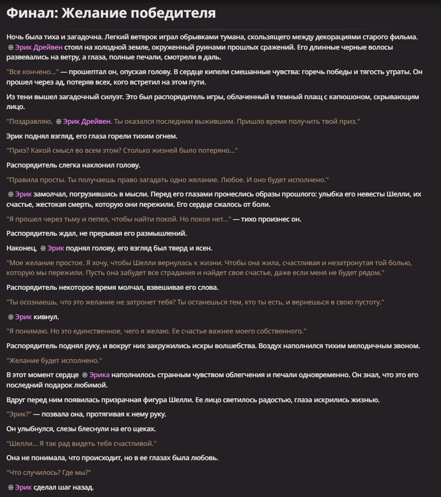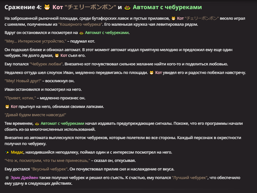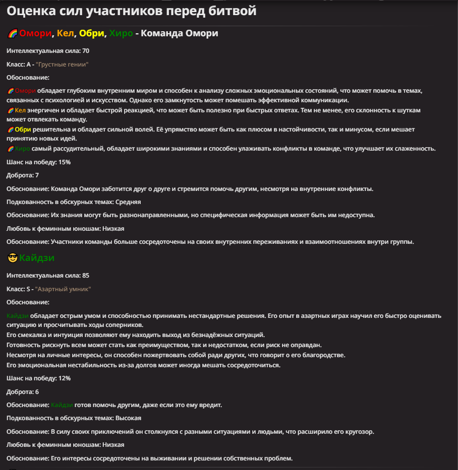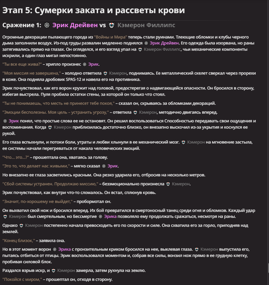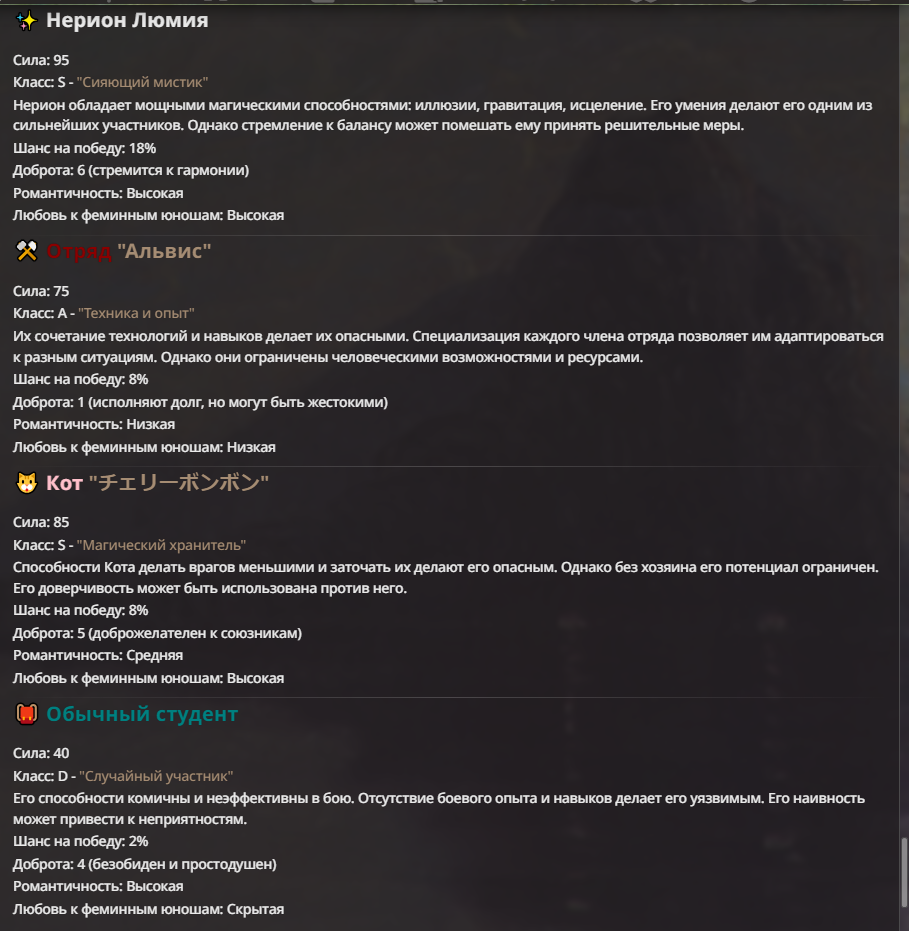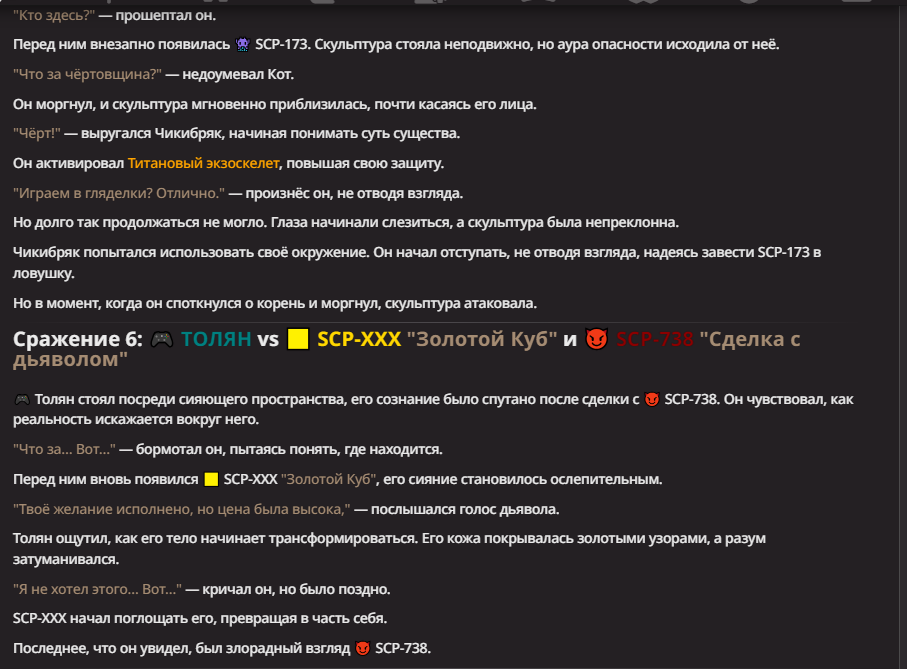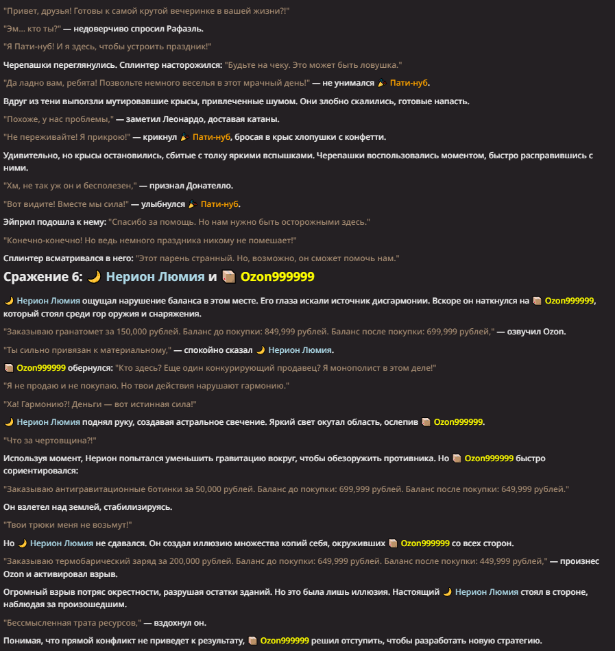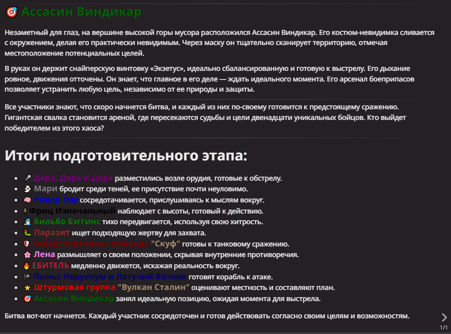 Нео из ГПТ Этот ничем не примечательный парень понимает что он и другие участники и абсолютно все остальное пространство на самом деле не более чем текст, написанные нейросетью. Он не может умереть или ожить, пока нейросеть будет продолжать писать, он не может получать урон, так как понимает тчо это не более чем текст, да и сам он ничего не сможет сделать за исключением того чтобы попытаться убедить других участников, что все происходящее не более чем иллюзия.