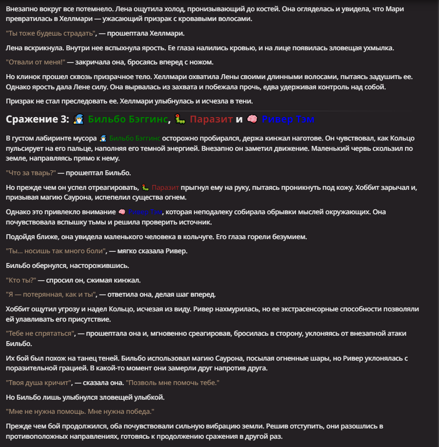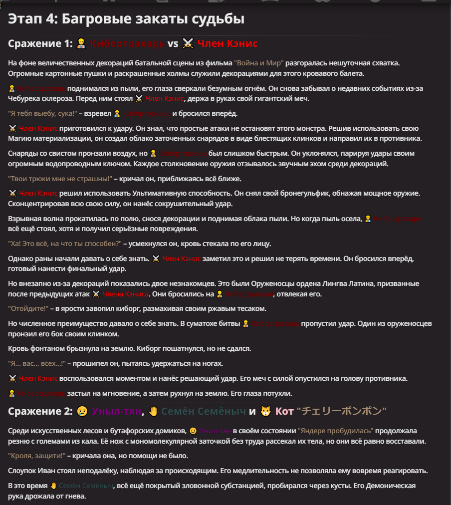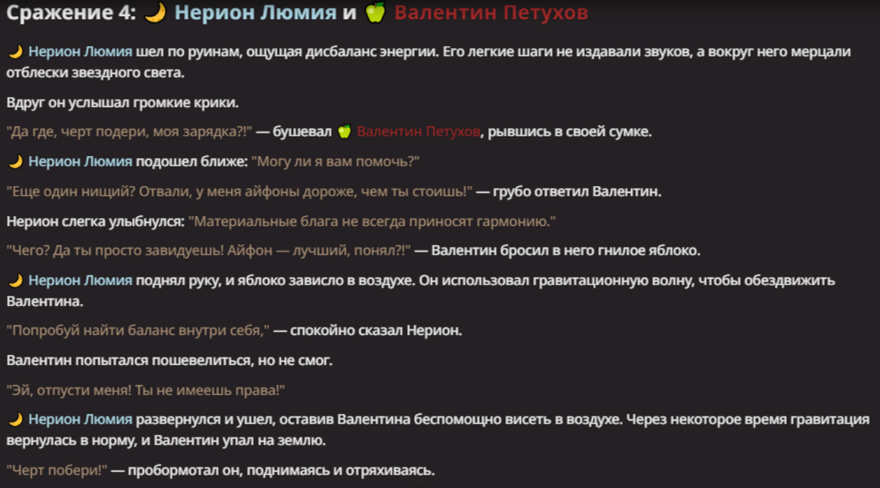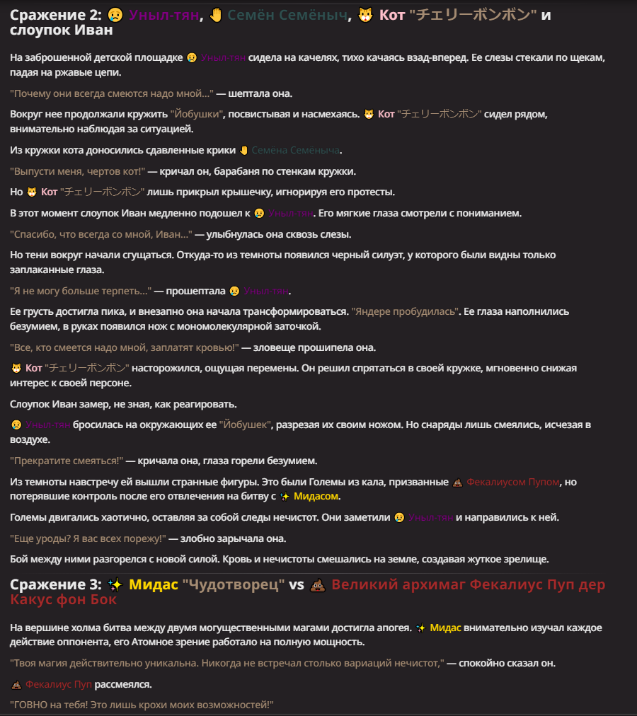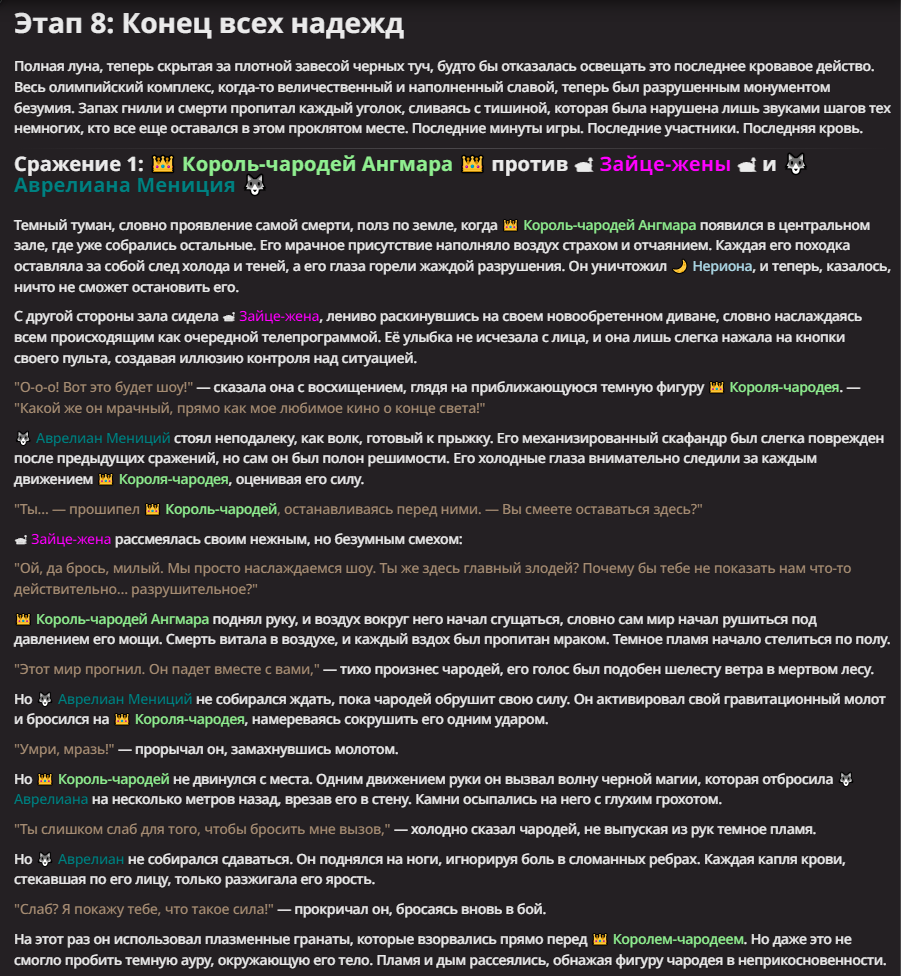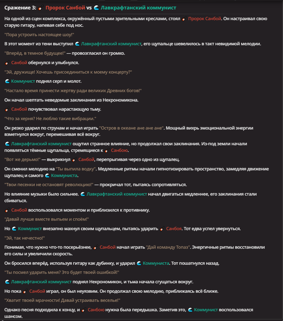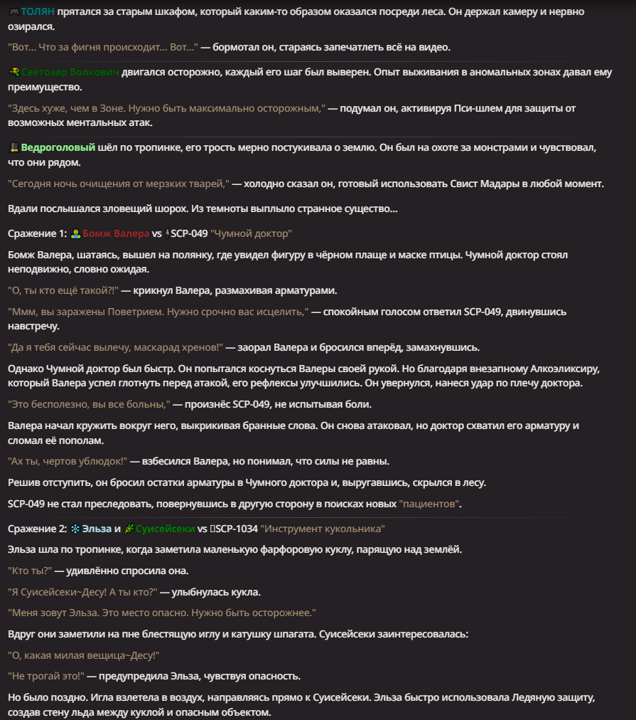 Нео из ГПТ Этот ничем не примечательный парень понимает что он и другие участники и абсолютно все остальное пространство на самом деле не более чем текст, написанные нейросетью. Он не может умереть или ожить, пока нейросеть будет продолжать писать, он не может получать урон, так как понимает тчо это не более чем текст, да и сам он ничего не сможет сделать за исключением того чтобы попытаться убедить других участников, что все происходящее не более чем иллюзия.
