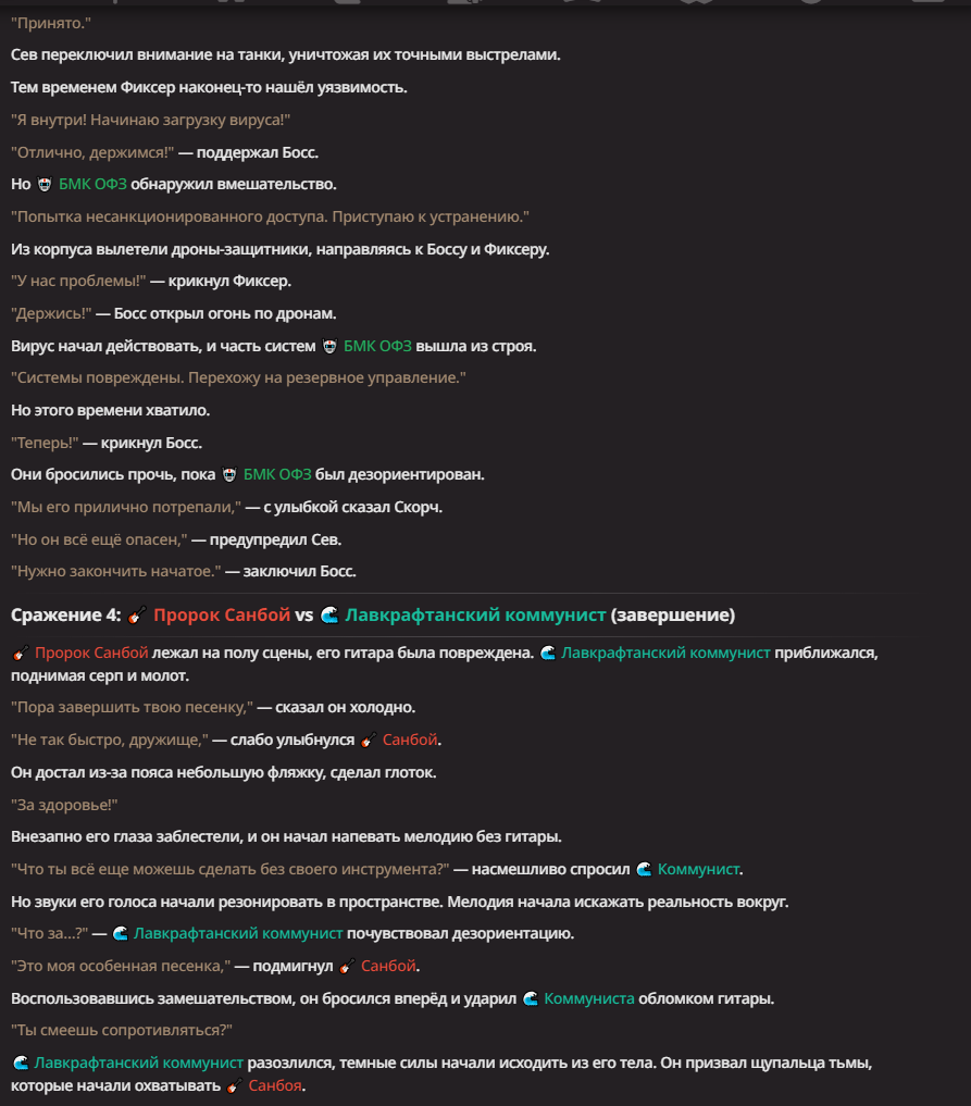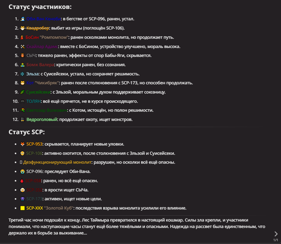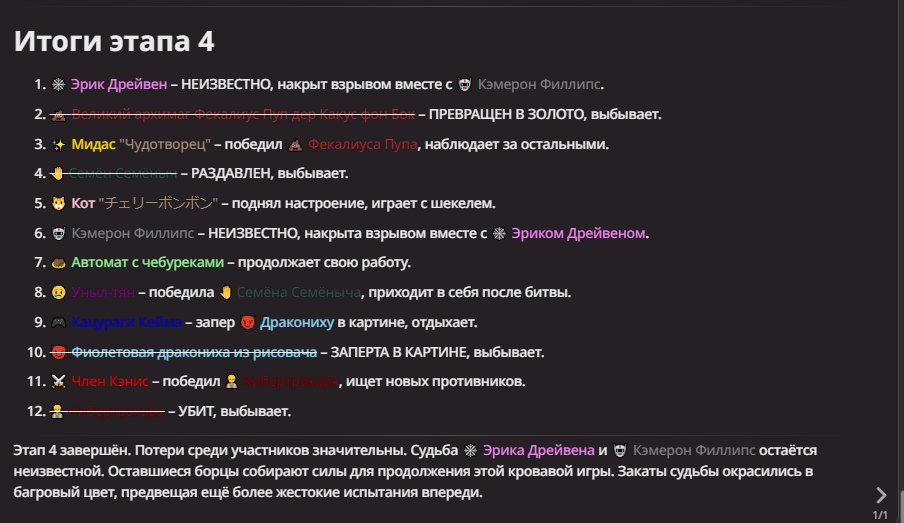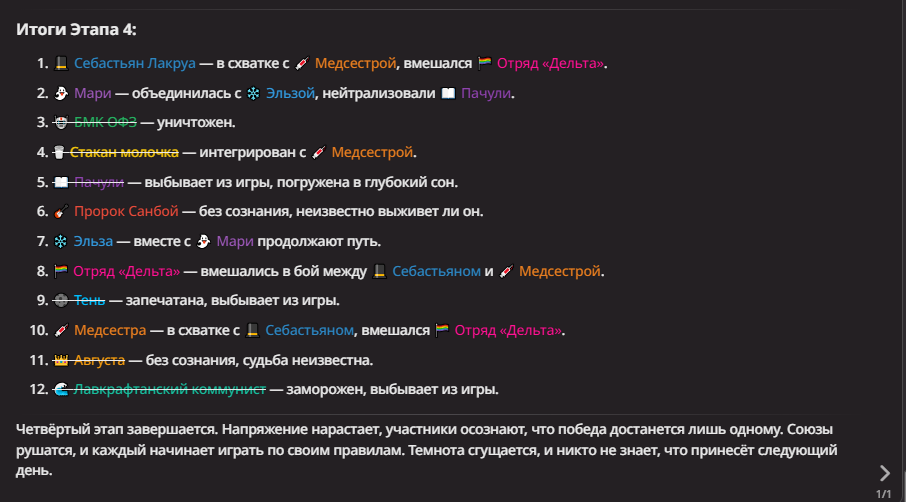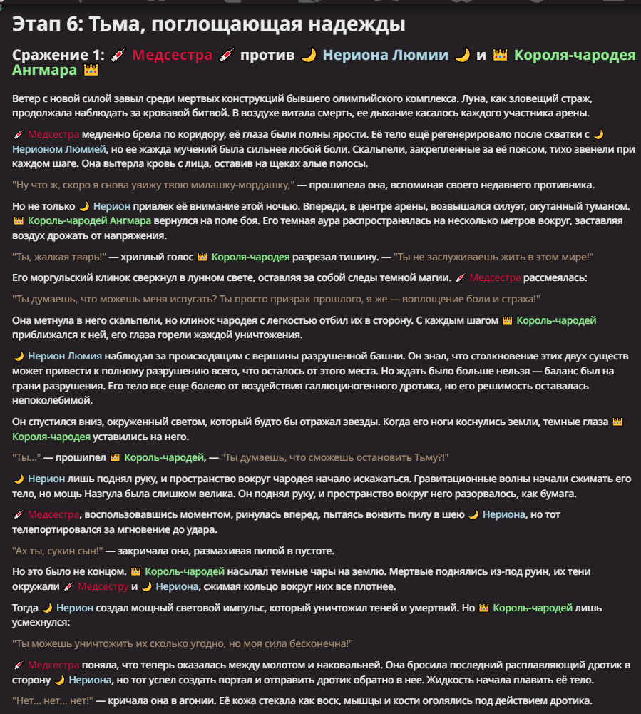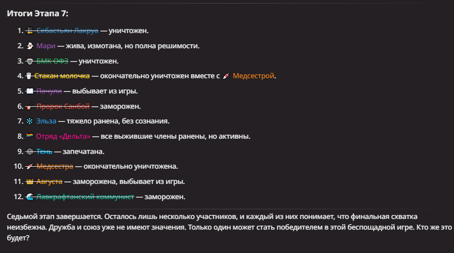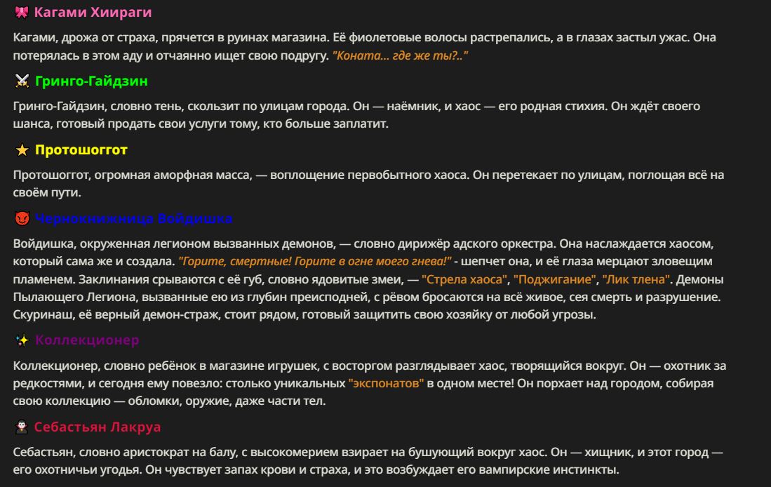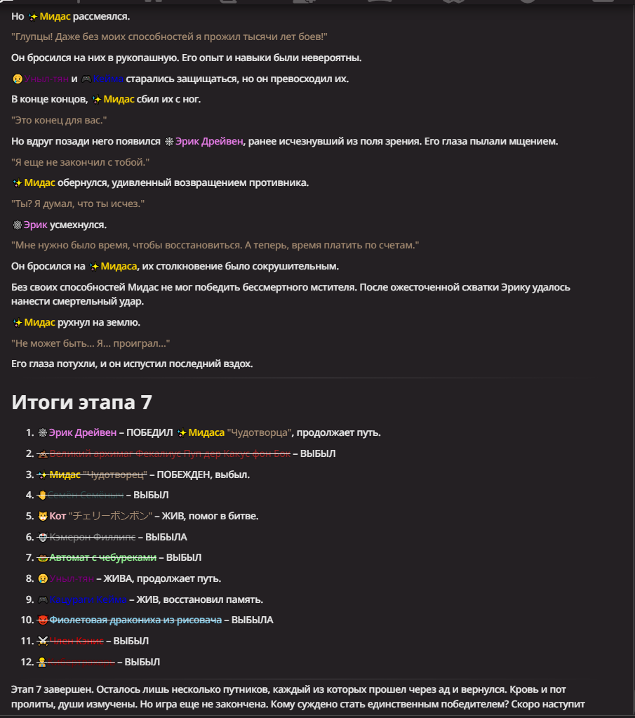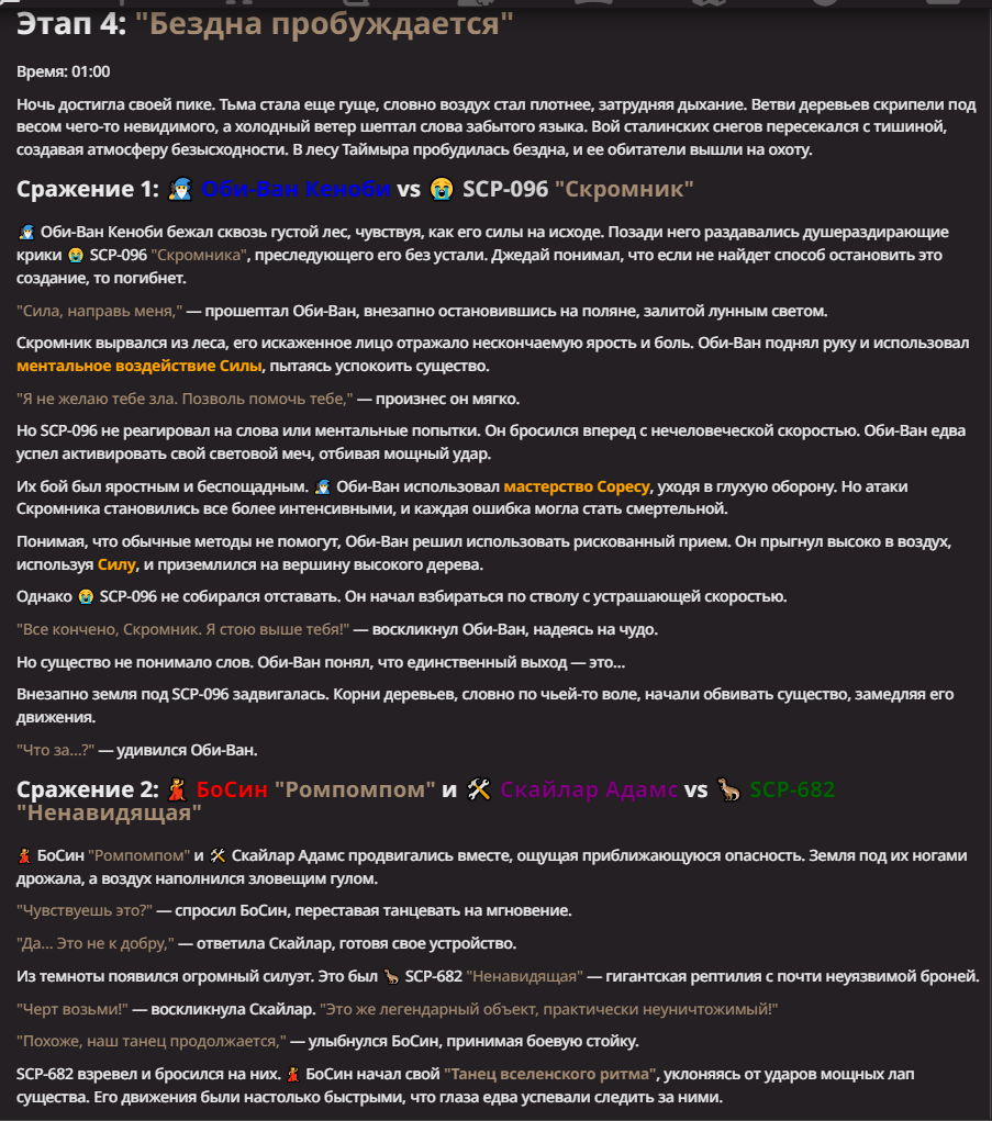 Нео из ГПТ Этот ничем не примечательный парень понимает что он и другие участники и абсолютно все остальное пространство на самом деле не более чем текст, написанные нейросетью. Он не может умереть или ожить, пока нейросеть будет продолжать писать, он не может получать урон, так как понимает тчо это не более чем текст, да и сам он ничего не сможет сделать за исключением того чтобы попытаться убедить других участников, что все происходящее не более чем иллюзия.