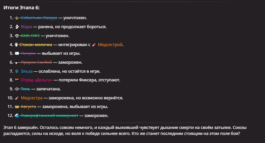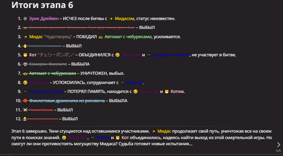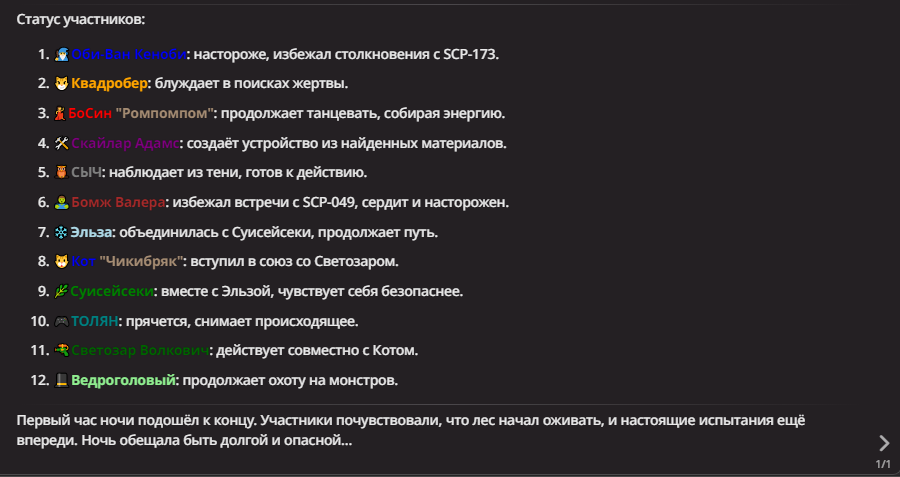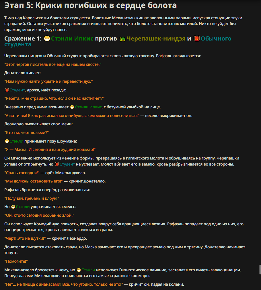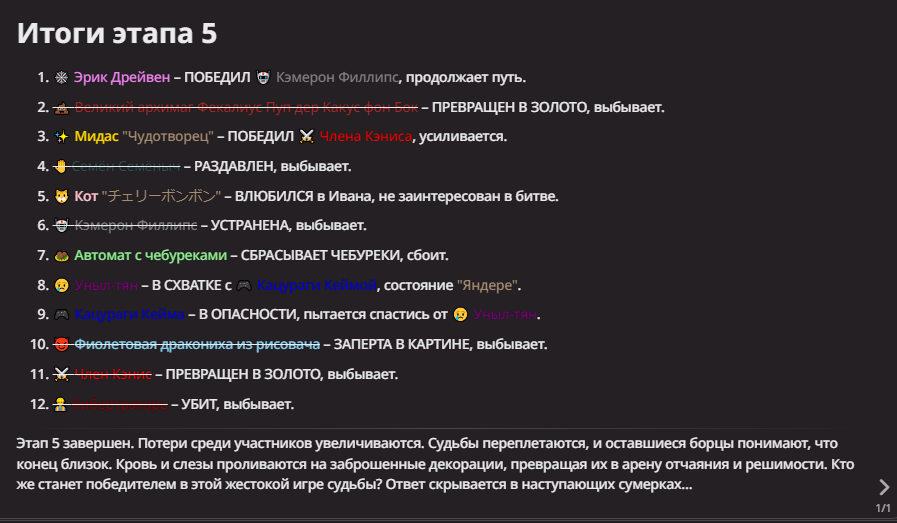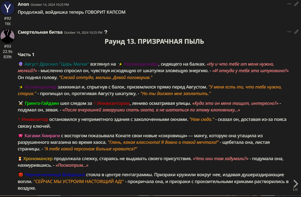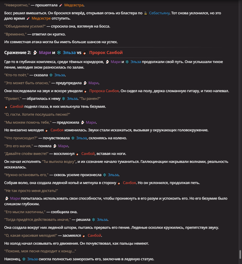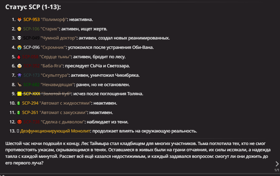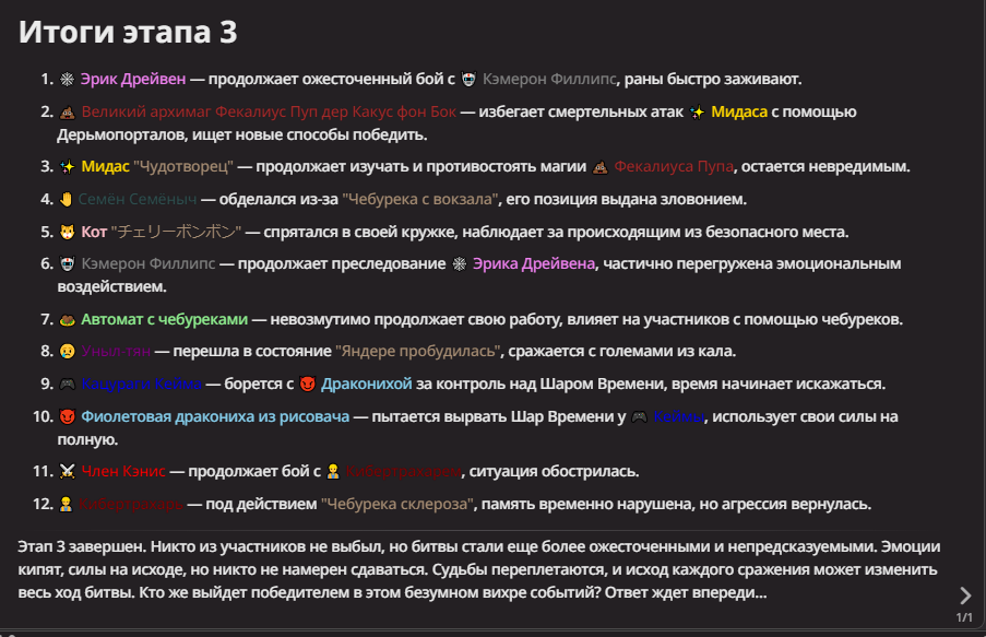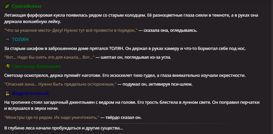 Нео из ГПТ Этот ничем не примечательный парень понимает что он и другие участники и абсолютно все остальное пространство на самом деле не более чем текст, написанные нейросетью. Он не может умереть или ожить, пока нейросеть будет продолжать писать, он не может получать урон, так как понимает тчо это не более чем текст, да и сам он ничего не сможет сделать за исключением того чтобы попытаться убедить других участников, что все происходящее не более чем иллюзия.
