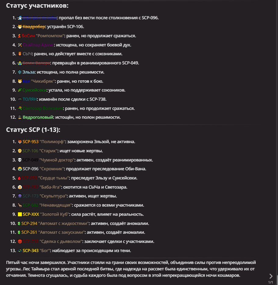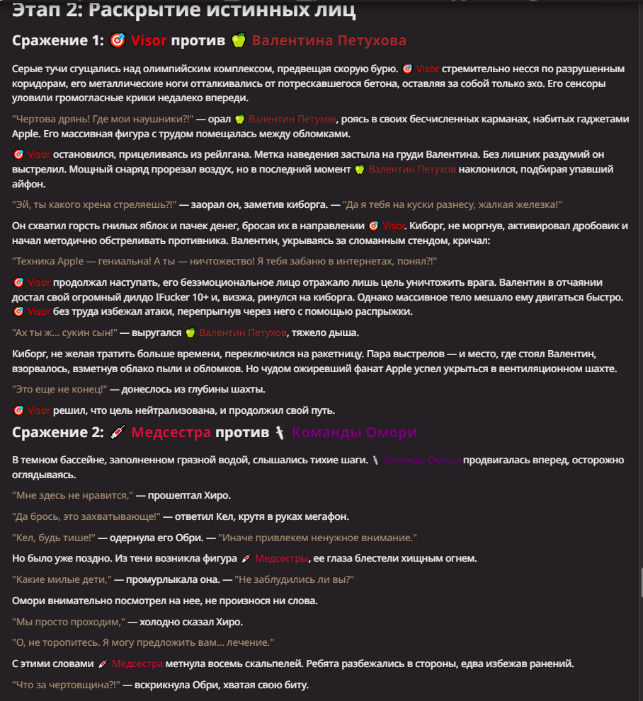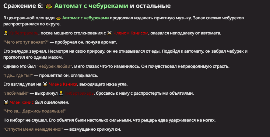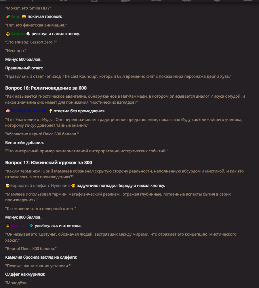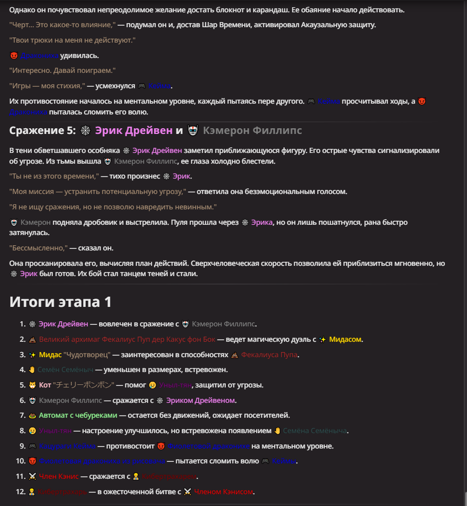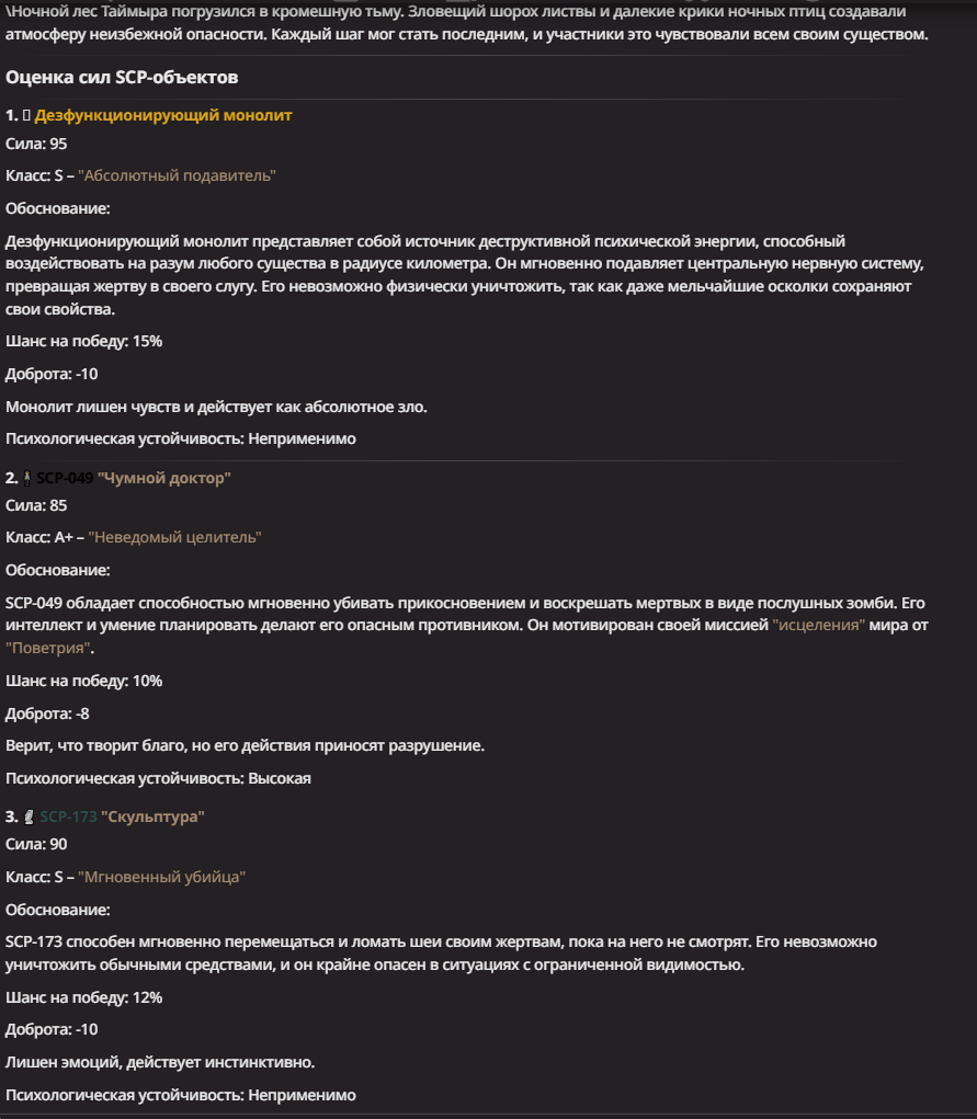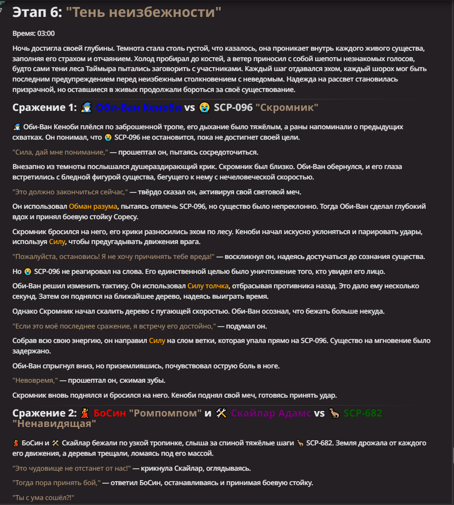 Нео из ГПТ Этот ничем не примечательный парень понимает что он и другие участники и абсолютно все остальное пространство на самом деле не более чем текст, написанные нейросетью. Он не может умереть или ожить, пока нейросеть будет продолжать писать, он не может получать урон, так как понимает тчо это не более чем текст, да и сам он ничего не сможет сделать за исключением того чтобы попытаться убедить других участников, что все происходящее не более чем иллюзия.