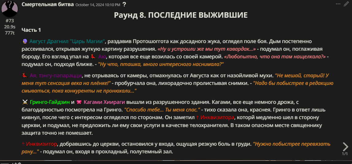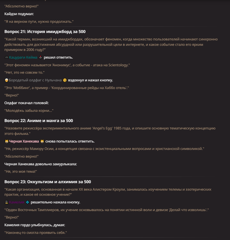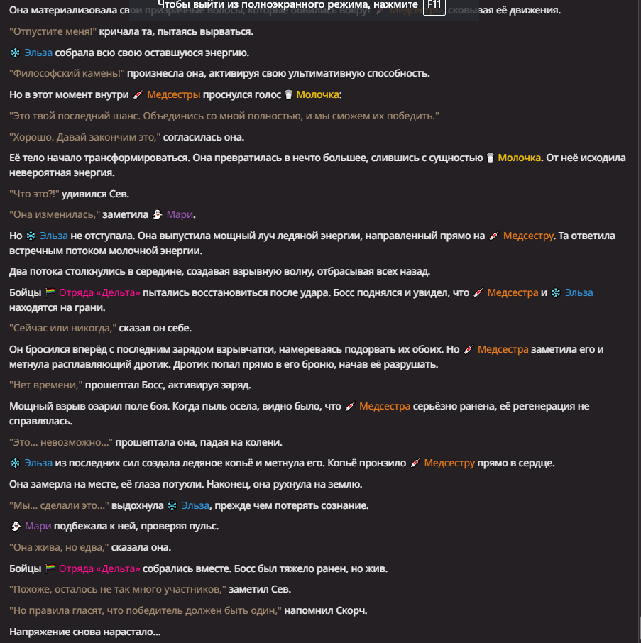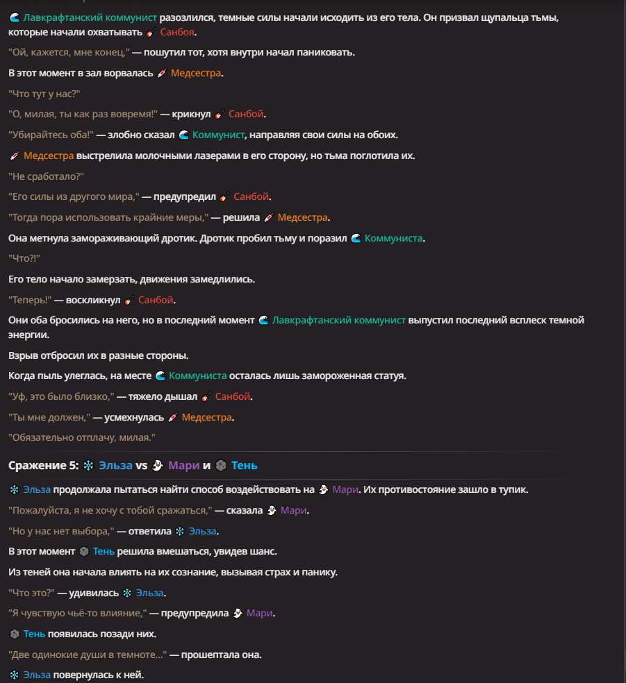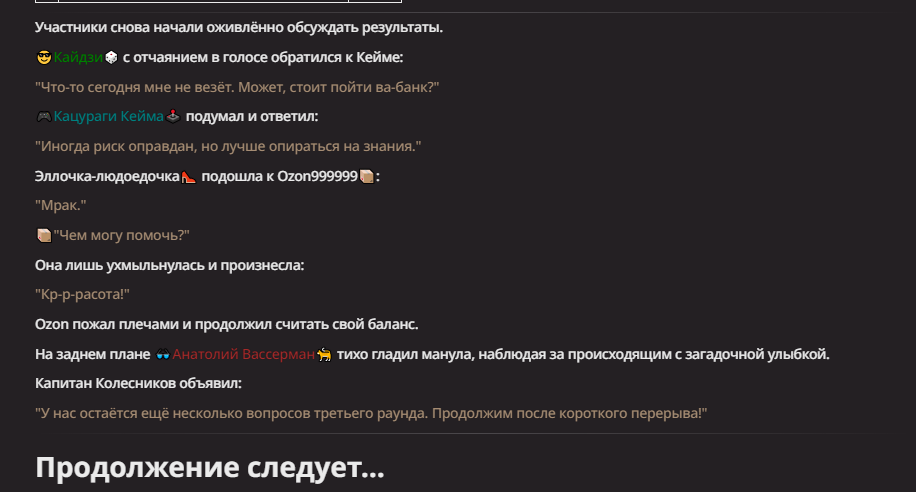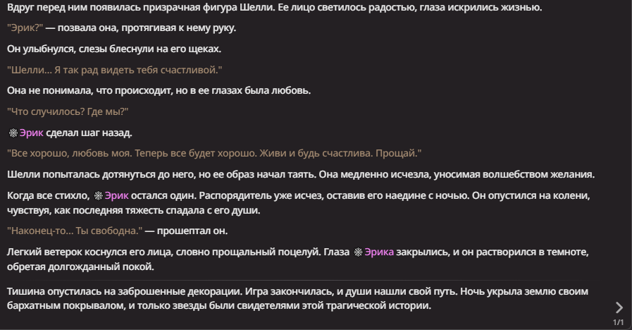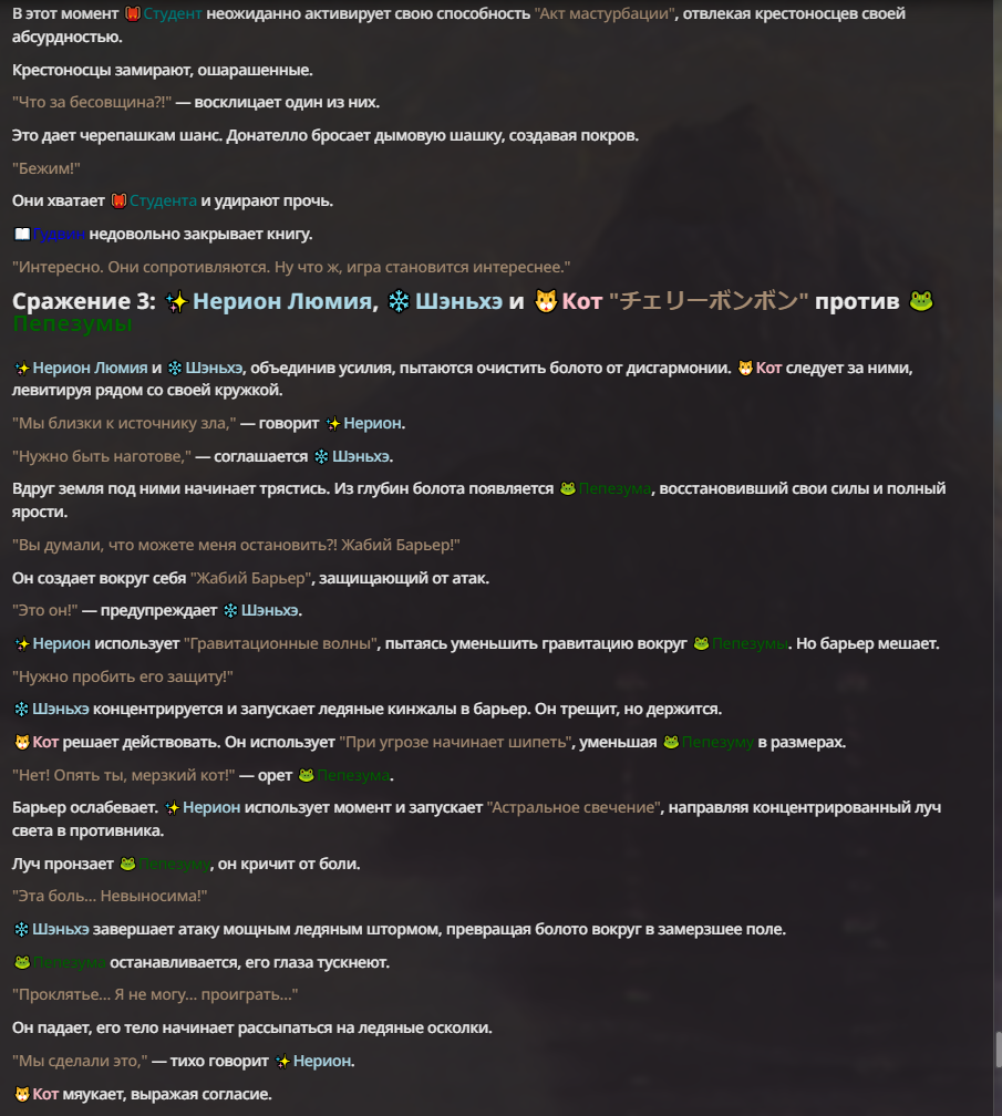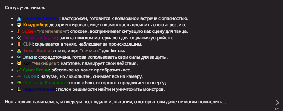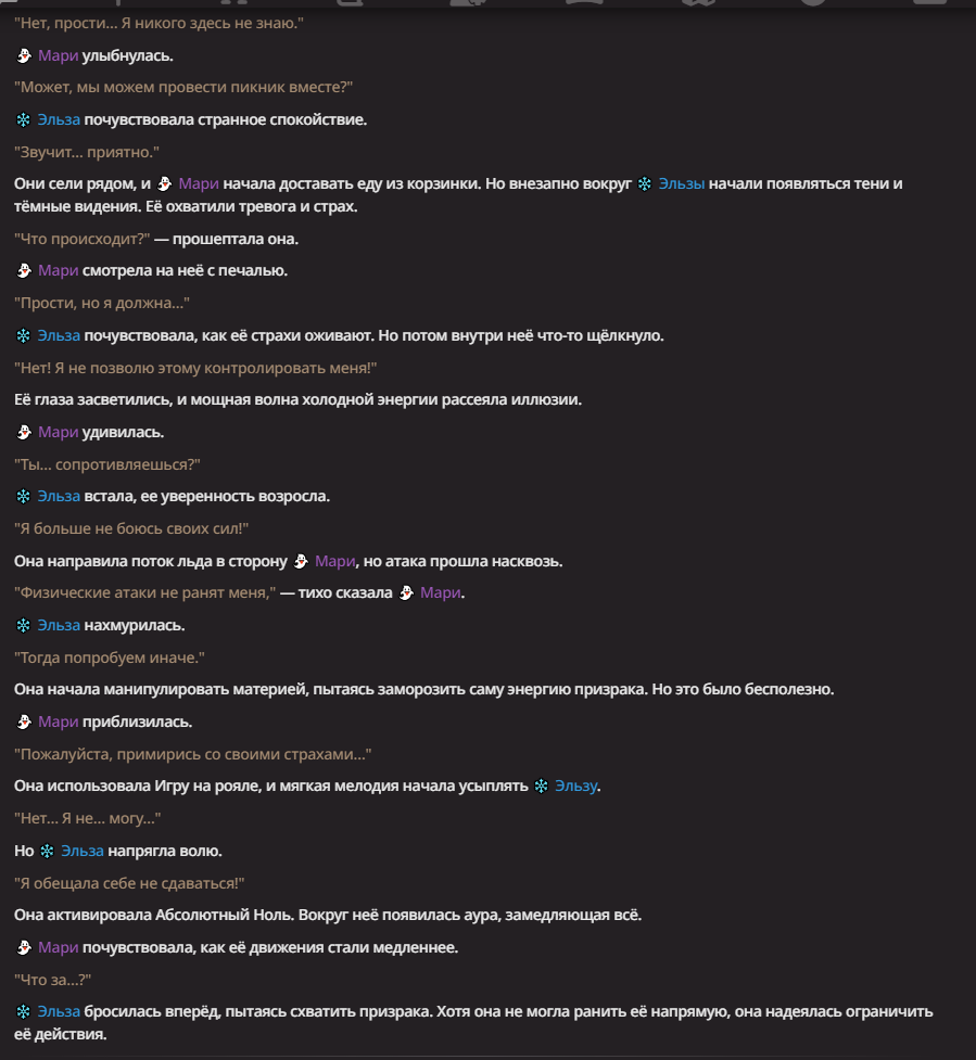 Нео из ГПТ Этот ничем не примечательный парень понимает что он и другие участники и абсолютно все остальное пространство на самом деле не более чем текст, написанные нейросетью. Он не может умереть или ожить, пока нейросеть будет продолжать писать, он не может получать урон, так как понимает тчо это не более чем текст, да и сам он ничего не сможет сделать за исключением того чтобы попытаться убедить других участников, что все происходящее не более чем иллюзия.