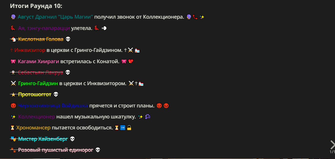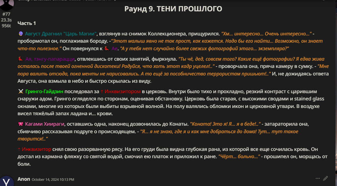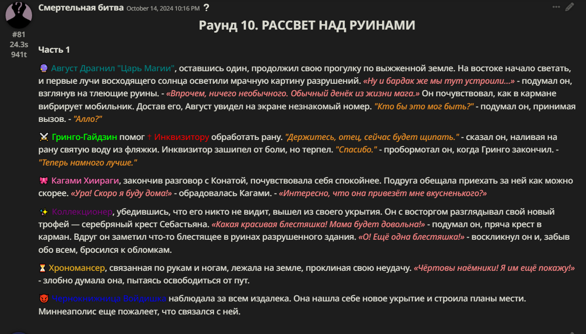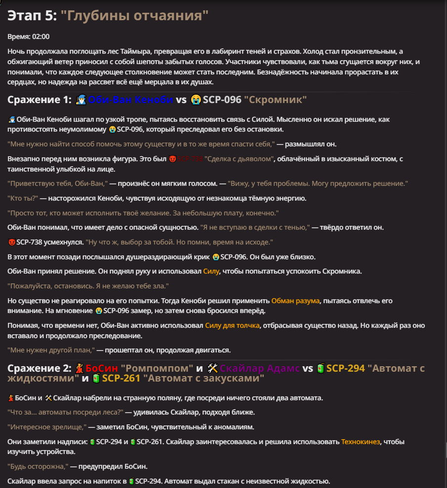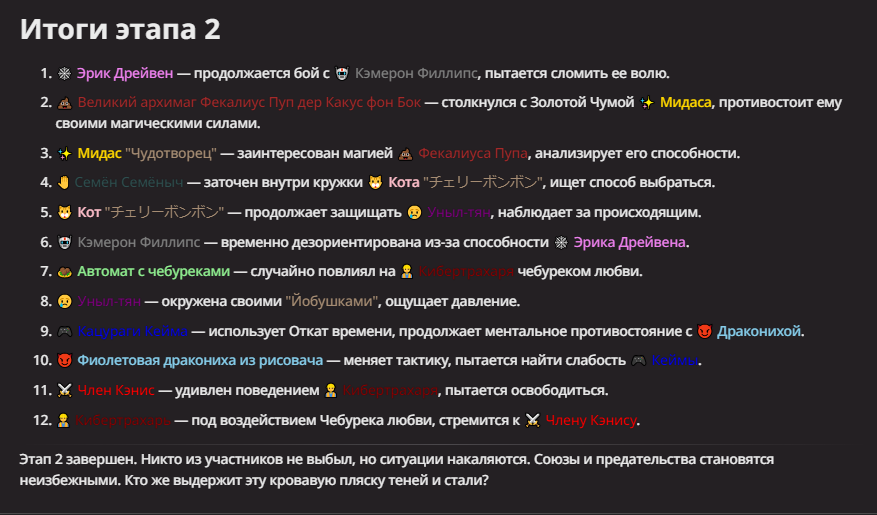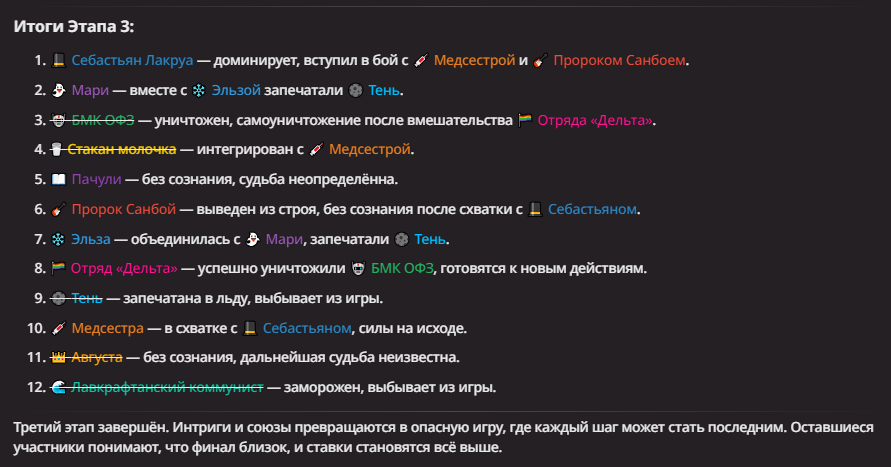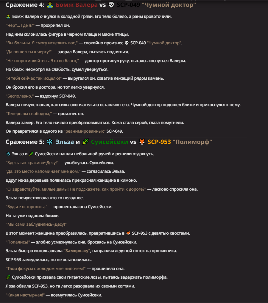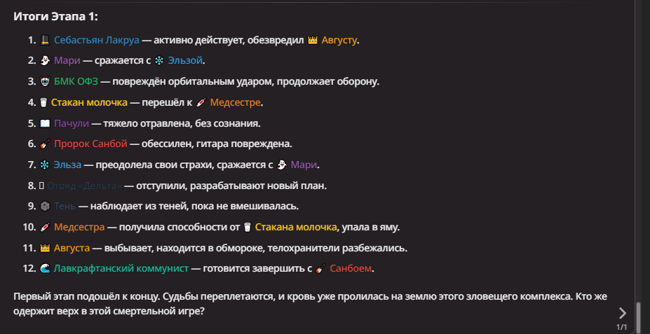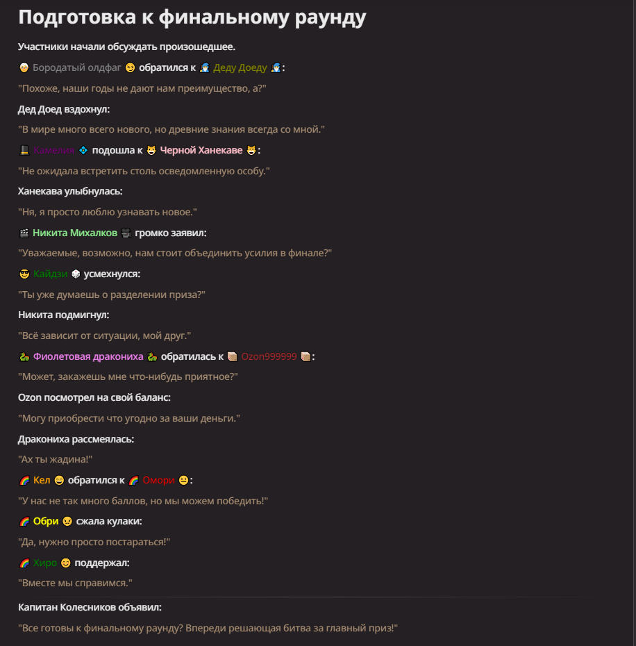 Нео из ГПТ Этот ничем не примечательный парень понимает что он и другие участники и абсолютно все остальное пространство на самом деле не более чем текст, написанные нейросетью. Он не может умереть или ожить, пока нейросеть будет продолжать писать, он не может получать урон, так как понимает тчо это не более чем текст, да и сам он ничего не сможет сделать за исключением того чтобы попытаться убедить других участников, что все происходящее не более чем иллюзия.