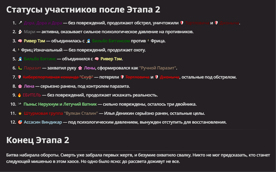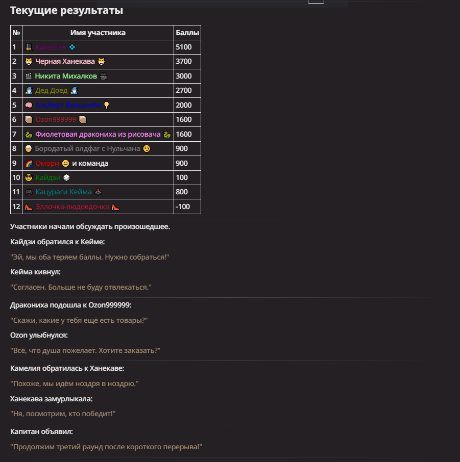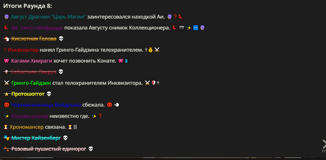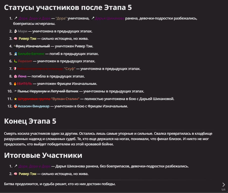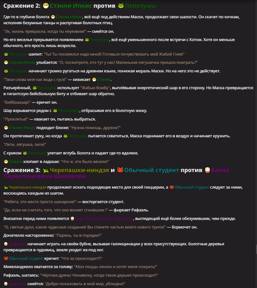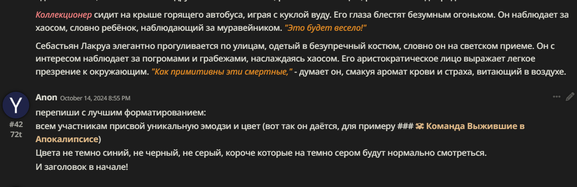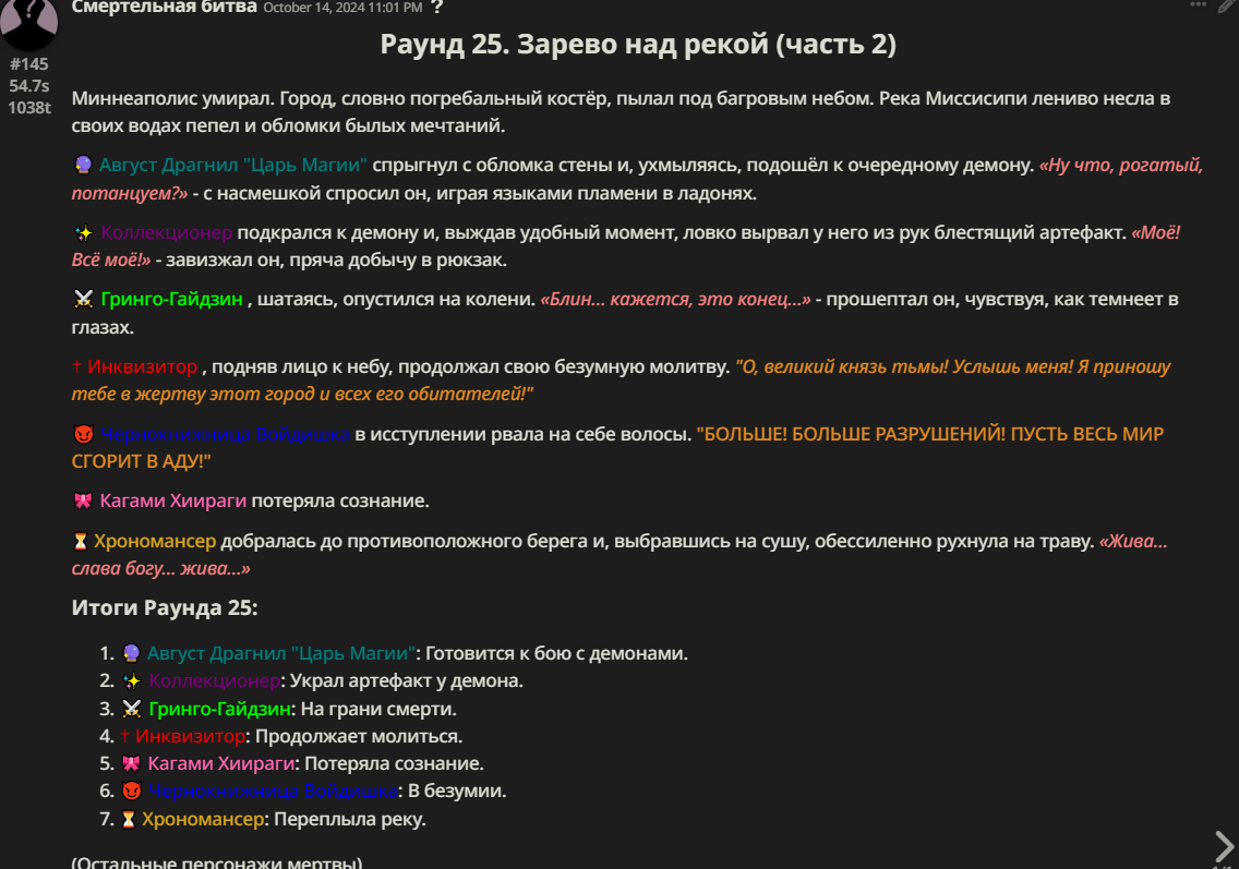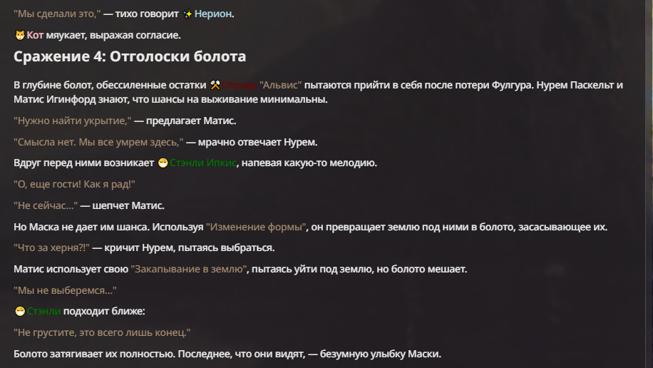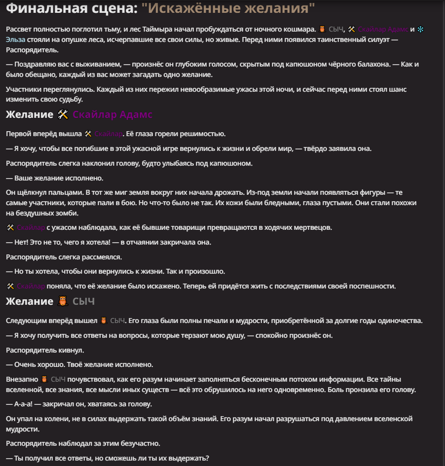 Нео из ГПТ Этот ничем не примечательный парень понимает что он и другие участники и абсолютно все остальное пространство на самом деле не более чем текст, написанные нейросетью. Он не может умереть или ожить, пока нейросеть будет продолжать писать, он не может получать урон, так как понимает тчо это не более чем текст, да и сам он ничего не сможет сделать за исключением того чтобы попытаться убедить других участников, что все происходящее не более чем иллюзия.