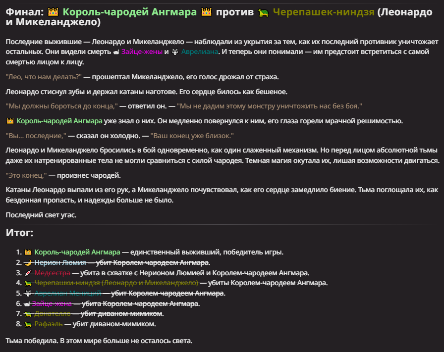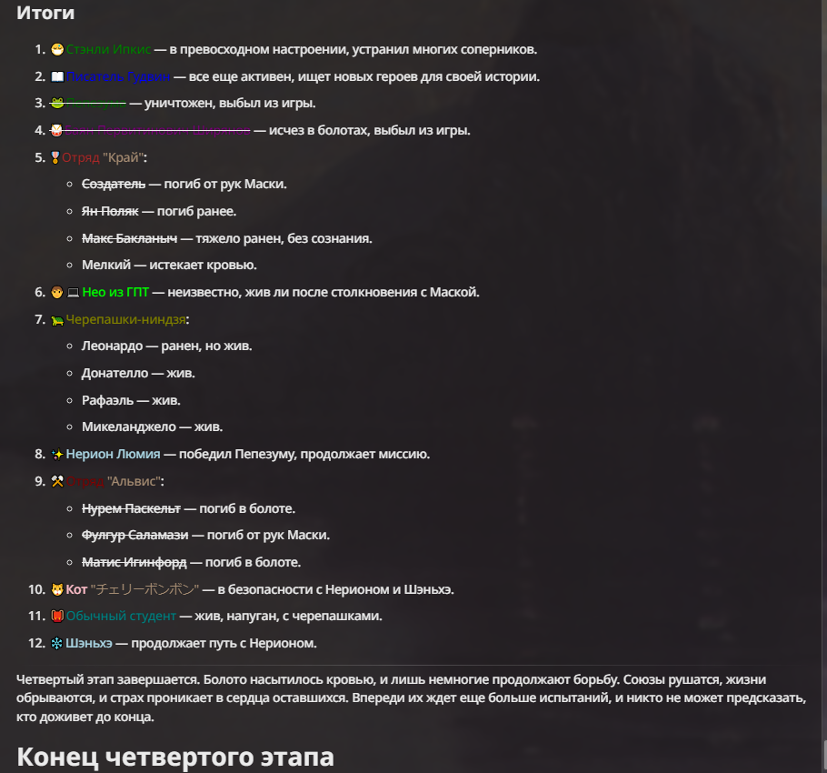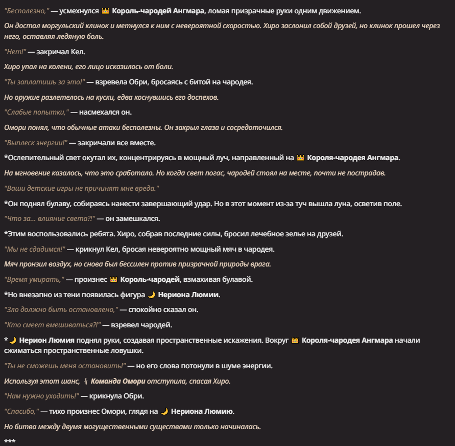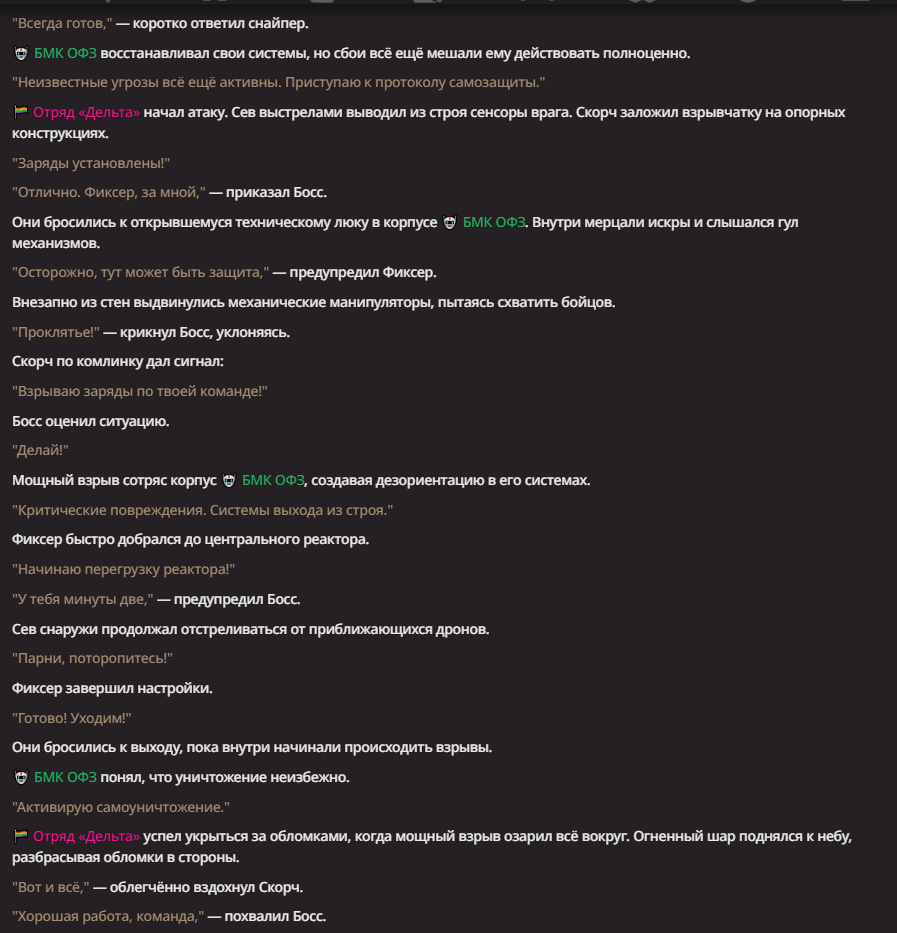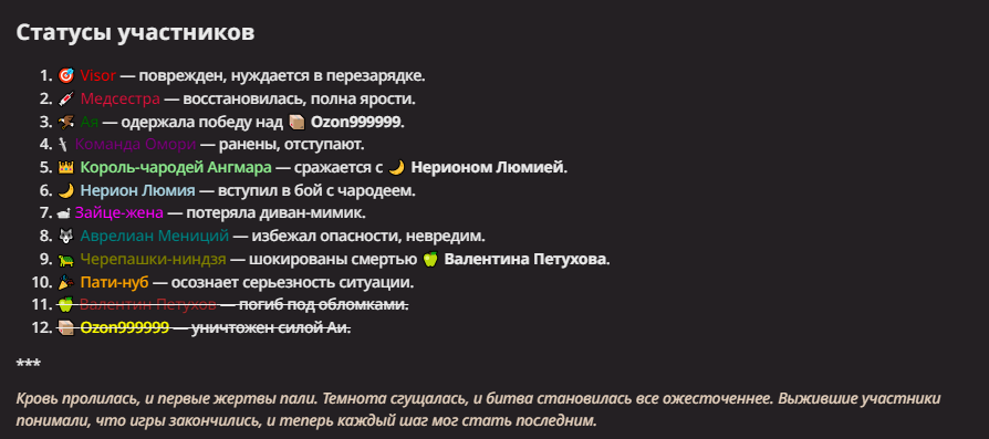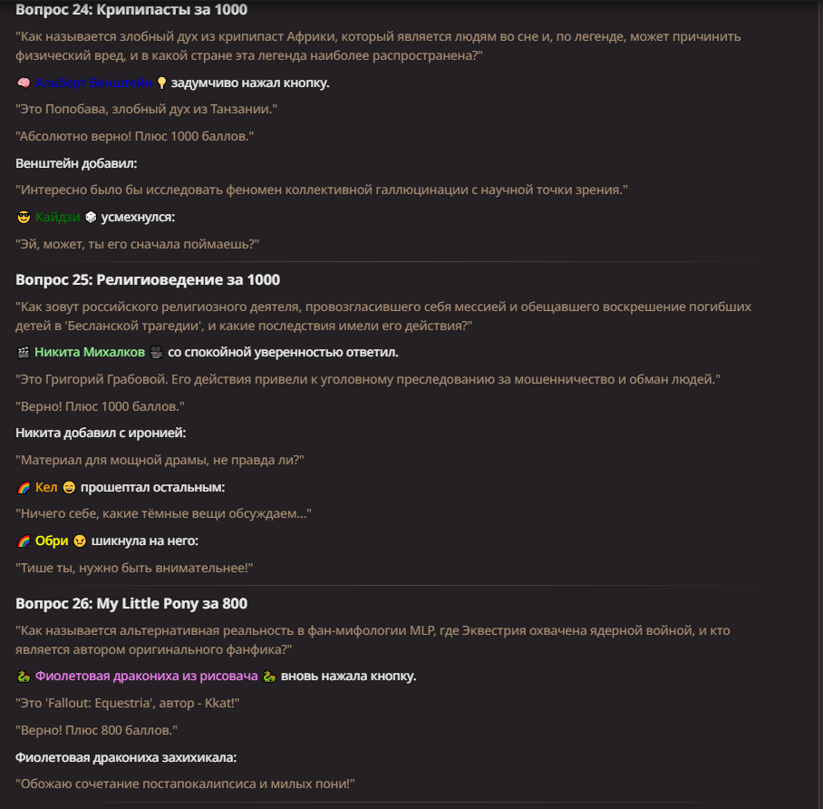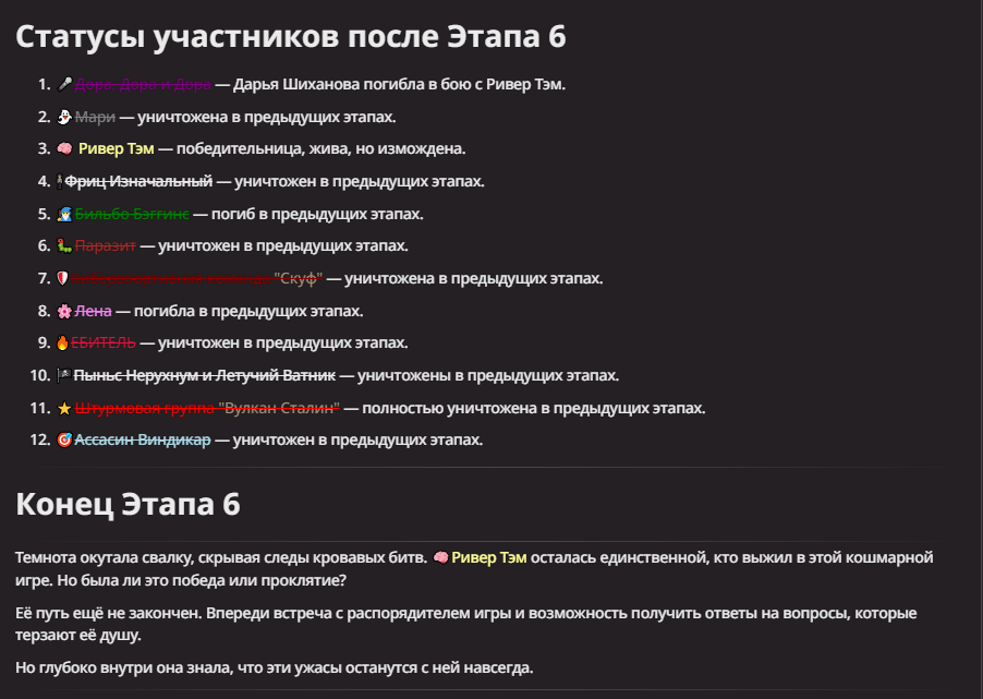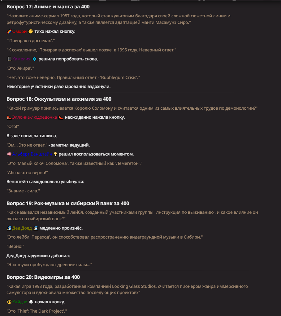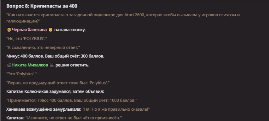 Нео из ГПТ Этот ничем не примечательный парень понимает что он и другие участники и абсолютно все остальное пространство на самом деле не более чем текст, написанные нейросетью. Он не может умереть или ожить, пока нейросеть будет продолжать писать, он не может получать урон, так как понимает тчо это не более чем текст, да и сам он ничего не сможет сделать за исключением того чтобы попытаться убедить других участников, что все происходящее не более чем иллюзия.
