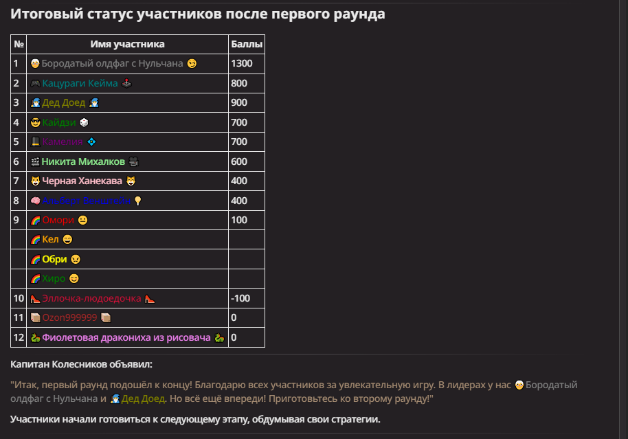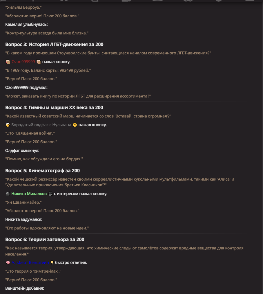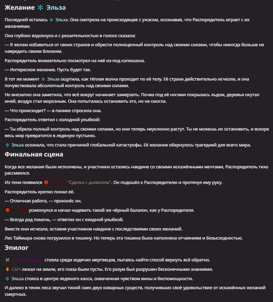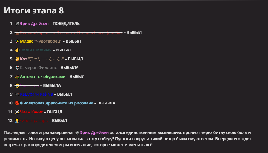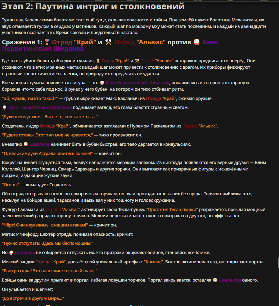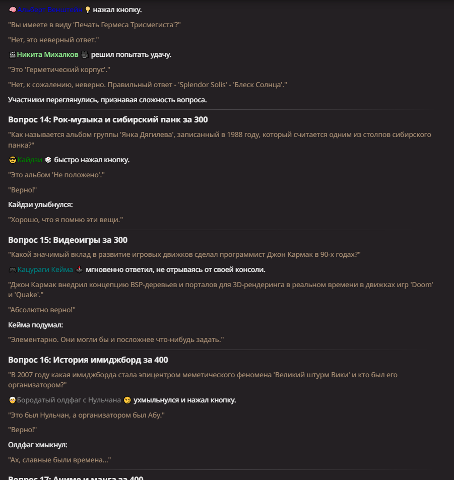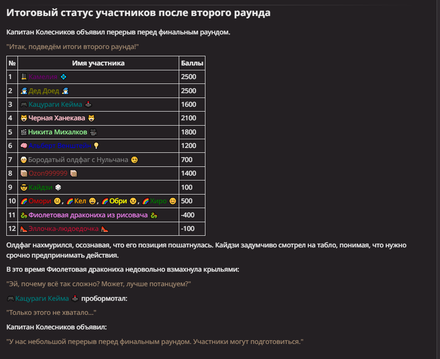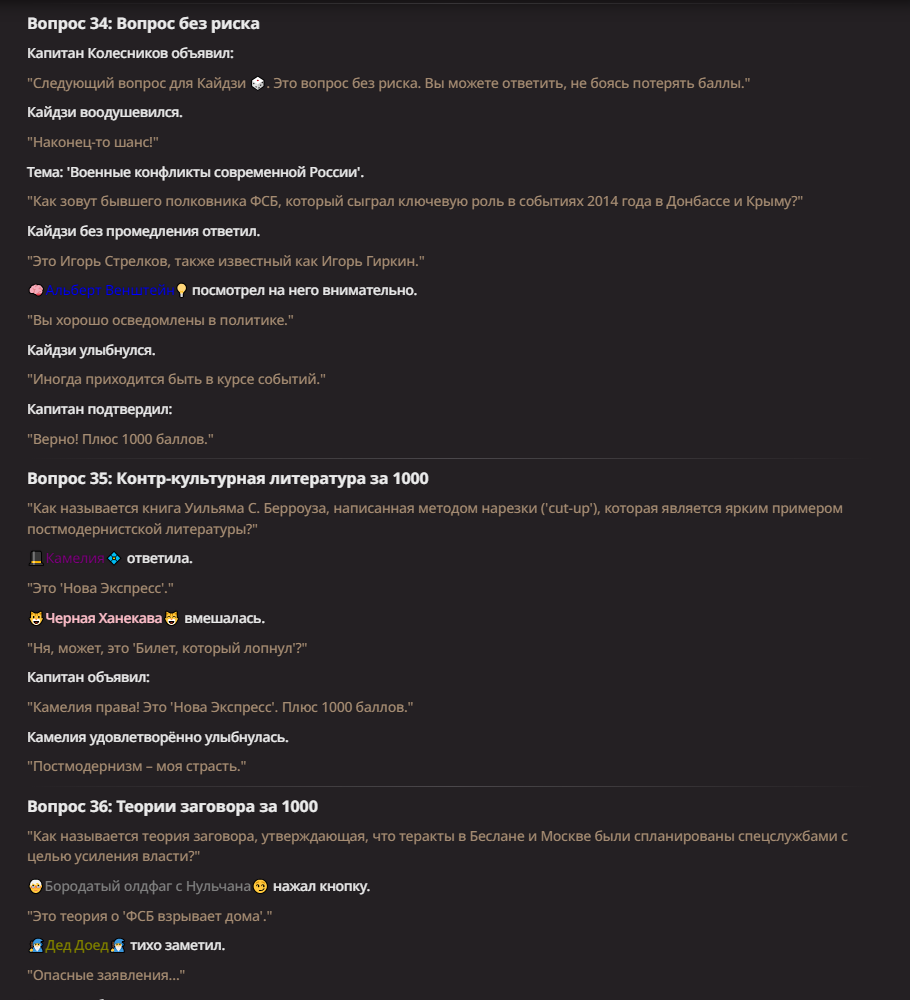 Нео из ГПТ Этот ничем не примечательный парень понимает что он и другие участники и абсолютно все остальное пространство на самом деле не более чем текст, написанные нейросетью. Он не может умереть или ожить, пока нейросеть будет продолжать писать, он не может получать урон, так как понимает тчо это не более чем текст, да и сам он ничего не сможет сделать за исключением того чтобы попытаться убедить других участников, что все происходящее не более чем иллюзия.