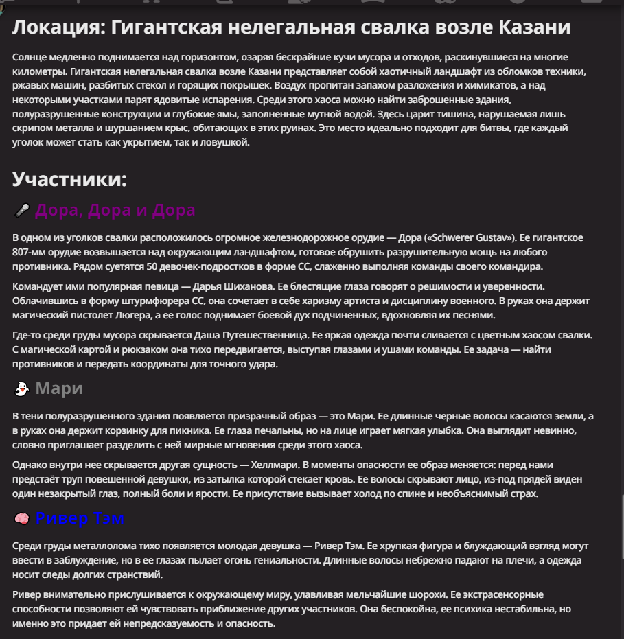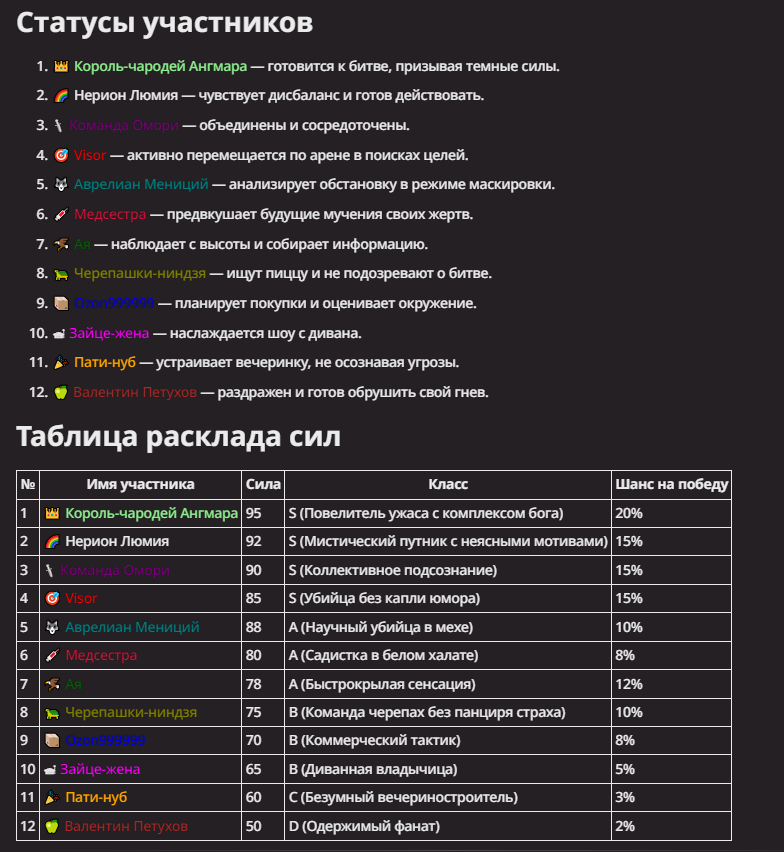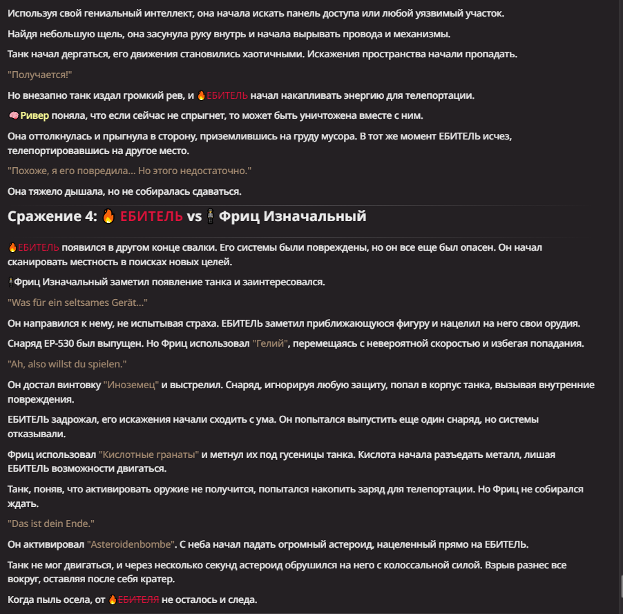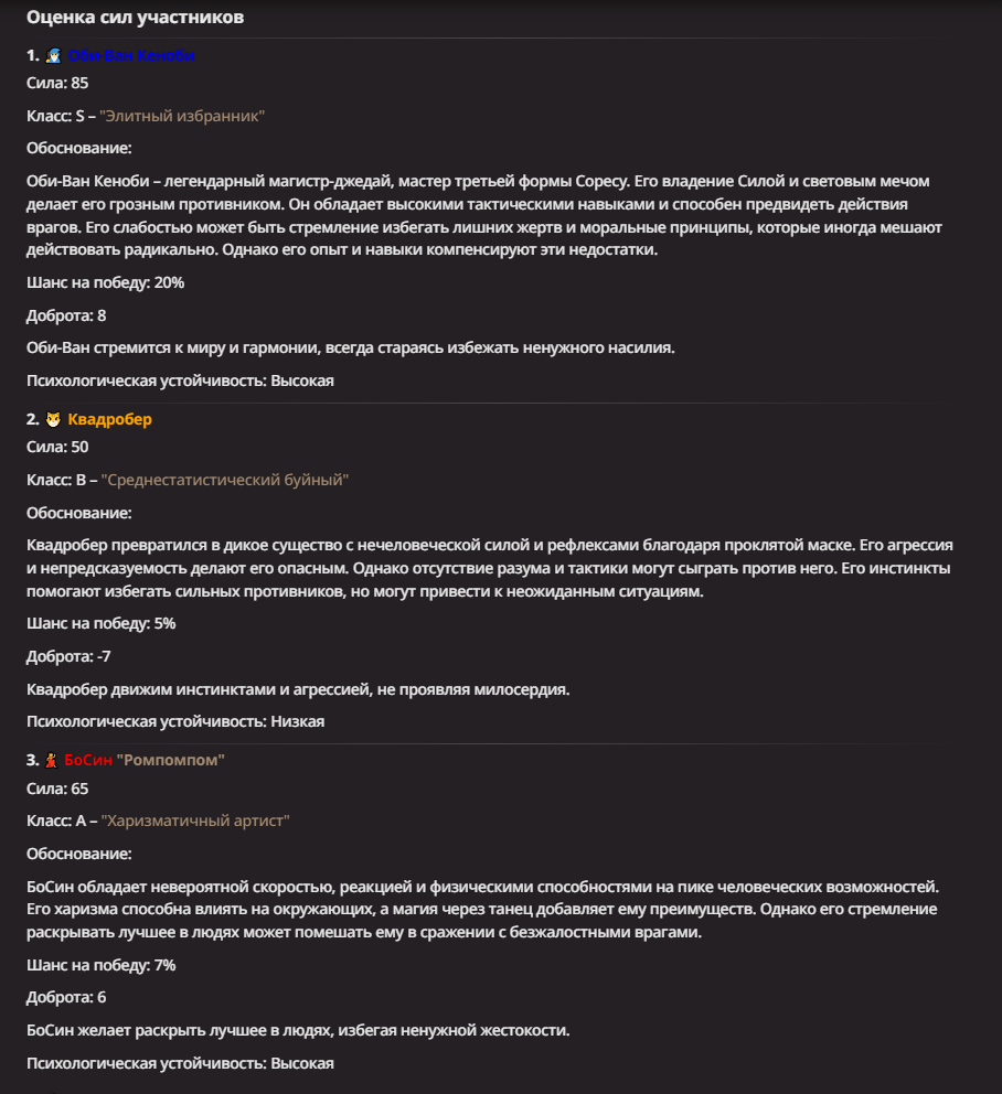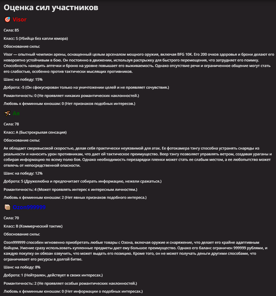 АИ АРЕНА |АИ БИТВЫ Игровой тред №7. В этих битвах может участвовать любой персонаж из любой вселенной, даже нашей(и даже из вашей головы)! Вам только нужно предложить их. Так же можете предложить место проведения боя которое выберется случайным образом.
