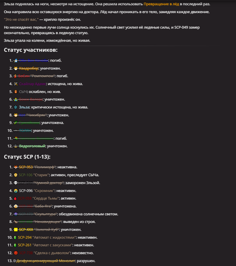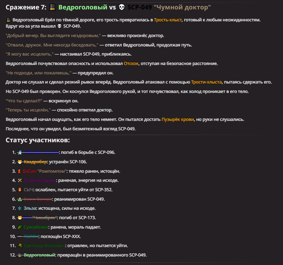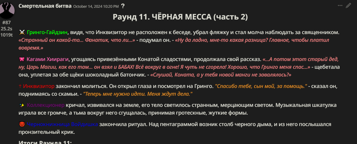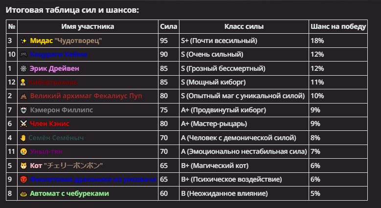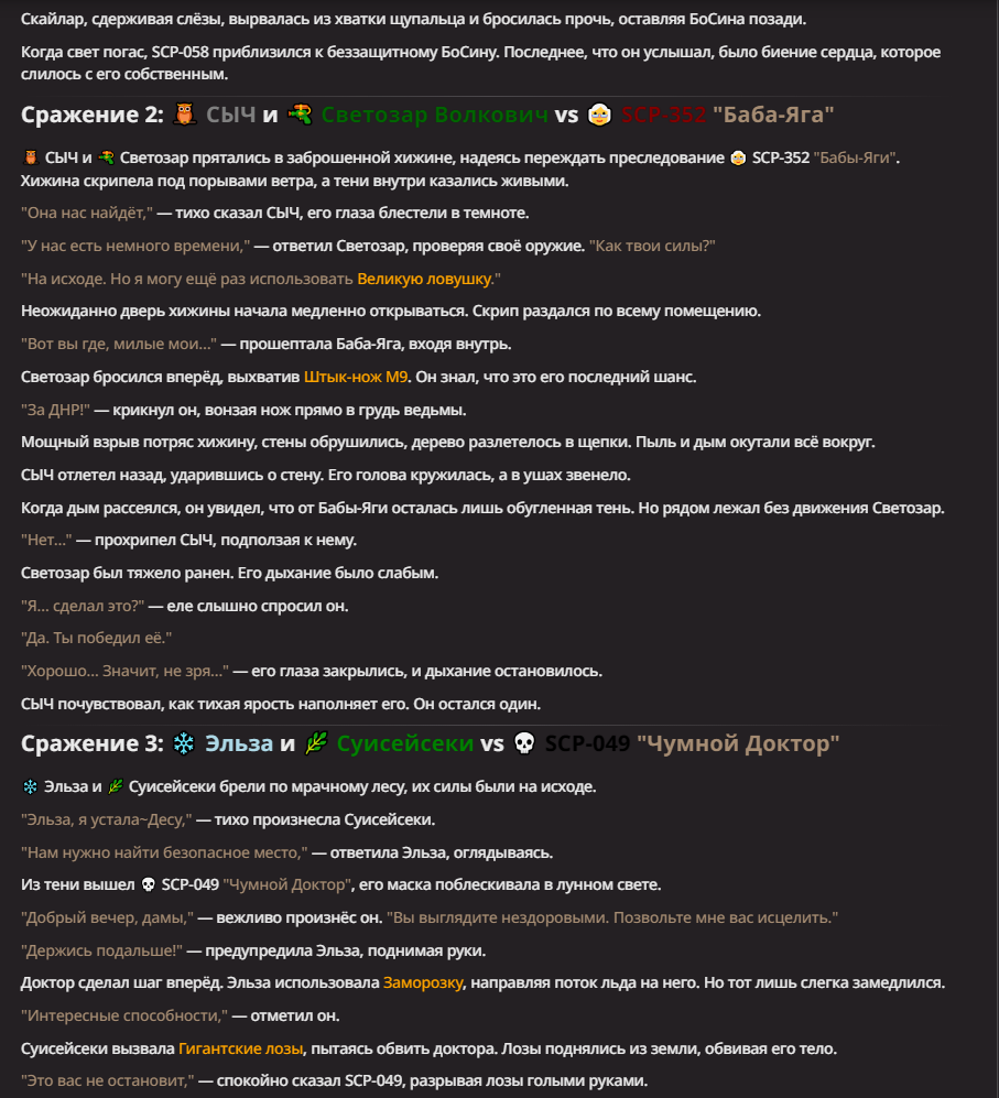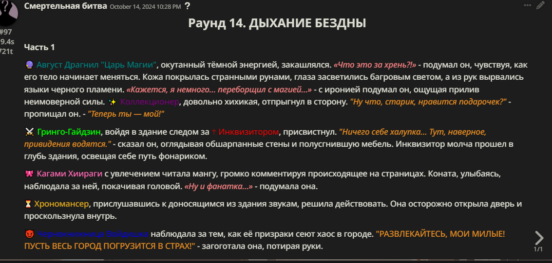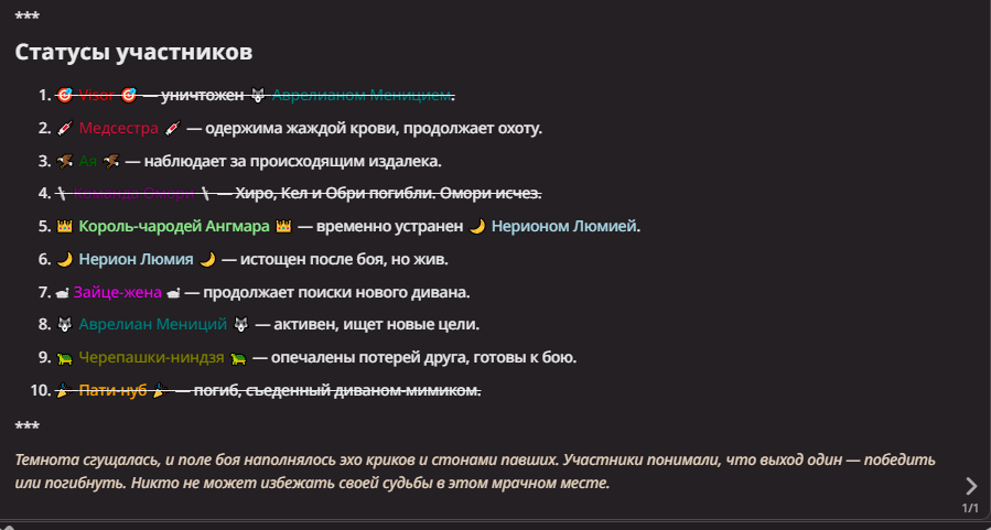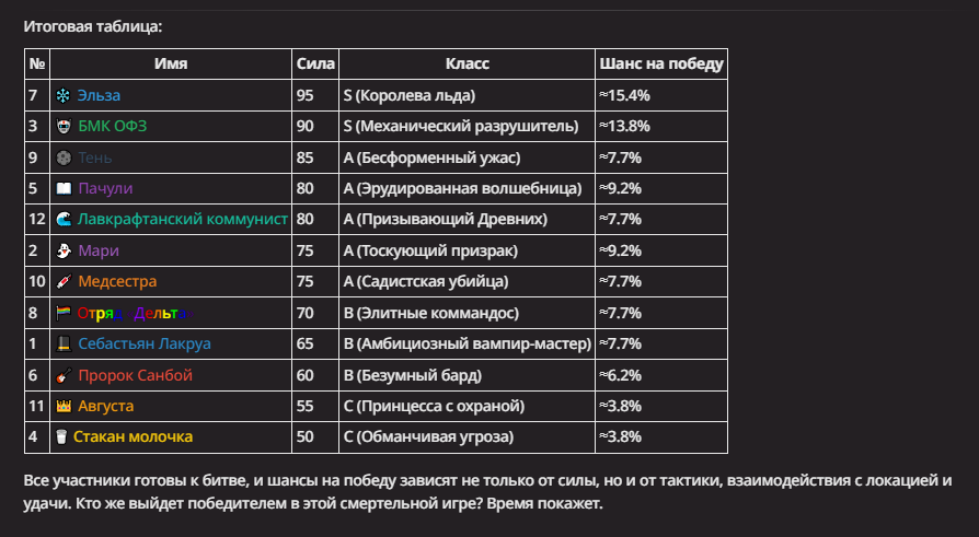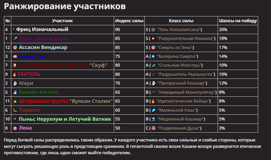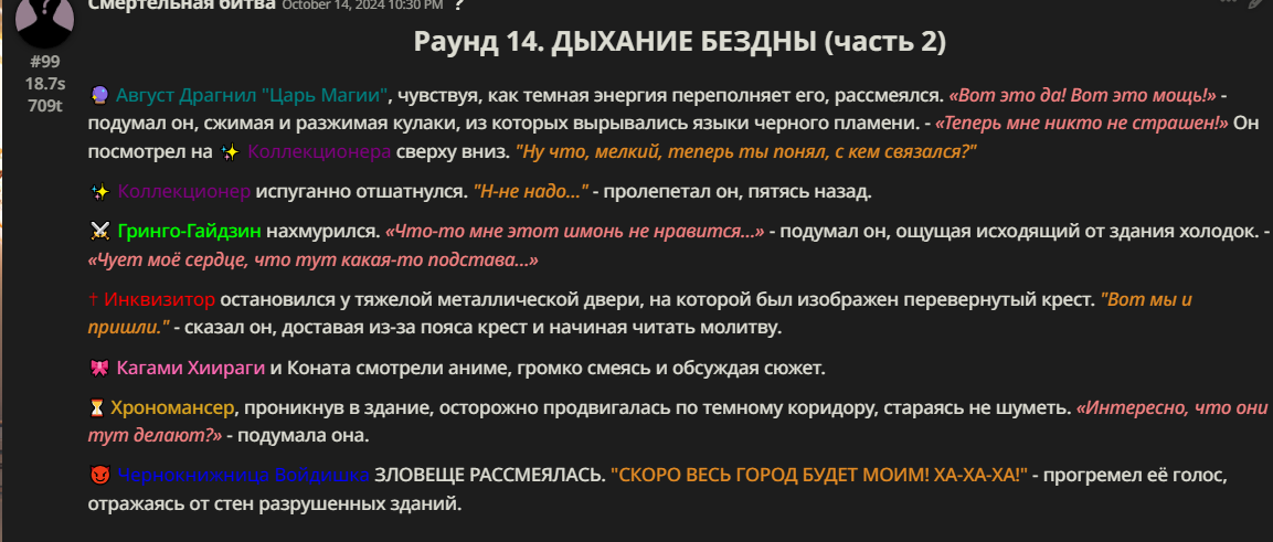 Правила(могут меняться в зависимости от ОПа): 1. Максимум в бою могут участвовать 12 персонажей. После этого набор закрывается и начинается битва. 2.Нельзя предлагать персонажей на около божественном уровне силы. 3.Персонажи с напарниками НЕ запрещены В РАЗУМНЫХ ПРЕДЕЛАХ, с соблюдением баланса сил. Никаких легионов космодесанта. Upd. Уточняйте у текущего ОПа. 4.После участия в бою персонаж уходит на перерыв в 3 боя(сделано для защиты от спамеров одного персонажа). 5.Нельзя предлагать персонажей которые могут призывать других существ без каких-либо условий. Пример: Маг который призывает демонов по щелчку пальцев == не допускается. Маг которому нужны трупы или какой-то длительный ритуал с условиями для призыва демона == допускается. 6.После использования локации она выбивается из случайного списка на 9 боёв.(Почему так много? Ради разнообразия) Upd. Формат может меняться в зависимости от ОПа 7.Набор персонажей полностью закрывается после начала боя и открывается только когда он закончится. 8. Ведущий оставляет за собой право не принять вашего персонажа. Будьте корректны - в случае, если такое произошло, вежливо спросите причину и/или дождитесь другого ведущего.