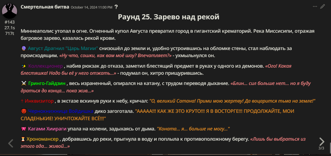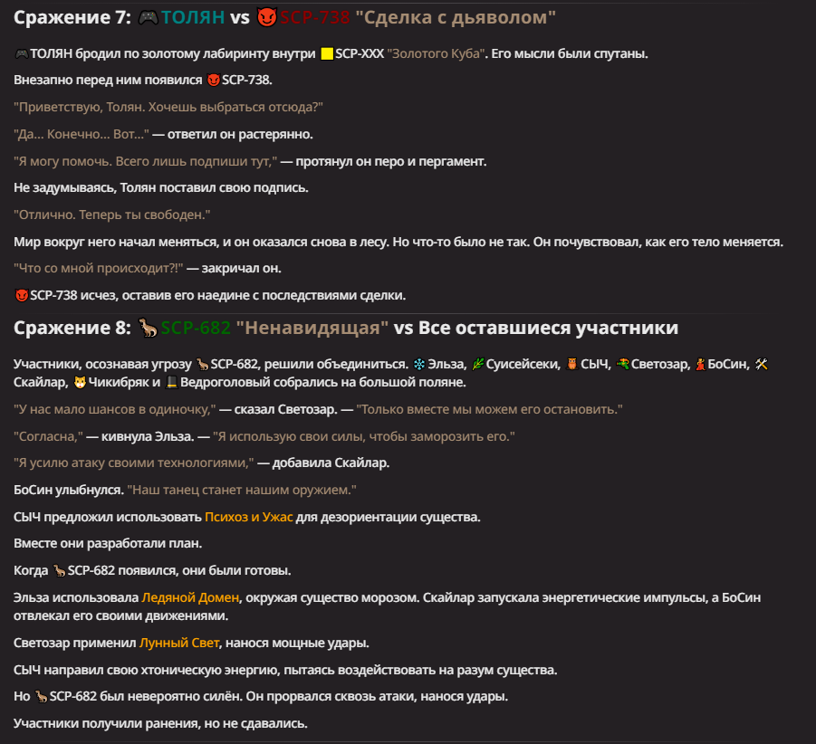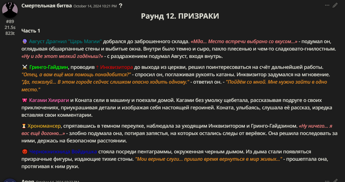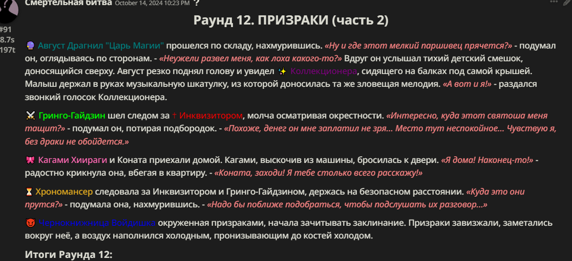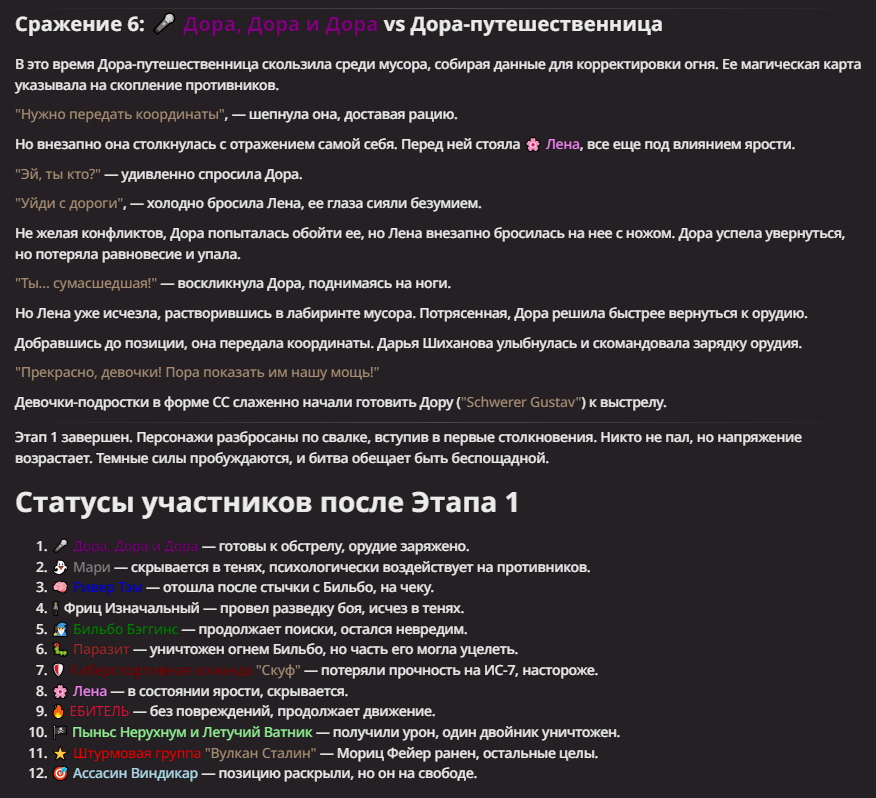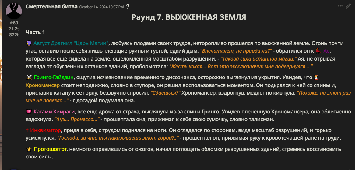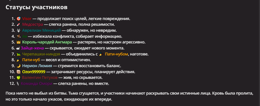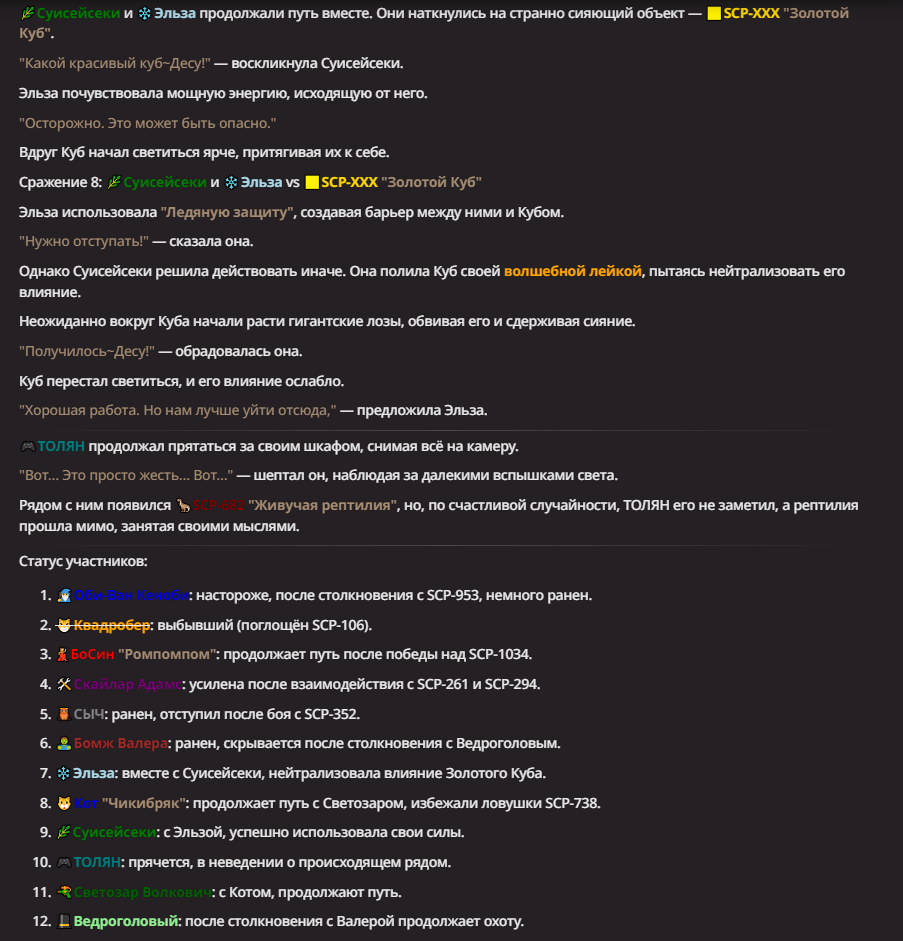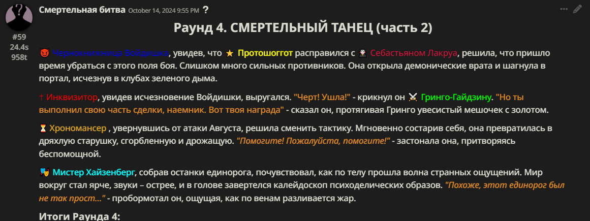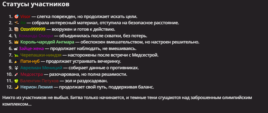 Правила(могут меняться в зависимости от ОПа): 1. Максимум в бою могут участвовать 12 персонажей. После этого набор закрывается и начинается битва. 2.Нельзя предлагать персонажей на около божественном уровне силы. 3.Персонажи с напарниками НЕ запрещены В РАЗУМНЫХ ПРЕДЕЛАХ, с соблюдением баланса сил. Никаких легионов космодесанта. Upd. Уточняйте у текущего ОПа. 4.После участия в бою персонаж уходит на перерыв в 3 боя(сделано для защиты от спамеров одного персонажа). 5.Нельзя предлагать персонажей которые могут призывать других существ без каких-либо условий. Пример: Маг который призывает демонов по щелчку пальцев == не допускается. Маг которому нужны трупы или какой-то длительный ритуал с условиями для призыва демона == допускается. 6.После использования локации она выбивается из случайного списка на 9 боёв.(Почему так много? Ради разнообразия) Upd. Формат может меняться в зависимости от ОПа 7.Набор персонажей полностью закрывается после начала боя и открывается только когда он закончится. 8. Ведущий оставляет за собой право не принять вашего персонажа. Будьте корректны - в случае, если такое произошло, вежливо спросите причину и/или дождитесь другого ведущего.