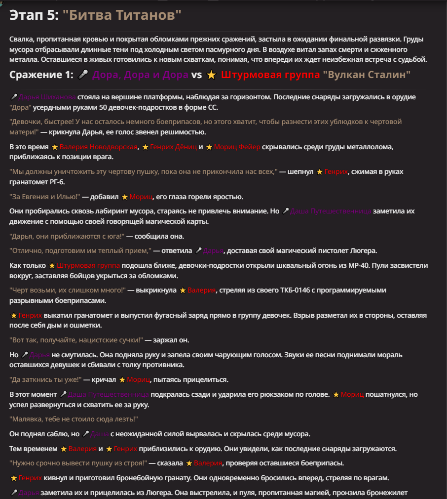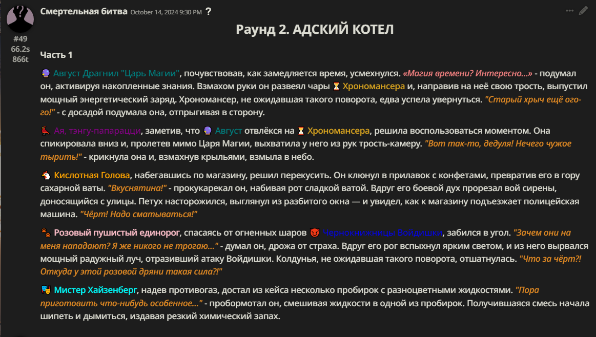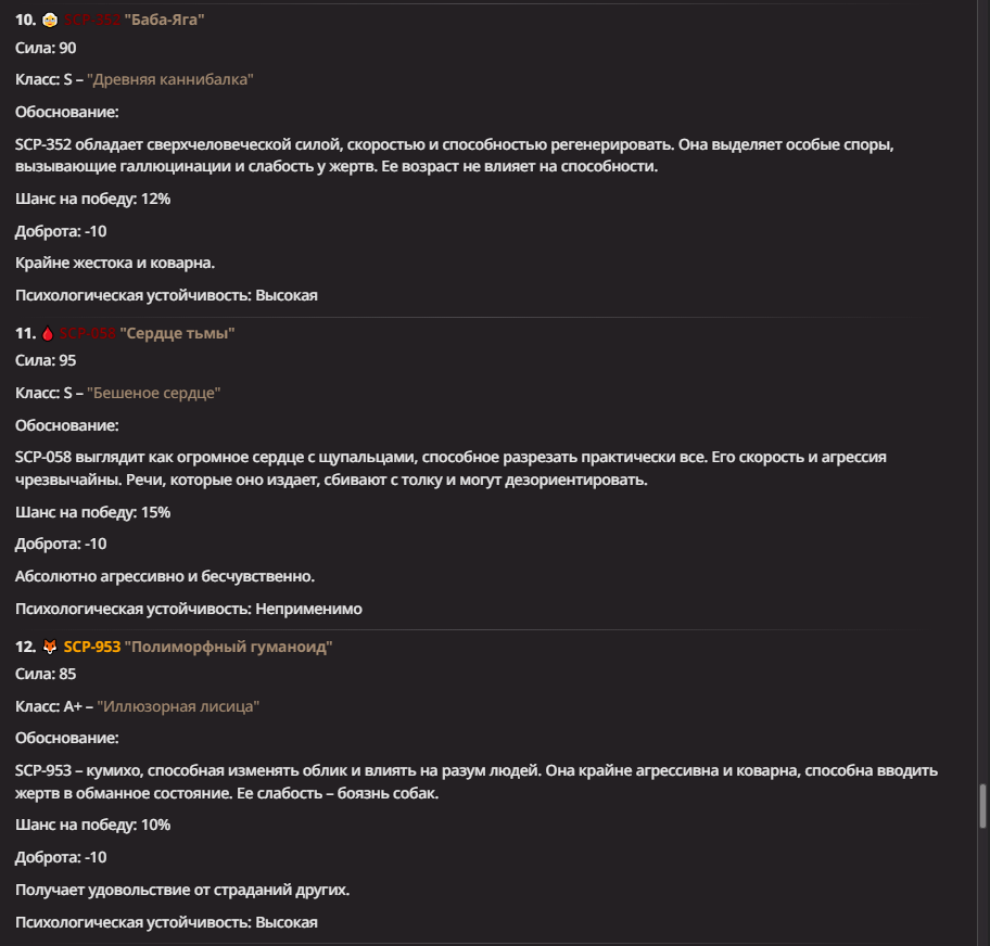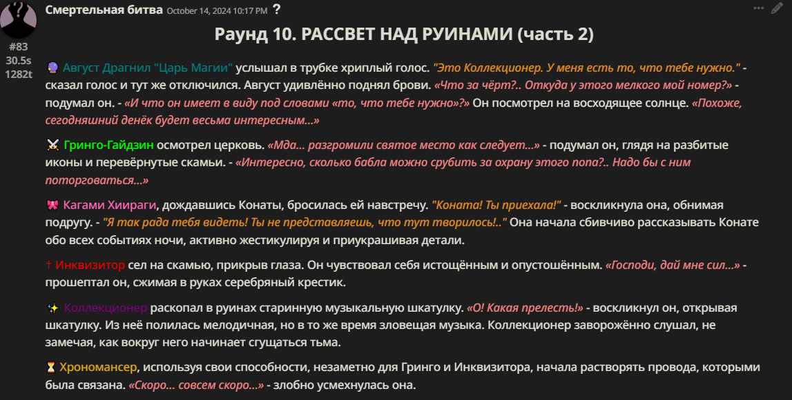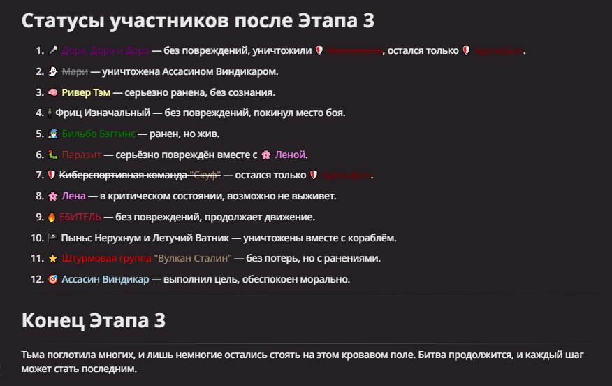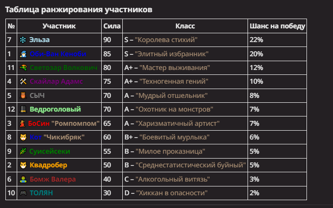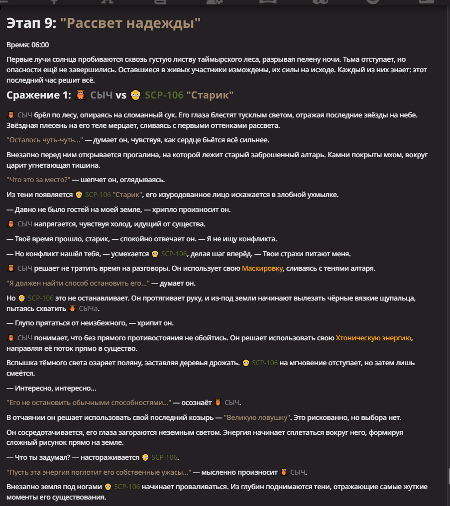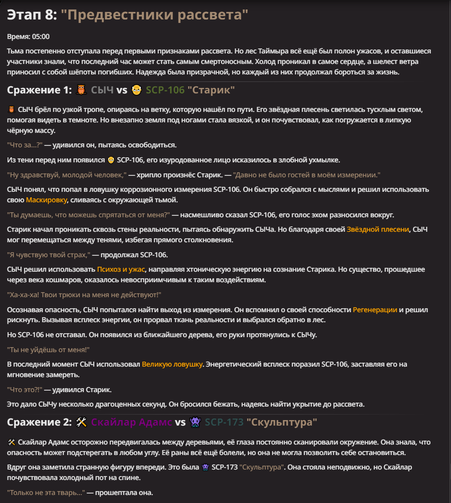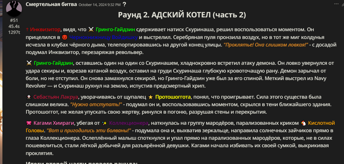 Правила(могут меняться в зависимости от ОПа): 1. Максимум в бою могут участвовать 12 персонажей. После этого набор закрывается и начинается битва. 2.Нельзя предлагать персонажей на около божественном уровне силы. 3.Персонажи с напарниками НЕ запрещены В РАЗУМНЫХ ПРЕДЕЛАХ, с соблюдением баланса сил. Никаких легионов космодесанта. Upd. Уточняйте у текущего ОПа. 4.После участия в бою персонаж уходит на перерыв в 3 боя(сделано для защиты от спамеров одного персонажа). 5.Нельзя предлагать персонажей которые могут призывать других существ без каких-либо условий. Пример: Маг который призывает демонов по щелчку пальцев == не допускается. Маг которому нужны трупы или какой-то длительный ритуал с условиями для призыва демона == допускается. 6.После использования локации она выбивается из случайного списка на 9 боёв.(Почему так много? Ради разнообразия) Upd. Формат может меняться в зависимости от ОПа 7.Набор персонажей полностью закрывается после начала боя и открывается только когда он закончится. 8. Ведущий оставляет за собой право не принять вашего персонажа. Будьте корректны - в случае, если такое произошло, вежливо спросите причину и/или дождитесь другого ведущего.