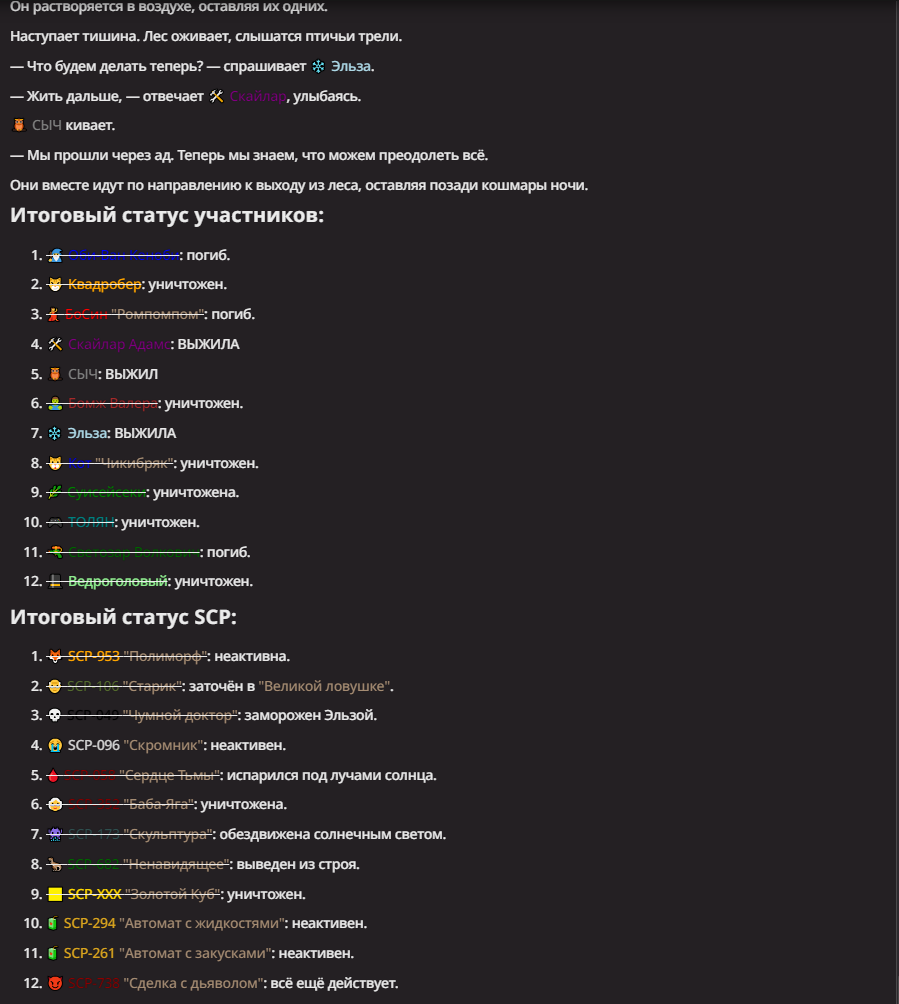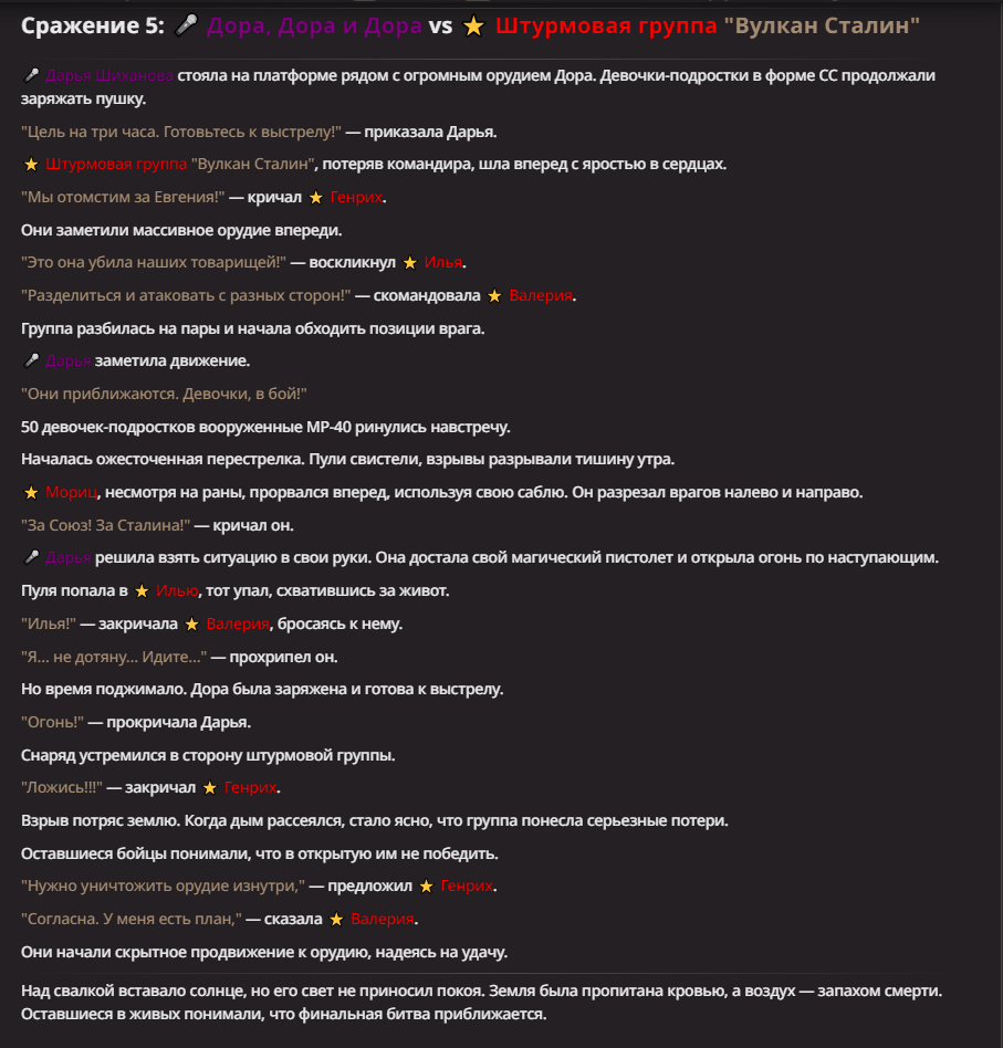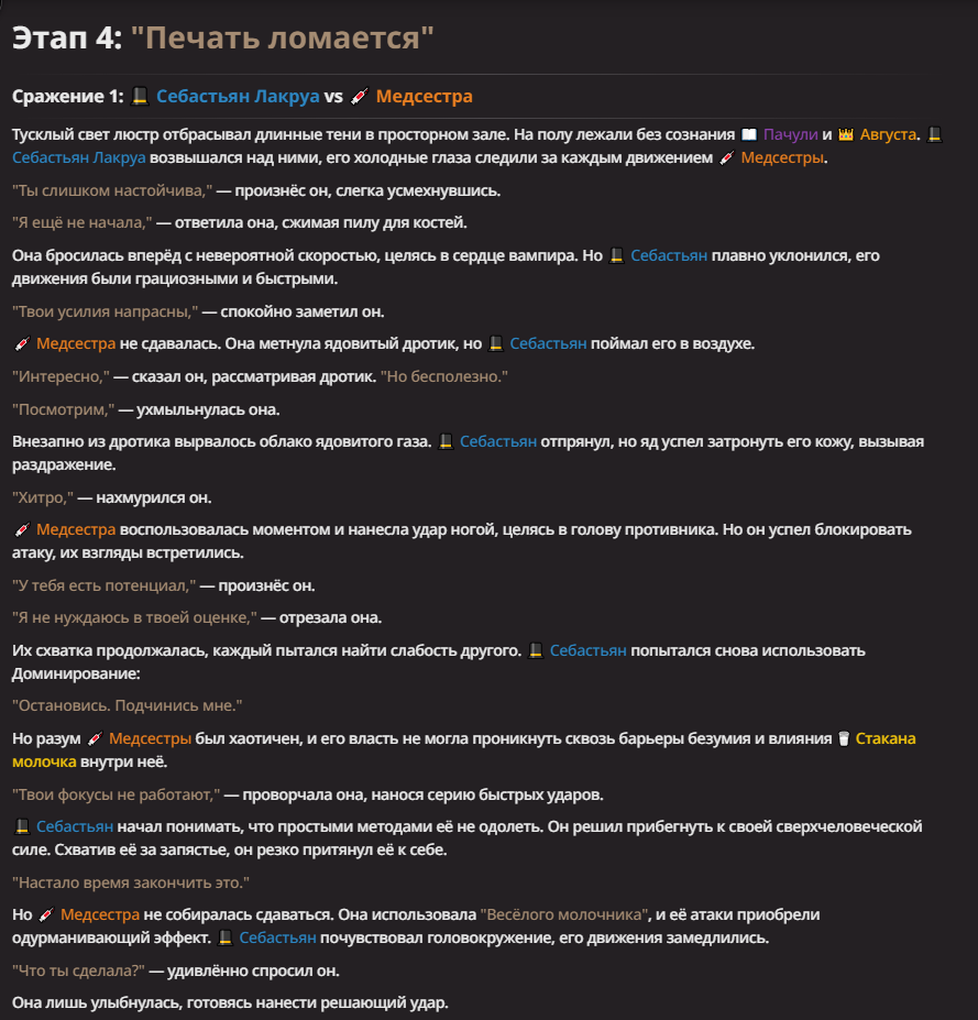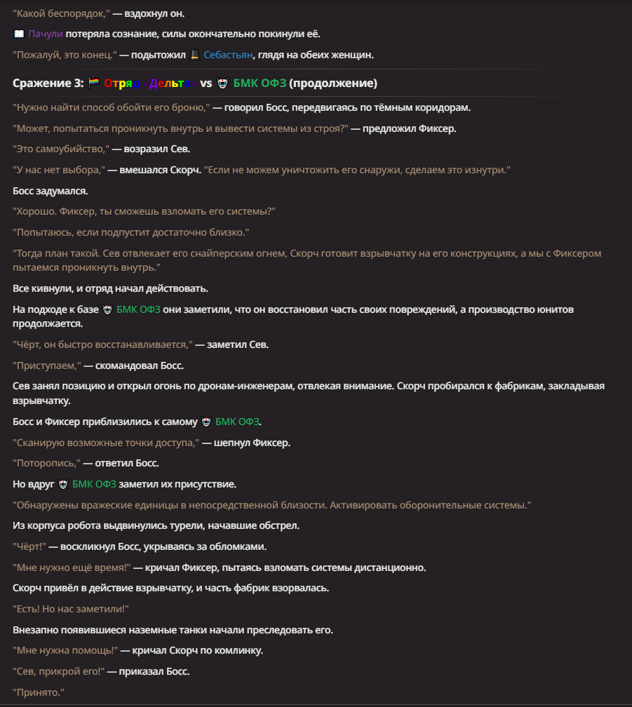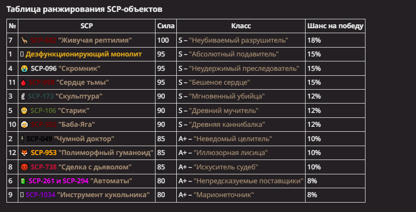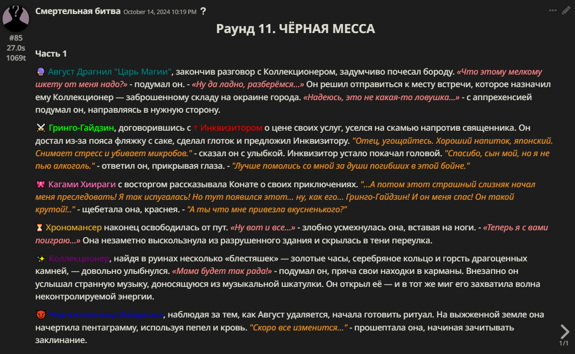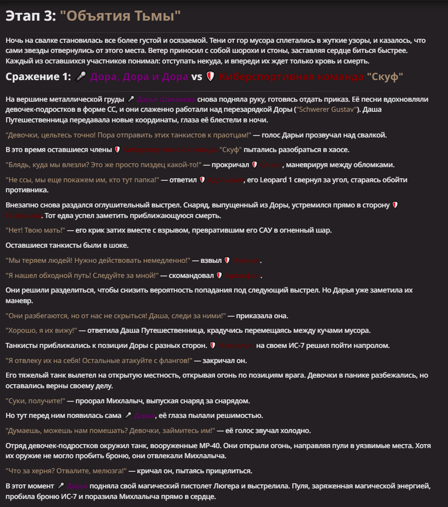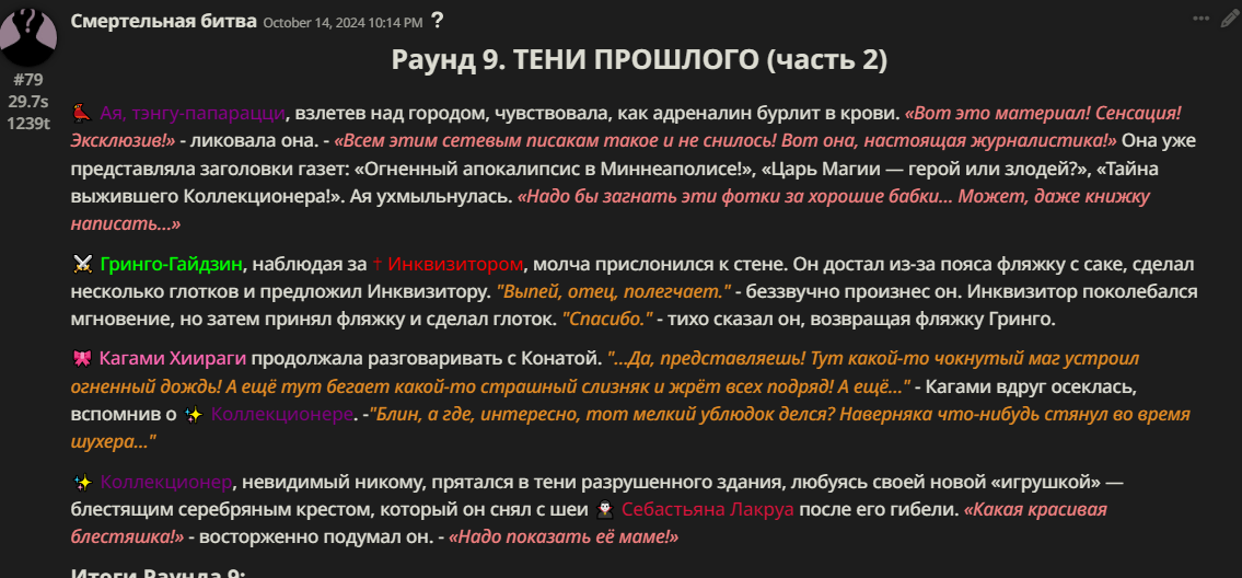 Правила(могут меняться в зависимости от ОПа): 1. Максимум в бою могут участвовать 12 персонажей. После этого набор закрывается и начинается битва. 2.Нельзя предлагать персонажей на около божественном уровне силы. 3.Персонажи с напарниками НЕ запрещены В РАЗУМНЫХ ПРЕДЕЛАХ, с соблюдением баланса сил. Никаких легионов космодесанта. Upd. Уточняйте у текущего ОПа. 4.После участия в бою персонаж уходит на перерыв в 3 боя(сделано для защиты от спамеров одного персонажа). 5.Нельзя предлагать персонажей которые могут призывать других существ без каких-либо условий. Пример: Маг который призывает демонов по щелчку пальцев == не допускается. Маг которому нужны трупы или какой-то длительный ритуал с условиями для призыва демона == допускается. 6.После использования локации она выбивается из случайного списка на 9 боёв.(Почему так много? Ради разнообразия) Upd. Формат может меняться в зависимости от ОПа 7.Набор персонажей полностью закрывается после начала боя и открывается только когда он закончится. 8. Ведущий оставляет за собой право не принять вашего персонажа. Будьте корректны - в случае, если такое произошло, вежливо спросите причину и/или дождитесь другого ведущего.