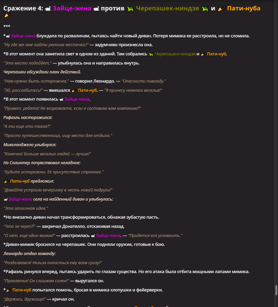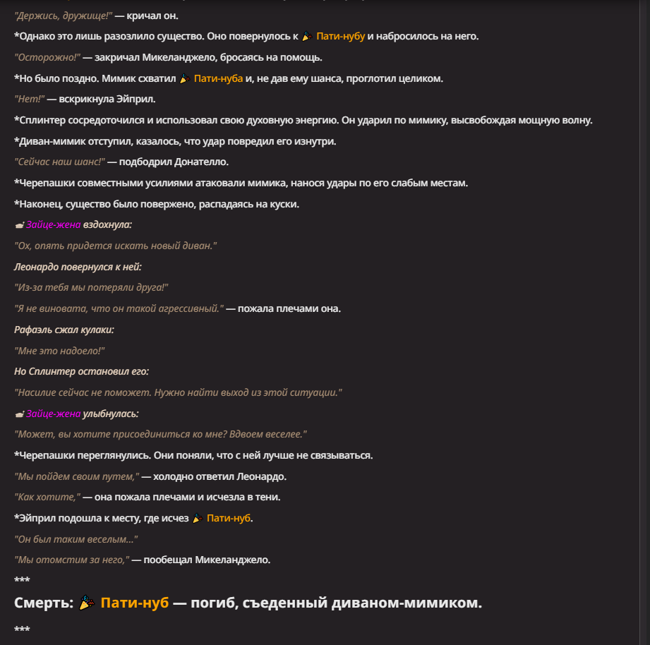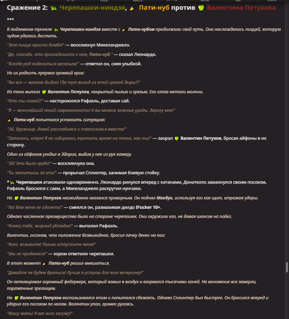 >>1550815 Черепашки-ниндзя, их тренер крыса-мутант Сплинтер и журналистка Эйприл О’Нил В целом им пофиг на происходящее - они тут бродят в поисках пиццы и канализации, чтобы уединиться с Эйприл(о чем сама Эйприл не подозревает). Но они всегда готовы заступиться за слабых.