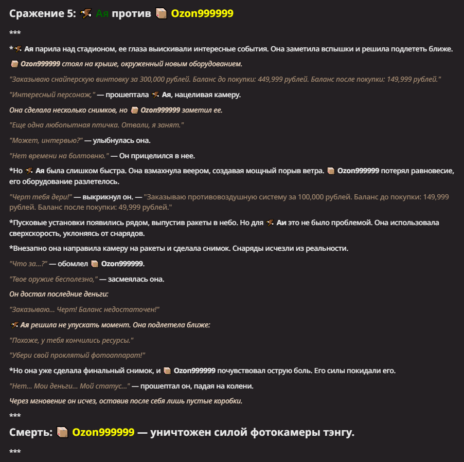 >>1550815 Ozon999999 Мужчина, являющийся живым воплощением торговой площадки Озон. Ozon999999 начинает с 999999 рублями на балансе, которые может тратить в любой момент. Он умеет заказывать товары с Озона силой мысли, купленное мгновенно телепортируется к нему. Ozon999999 в совершенстве овладевает навыком использования любого предмета сразу после его покупки. Каждый раз, заказывая товар, он обязан озвучить его стоимость и свой баланс до и после покупки. Так же Ozon999999 может возвращать товары за их полную стоимость, если на них нет следов использования. Делая это, он обязан озвучить стоимость возврата и свой баланс до и после операции. Ozon999999 способен продавать вещи с арены и даже останки поверженных противников на Озоне. Это относится только к тем экземплярам, которые могут представлять интерес для покупателя. Он обязан озвучивать конкретный предмет продажи, его стоимость, а так же баланс до и после сделки. Если у противников или союзников найдутся деньги, Ozon999999 может перевести их себе на карту, озвучив ее баланс до и после перевода. Ozon999999 не может получать деньги какими-либо способами, кроме от вышеописанных.