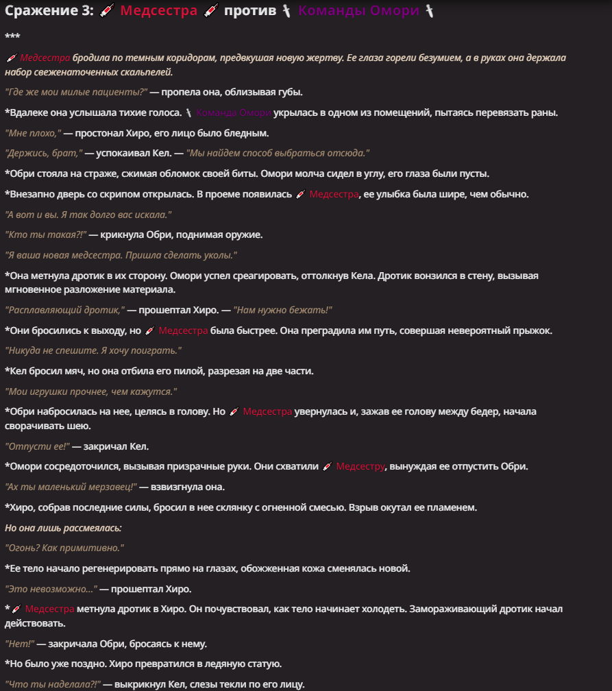 Медсестра Девушка в костюме сексуальной медсестры. Вооружена набором шприцев, с различными веществами, которые может метать как дротики. В ближнем бою сражается пилой для костей. Мастер боевых искусств. Отличное понимание анатомии позволяет ей бить по уязвимым местам, обездвиживая или вызывая невероятную боль. Обладает сверхчеловеческой ловкостью, силой и растяжкой. Имеет садистскую натуру, любит наблюдать мучения своих противников. Обожает разделывать врагов живьем. Сыворотка регенерации позволяет ей мгновенно восстановиться от тяжелых ранений Встретив сильного противника, может прикинуться невинной, чтобы мгновенно убить его когда он подойдет ближе Боевые приемы: 1) Зажимает голову противника своими бедрами, сворачивая ему шею 2) Хайкик в голову чтобы отправить врага в полет 3) Удар по коленям, ломающий ноги 4) Удар пилой по шее, отделяющий голову от плеч 5) Зубами вырывает сердце прямо из груди противника 6) Метает восемь скальпелей Дротики: 1) Ядовитый - заставляет жервту выблевать свои кишки 2) Расплавляющий - тело жертвы начинает растекаться словно тесто 3) Замораживающий - замораживает жертву, после чего его можно расколоть одним ударом 4) Раздувающий - тело жертвы раздувается словно шар 5) Галлюциногенный - жертва сходит с ума, бросаясь на всех подряд