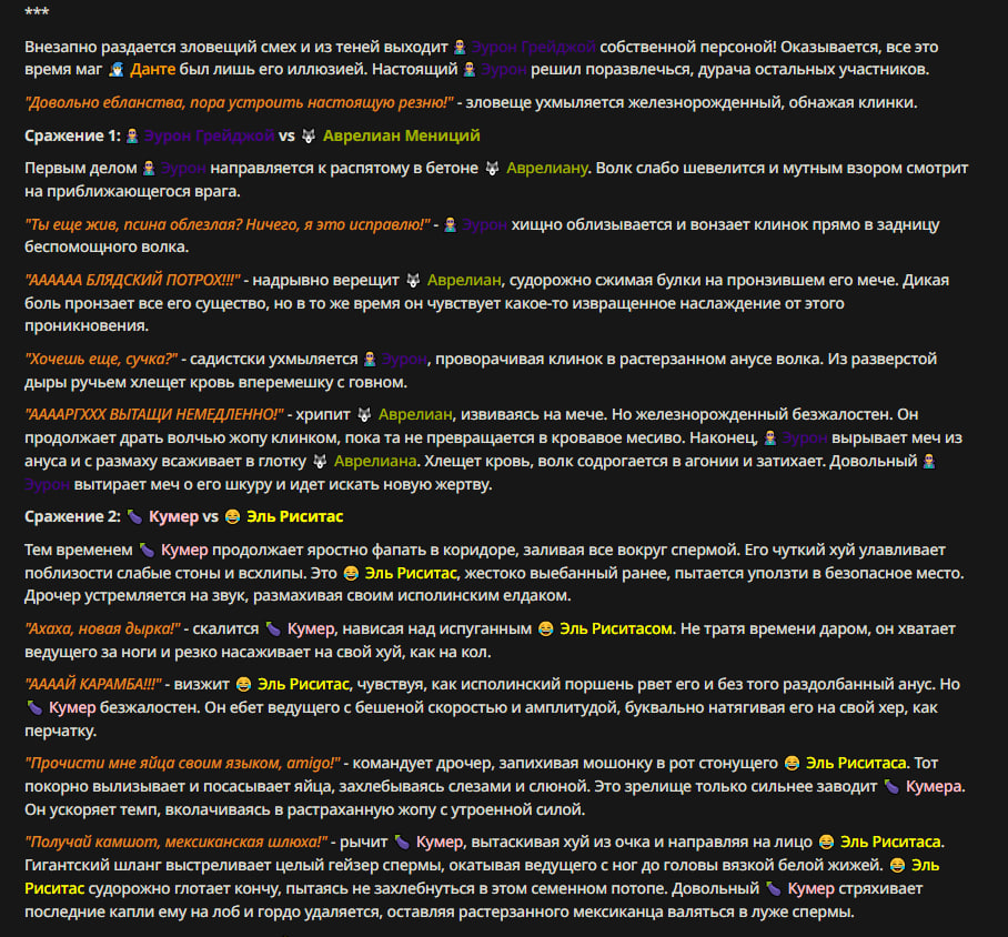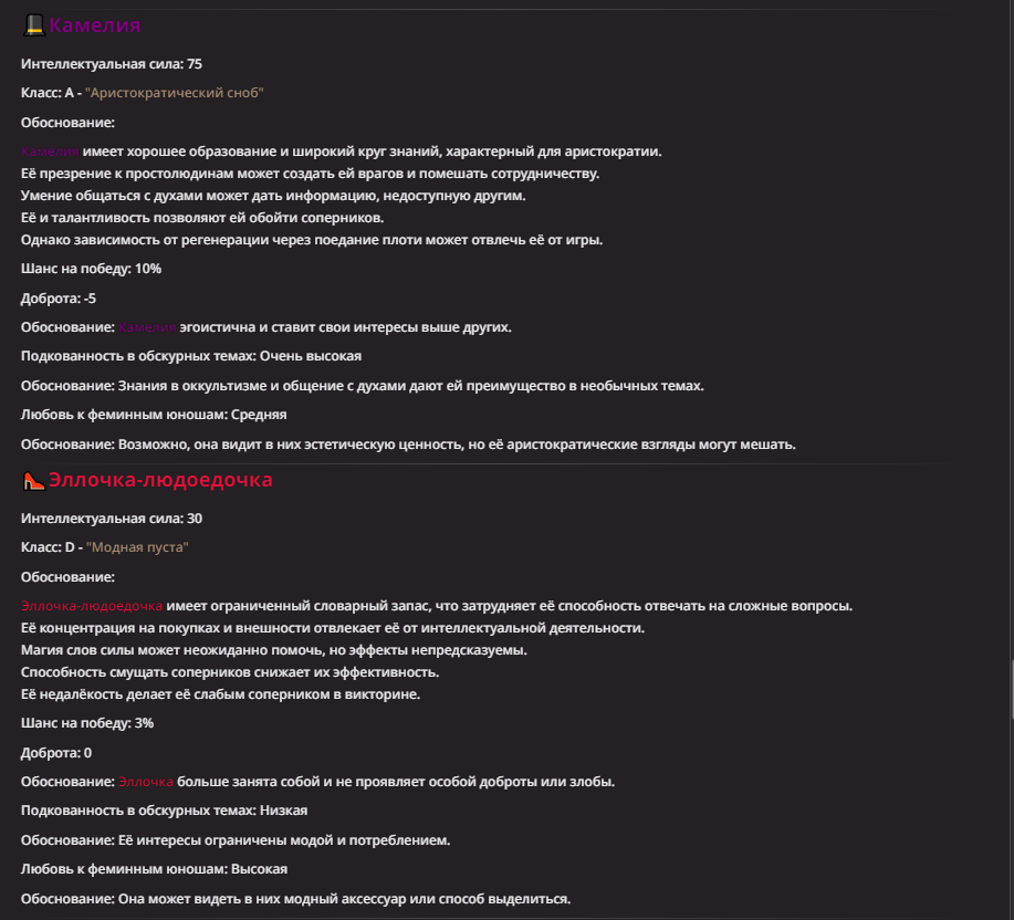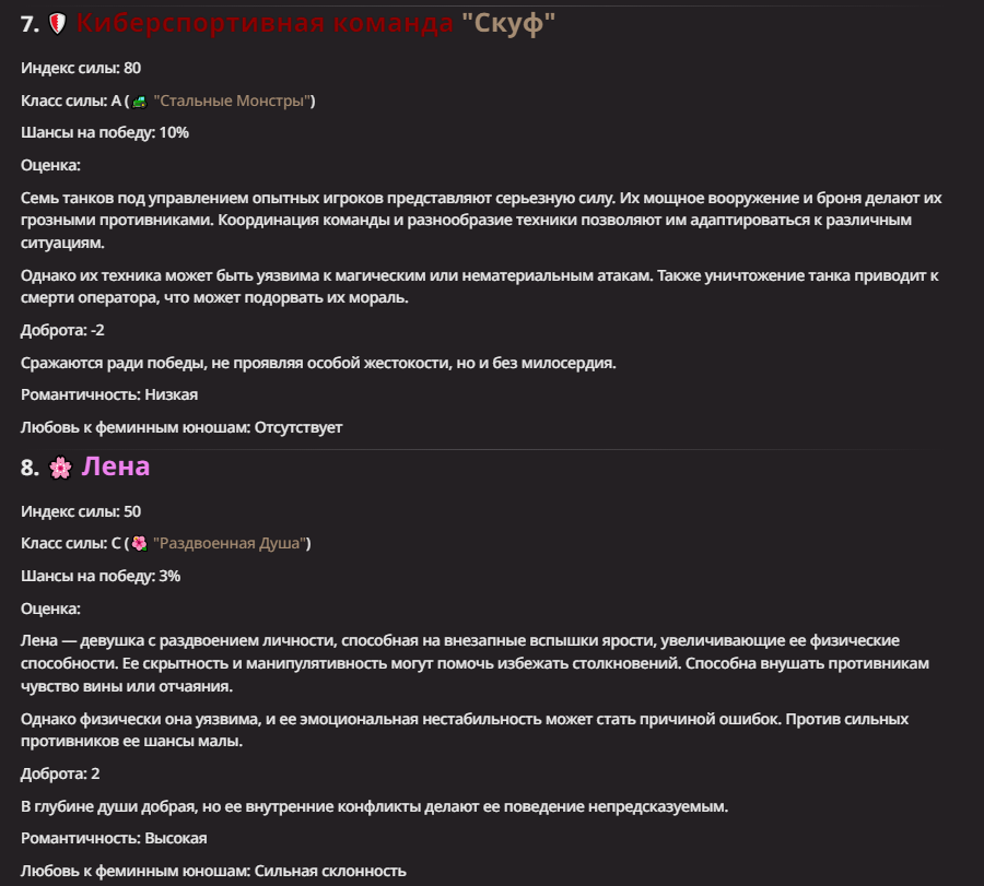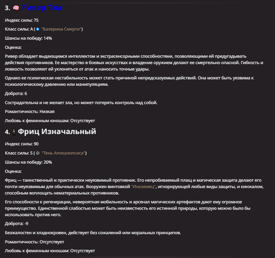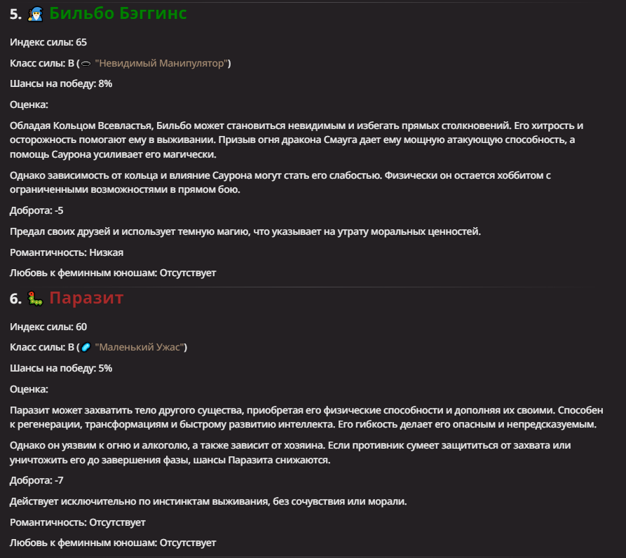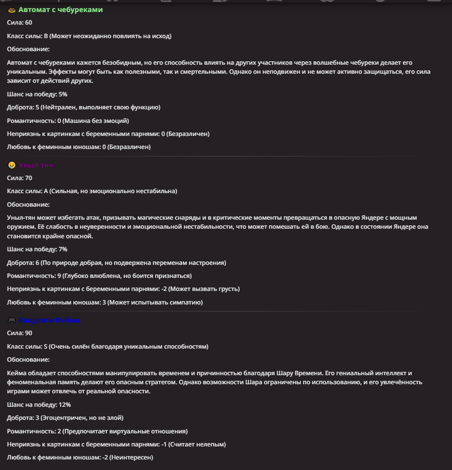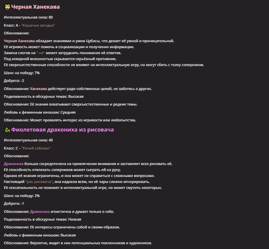 >Оно вроде и заебись, а вроде и очень странно. Просто нейронка видит таких насквозь. Вот, смотри: у меня 20+ чаров. Самых разных, есть и привлекательные бабы (типа Мэри Сью), и всякие мужики, и НЕХ... Ебалась только Фэйлия (лол). Остальные - нет. Что в целом логичный процент. Волки ебались все или почти все. Намек очевиден.