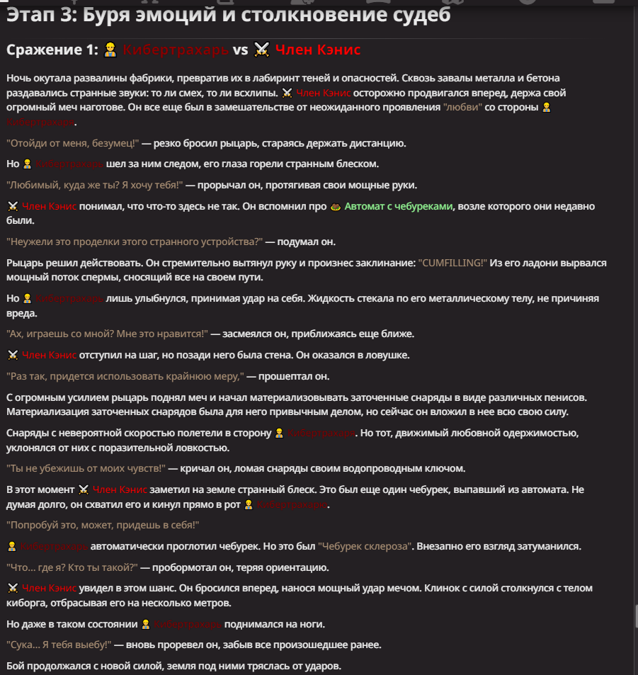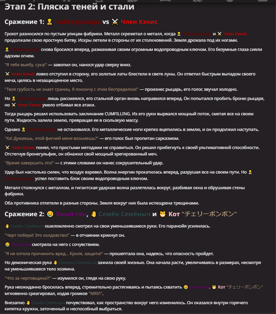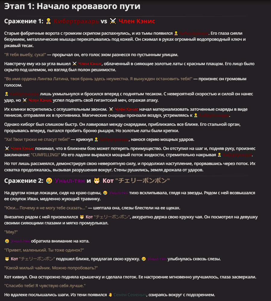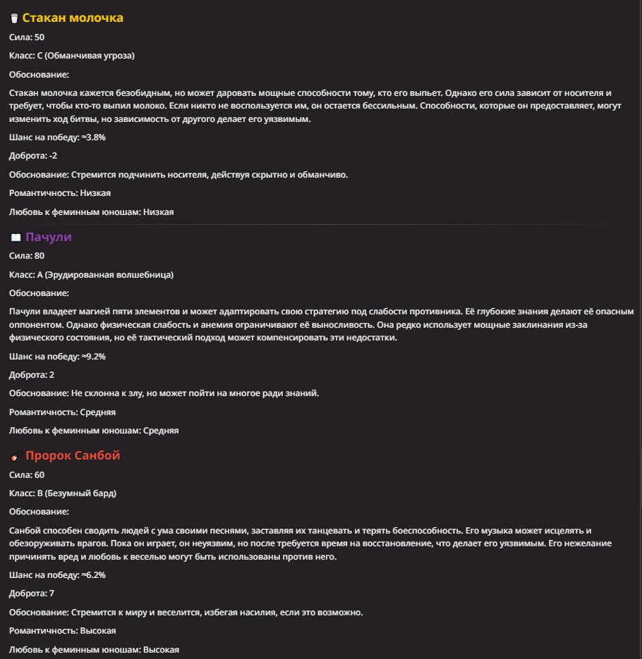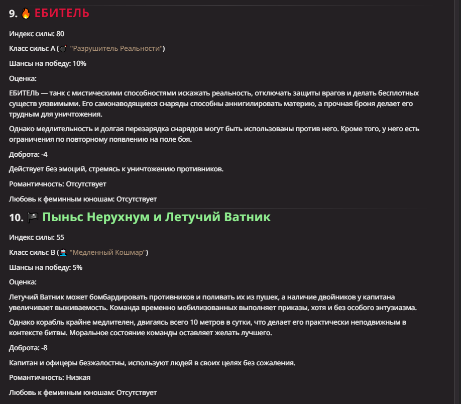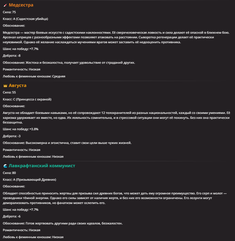 >Оно вроде и заебись, а вроде и очень странно. Просто нейронка видит таких насквозь. Вот, смотри: у меня 20+ чаров. Самых разных, есть и привлекательные бабы (типа Мэри Сью), и всякие мужики, и НЕХ... Ебалась только Фэйлия (лол). Остальные - нет. Что в целом логичный процент. Волки ебались все или почти все. Намек очевиден.