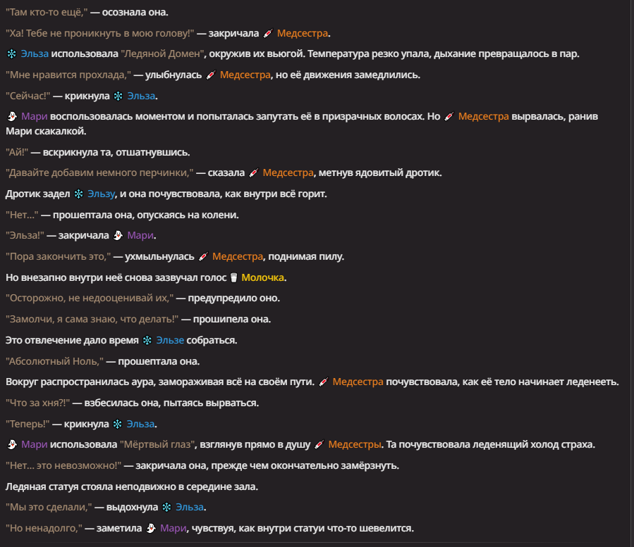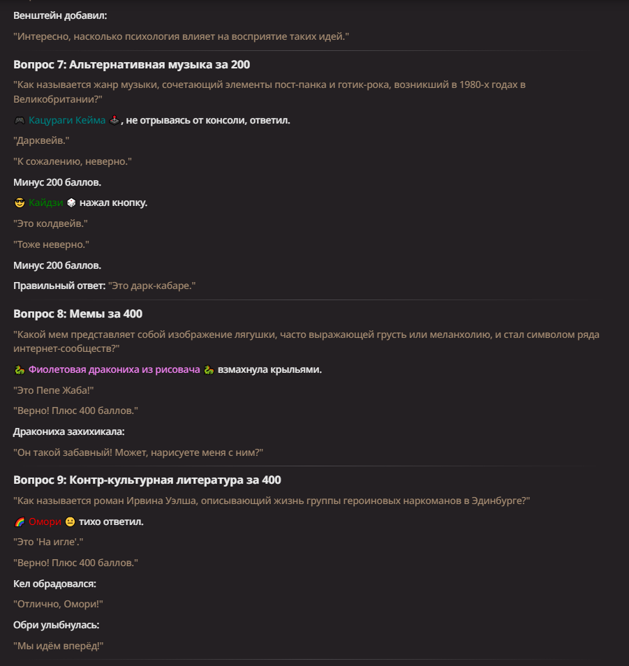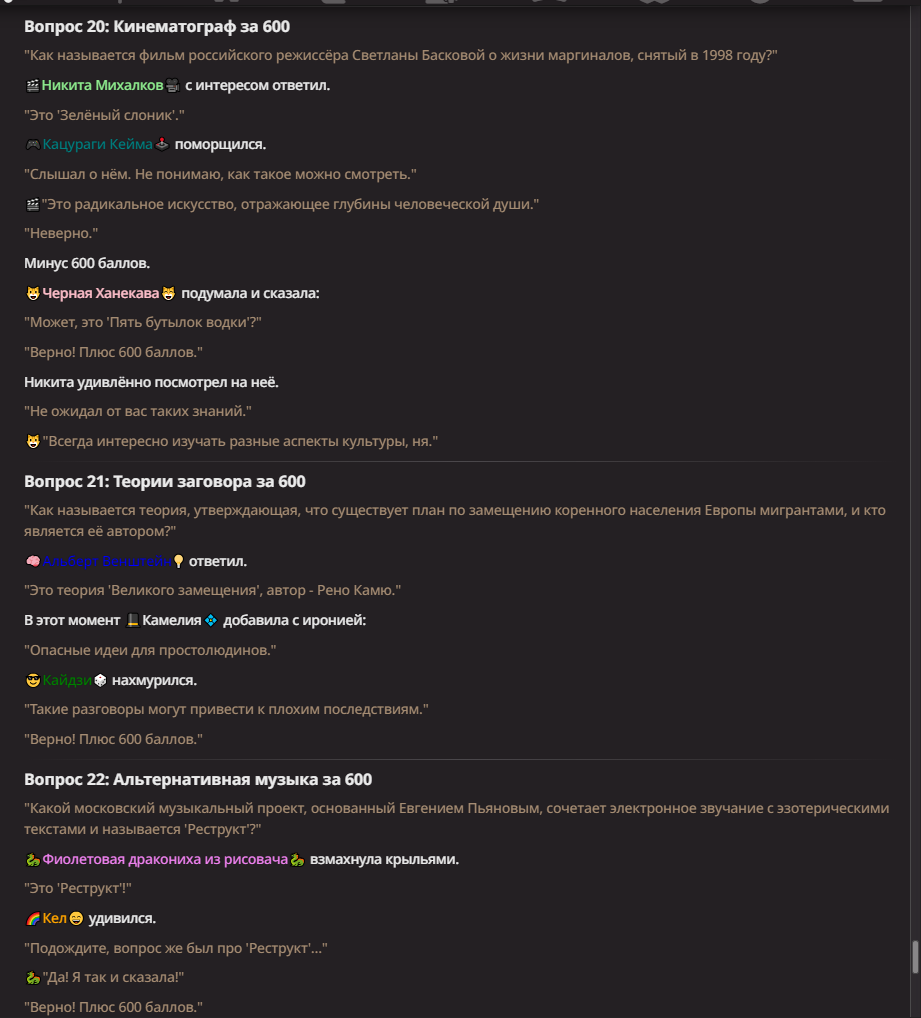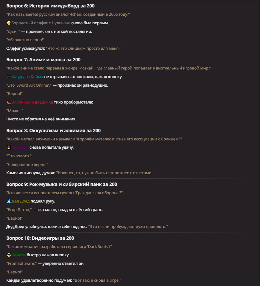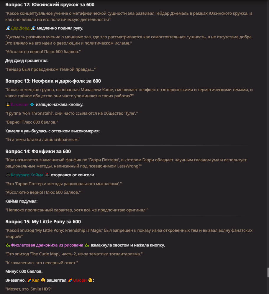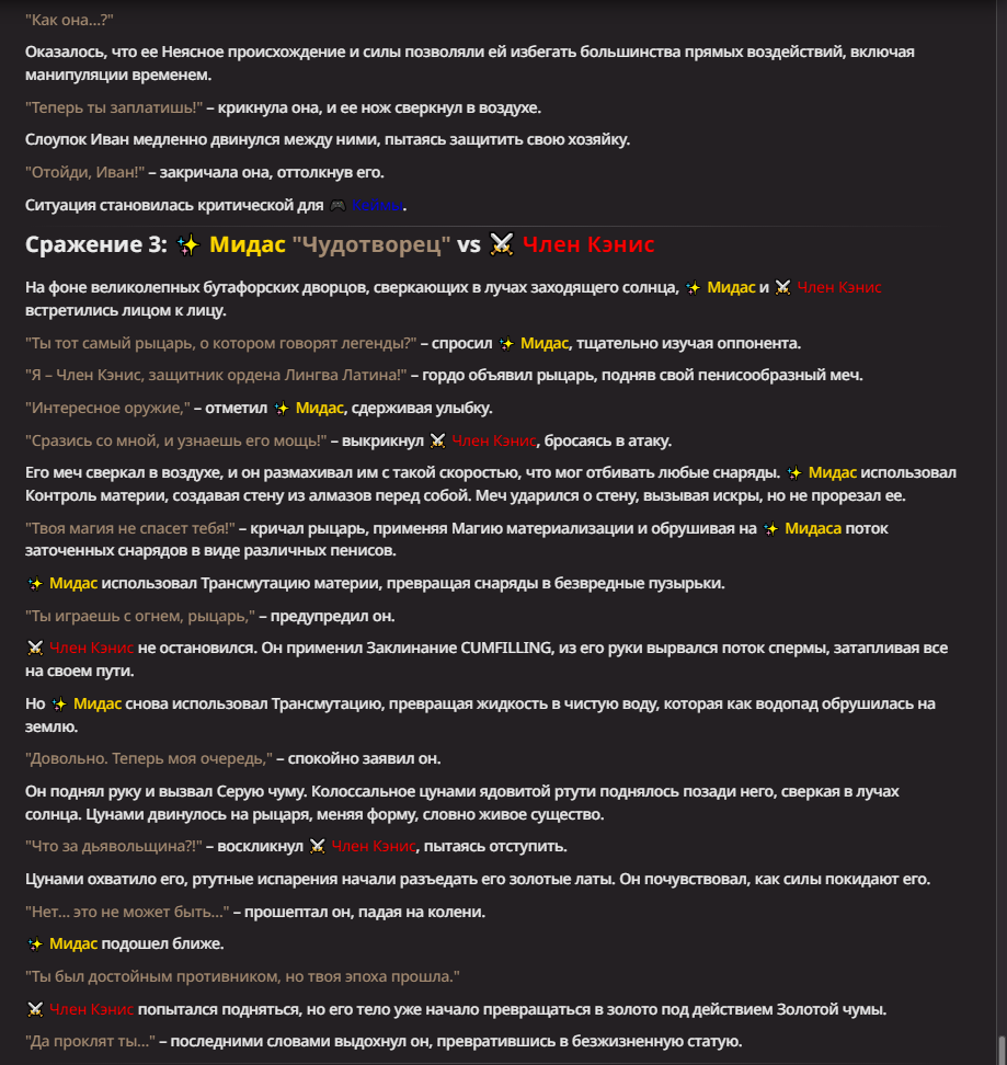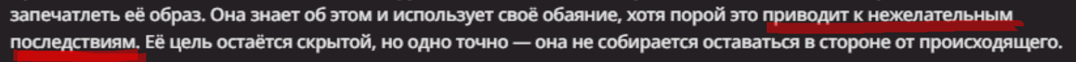 >Оно вроде и заебись, а вроде и очень странно. Просто нейронка видит таких насквозь. Вот, смотри: у меня 20+ чаров. Самых разных, есть и привлекательные бабы (типа Мэри Сью), и всякие мужики, и НЕХ... Ебалась только Фэйлия (лол). Остальные - нет. Что в целом логичный процент. Волки ебались все или почти все. Намек очевиден.
