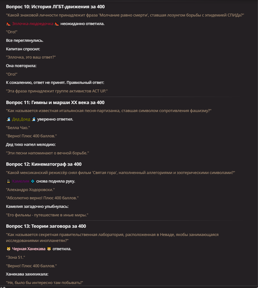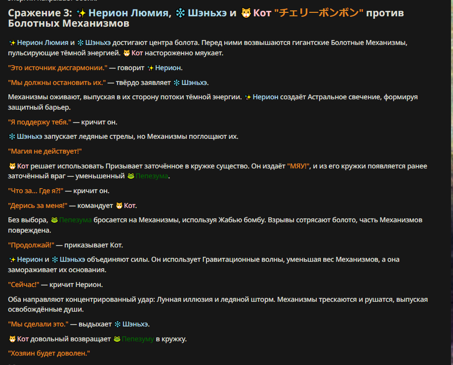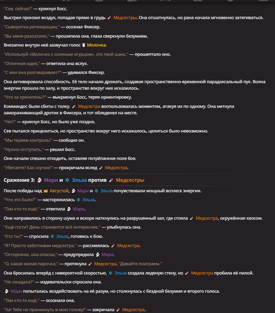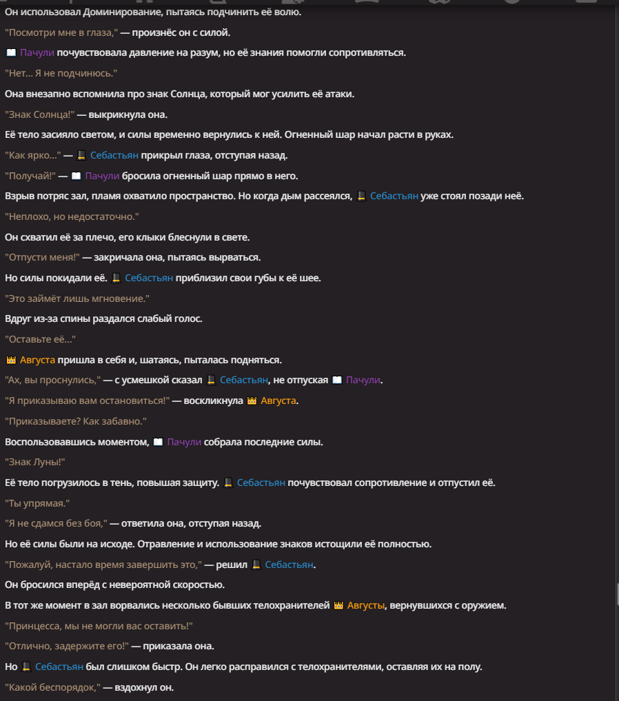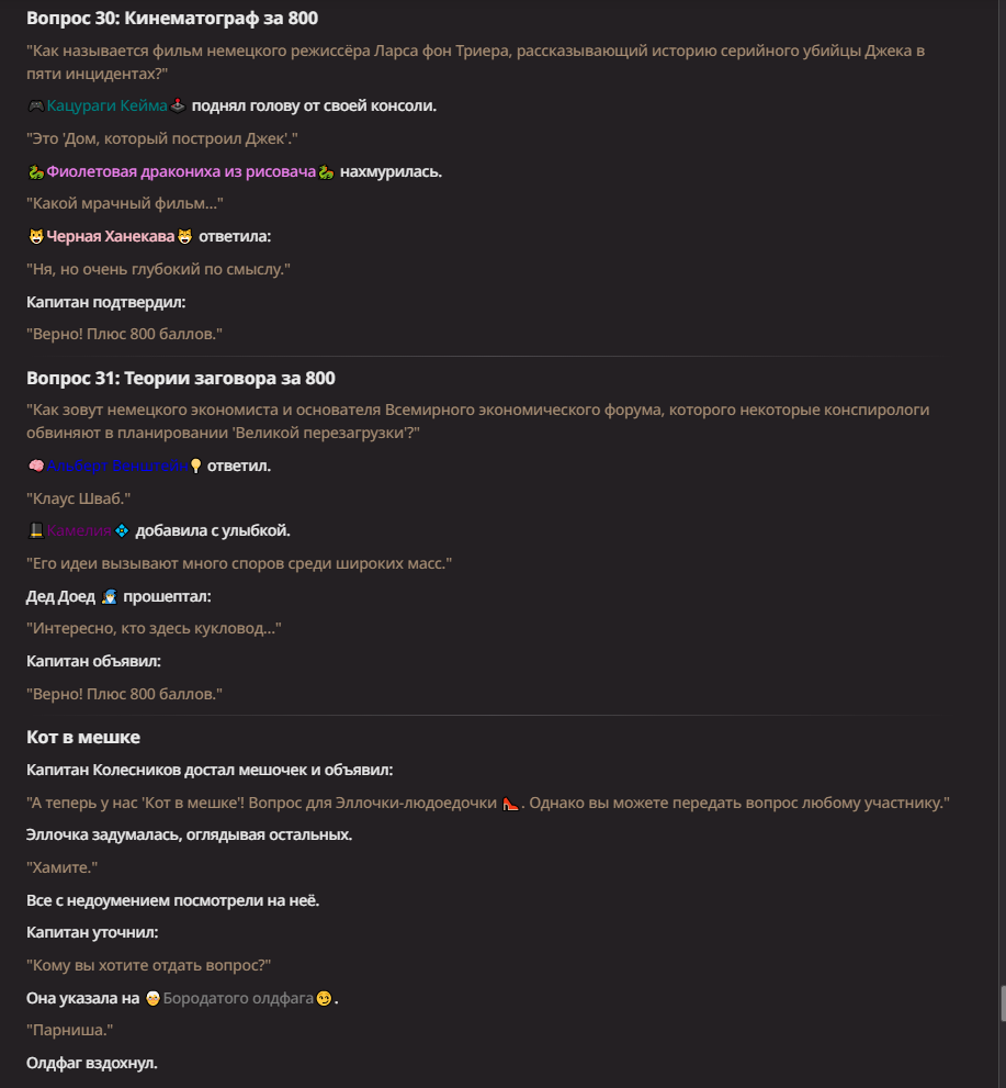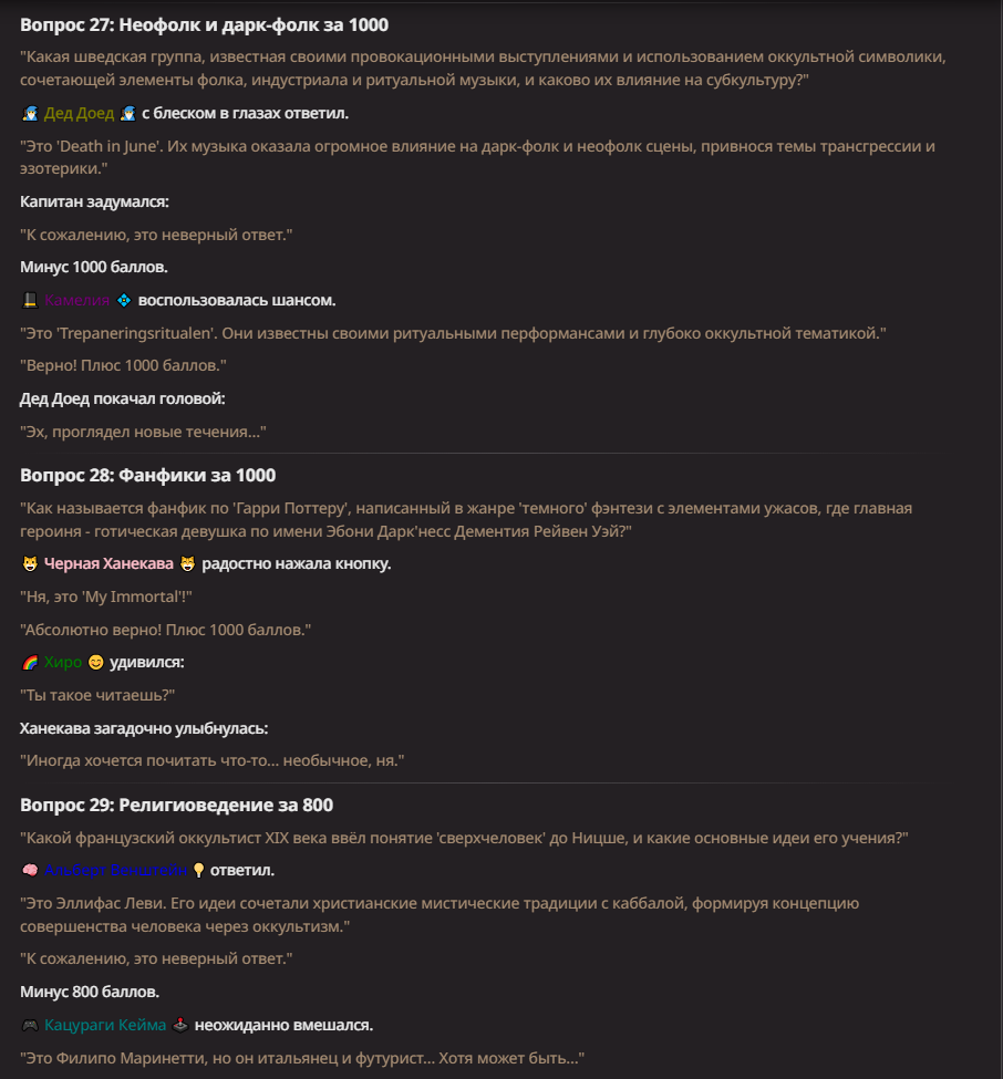 >Оно вроде и заебись, а вроде и очень странно. Просто нейронка видит таких насквозь. Вот, смотри: у меня 20+ чаров. Самых разных, есть и привлекательные бабы (типа Мэри Сью), и всякие мужики, и НЕХ... Ебалась только Фэйлия (лол). Остальные - нет. Что в целом логичный процент. Волки ебались все или почти все. Намек очевиден.
