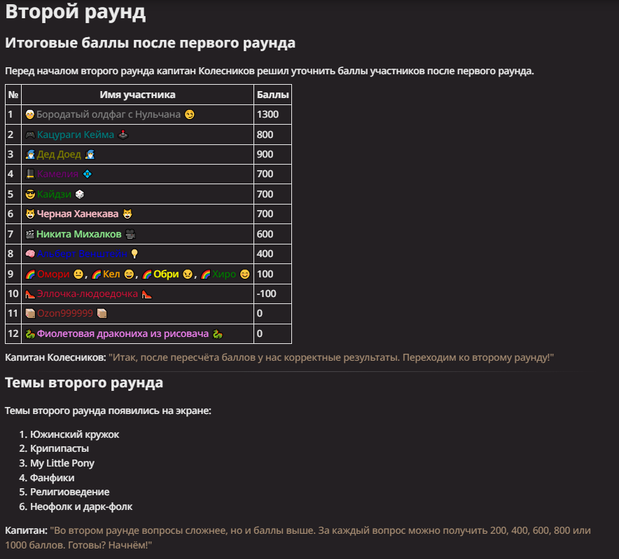 Рекомендации(желательно их выполнять для удобства, моего и вашего): -При предложении локации, оформляйте это так -- Локация: "Название локации". -Если вы предлагаете своего личного персонажа то не поленитесь его подробно описать. -Постарайтесь не копипастить описание персонажа из Интернета и не бросайте огромные простыни текста -Если вы заметили, что в список попал слишком имбовый персонаж то не бойтесь об этом написать. -От себя закидывайте 1-2 персонажа, дайте шанс другим анонам проявить себя. -Не будьте слишком назойливы и эгоцентричны. Уважайте других игроков и ведущих.