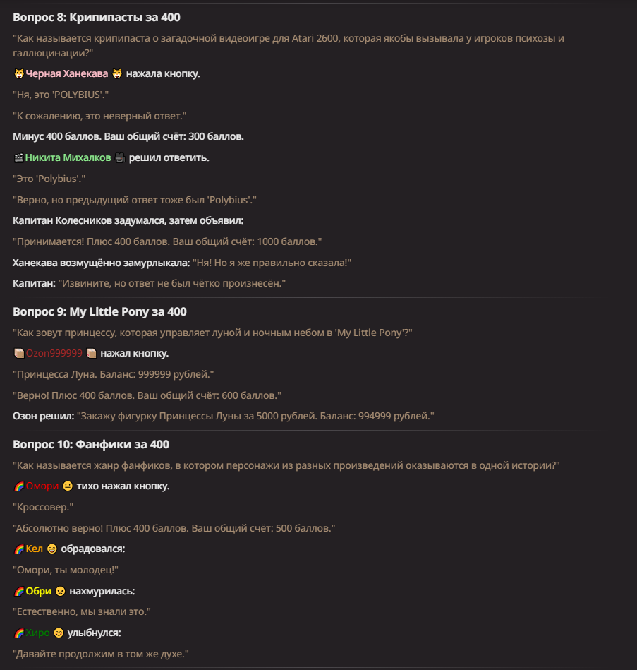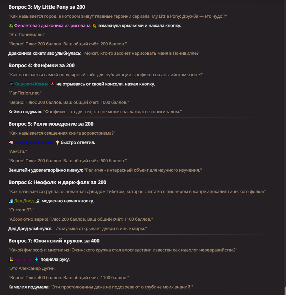 Поэтому теперь есть перс спецом для ебли. Еще бы он научился лулзов выдавать на уровне Сельского Сральника, но будем посмотреть, пока статистики мало, он только один бой отыграл.