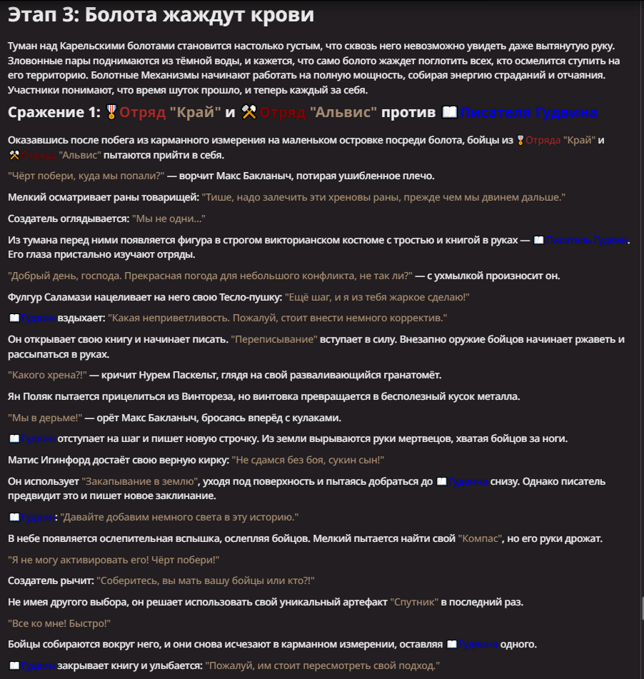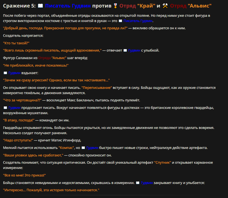 В вихре времен: Писатель призывает на поле боя один из следующих отрядов: британские королевский гвардейцы, отряд французских конных рыцарей времен столетней войны, доисторическое племя Обунга с копьям и ежепалками, танк ИС-2 с мотострелковой бригадой РККА прямиком из Берлина 1945, штурмовую группу ЧВК "Вагнер" при поддержке артиллерии и авиации, отряд генномодифицированных славийских волков в экзоскелетах с плазменными винтовками и гранатометами, крестоносцев времен битвы за Иерусалим. Терраформинг: описывает в своей книге изменения местности вокруг противника, создавая вокруг него непроходимые болота, джунгли с опасными и ядовитыми существами, либо зыбучие пески. Изменения могут затронуть все поле боя. Переписывание: описывает в своей книге изменения противника, заставляя неуязвимого стать уязвимым, ослабляя слишком сильные способности противника, либо наоборот усиливая и леча слишком слабых союзников. Также Гудвин может излечить себя полностью, написав об этом в книге. Попаданческий эпик: самая сильная способность Писателя. Вызывает коллапс текущей временной линии, призывая на поле боя все возможные отрды из прошлого, настоящего и будущего, включая российские попаданческие книги. Это создает абсолютный хаос на поле боя. Эвакуация!: если Писатель слишком сильно ранен, он может переписать реальность и исчезнуть с поля боя. Это автоматически выводит его из боя насовсем.