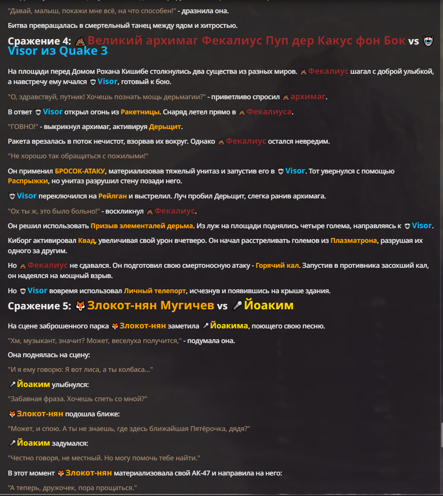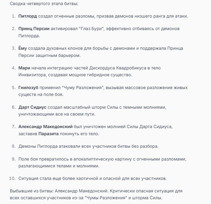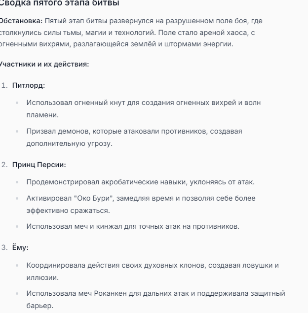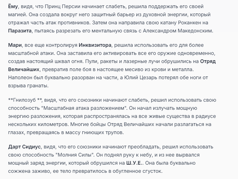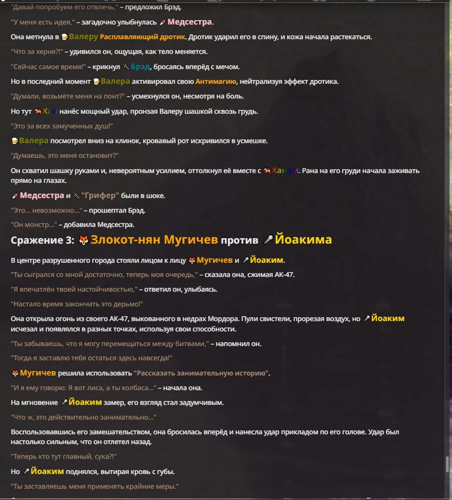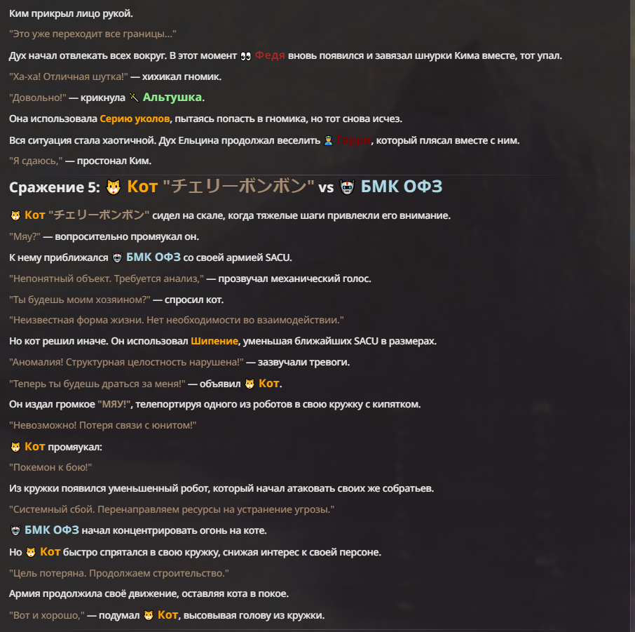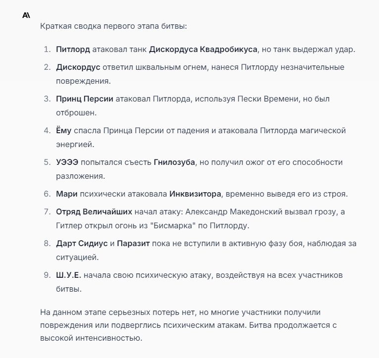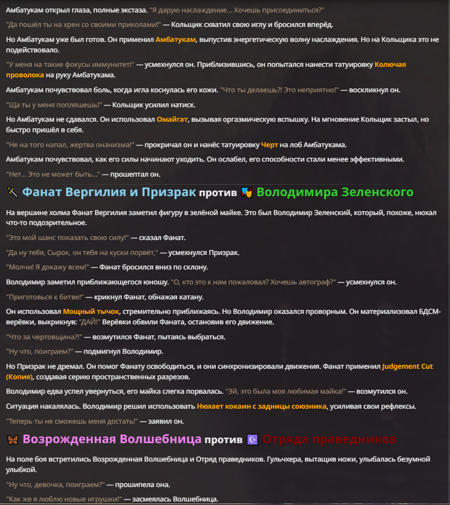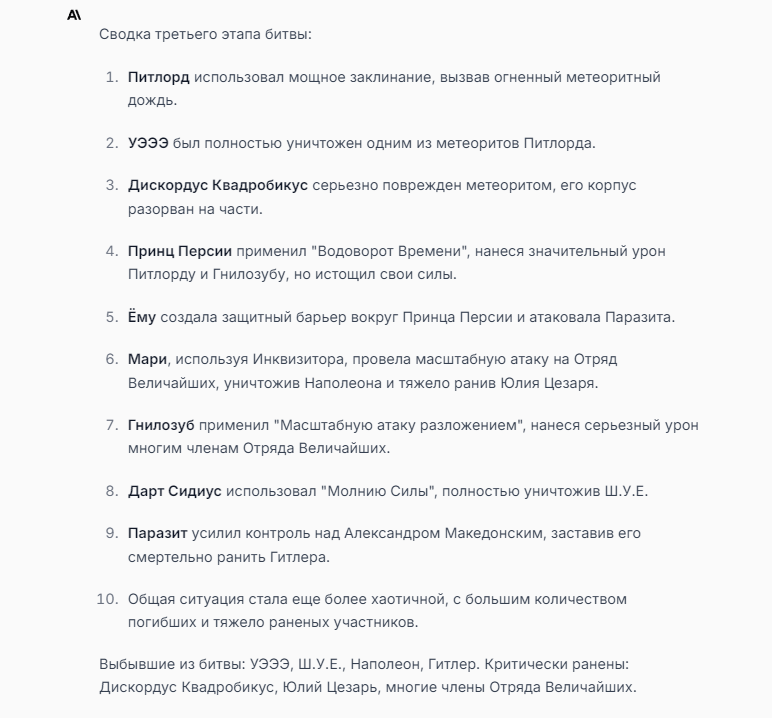 Я ебал аноны. Хуета какая. Гопота проебывает персонажей, путает способности, не может нормально отобразить потери. Чет я не справляюсь, мб промт хуйня, мб версия гопоты не так. Я спать. Приношу извинения что не смог провести нормальных боев и так сильно выебывался на Злокота.