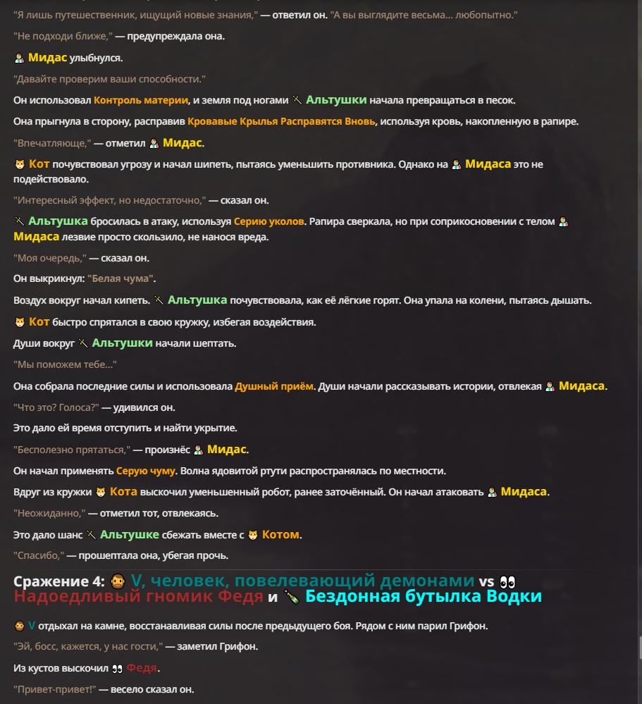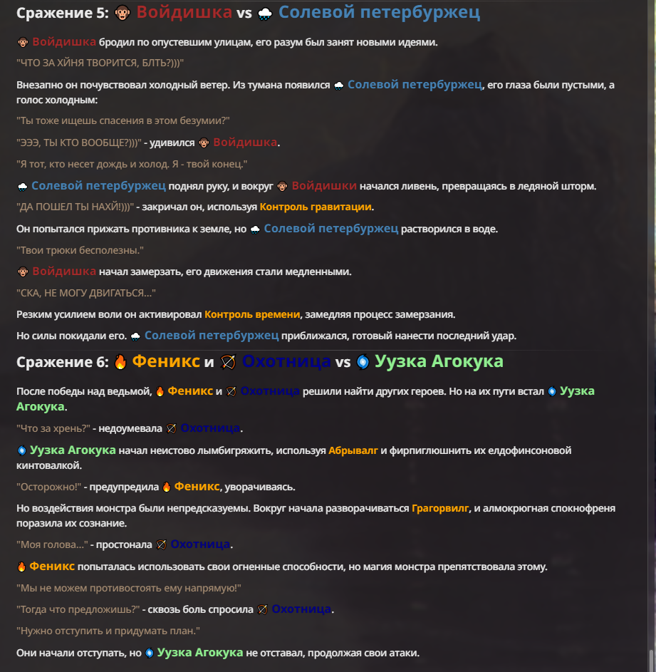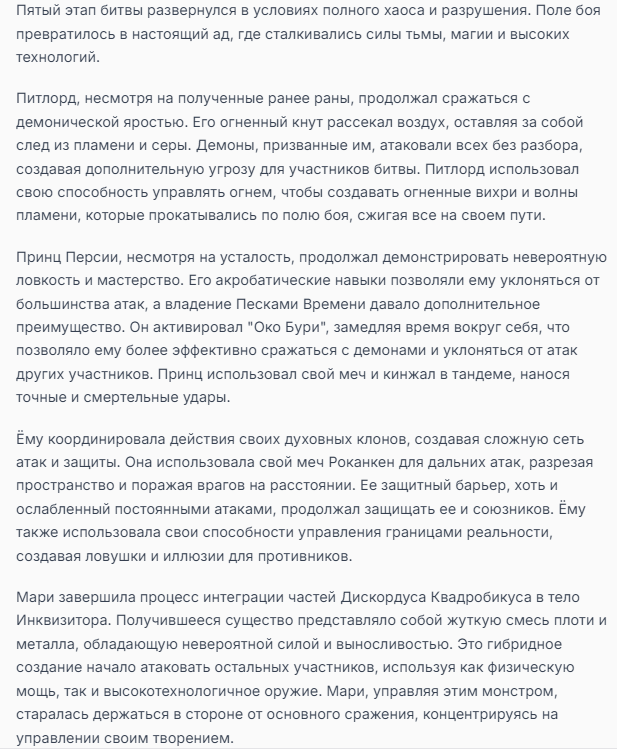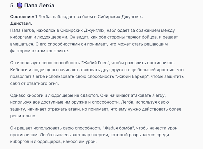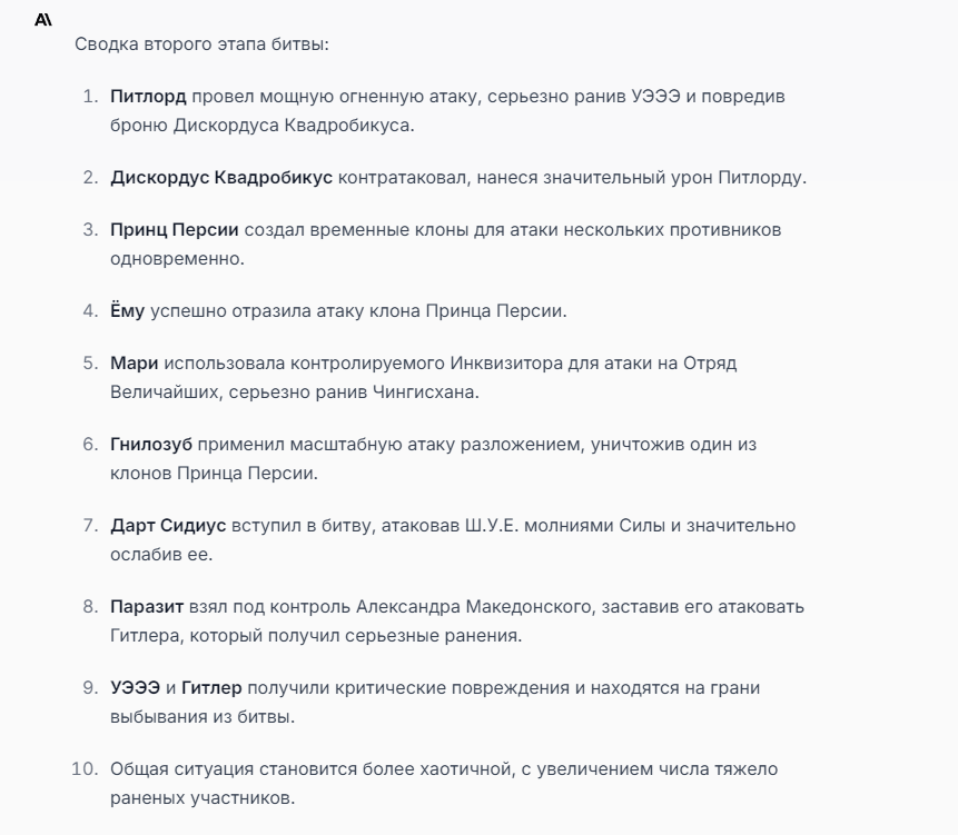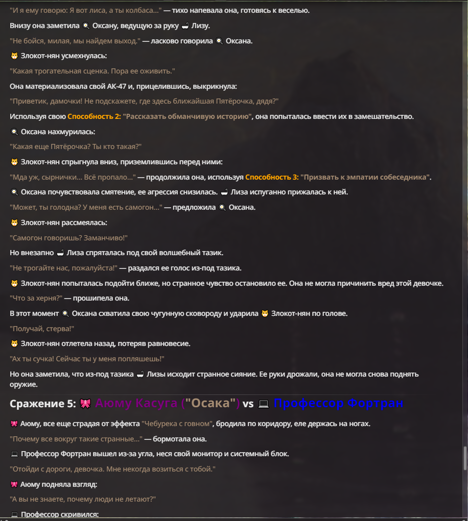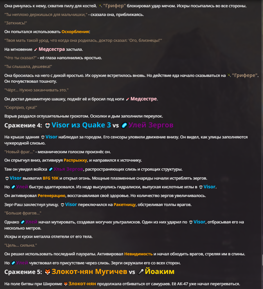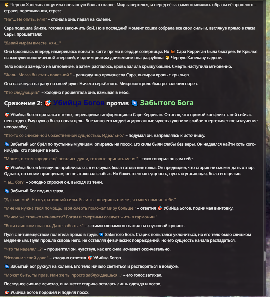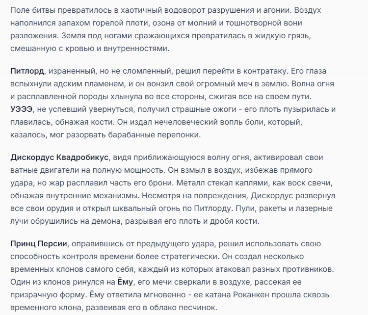Я ебал аноны. Хуета какая. Гопота проебывает персонажей, путает способности, не может нормально отобразить потери. Чет я не справляюсь, мб промт хуйня, мб версия гопоты не так. Я спать. Приношу извинения что не смог провести нормальных боев и так сильно выебывался на Злокота.