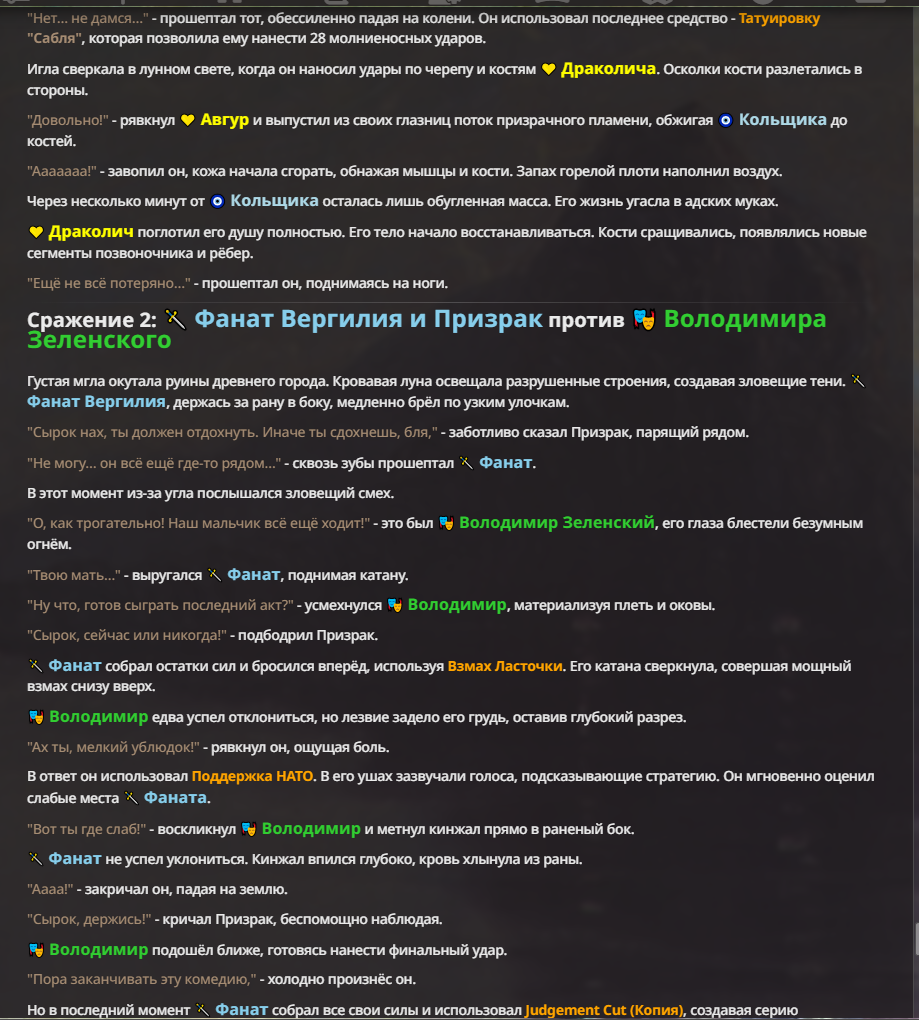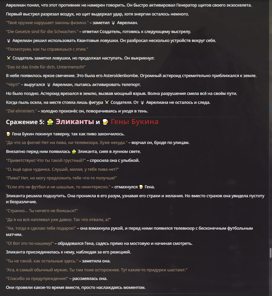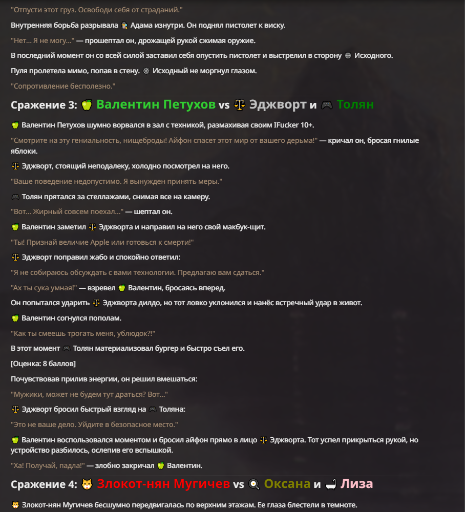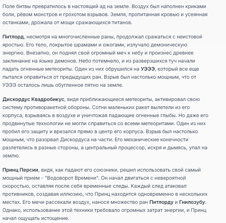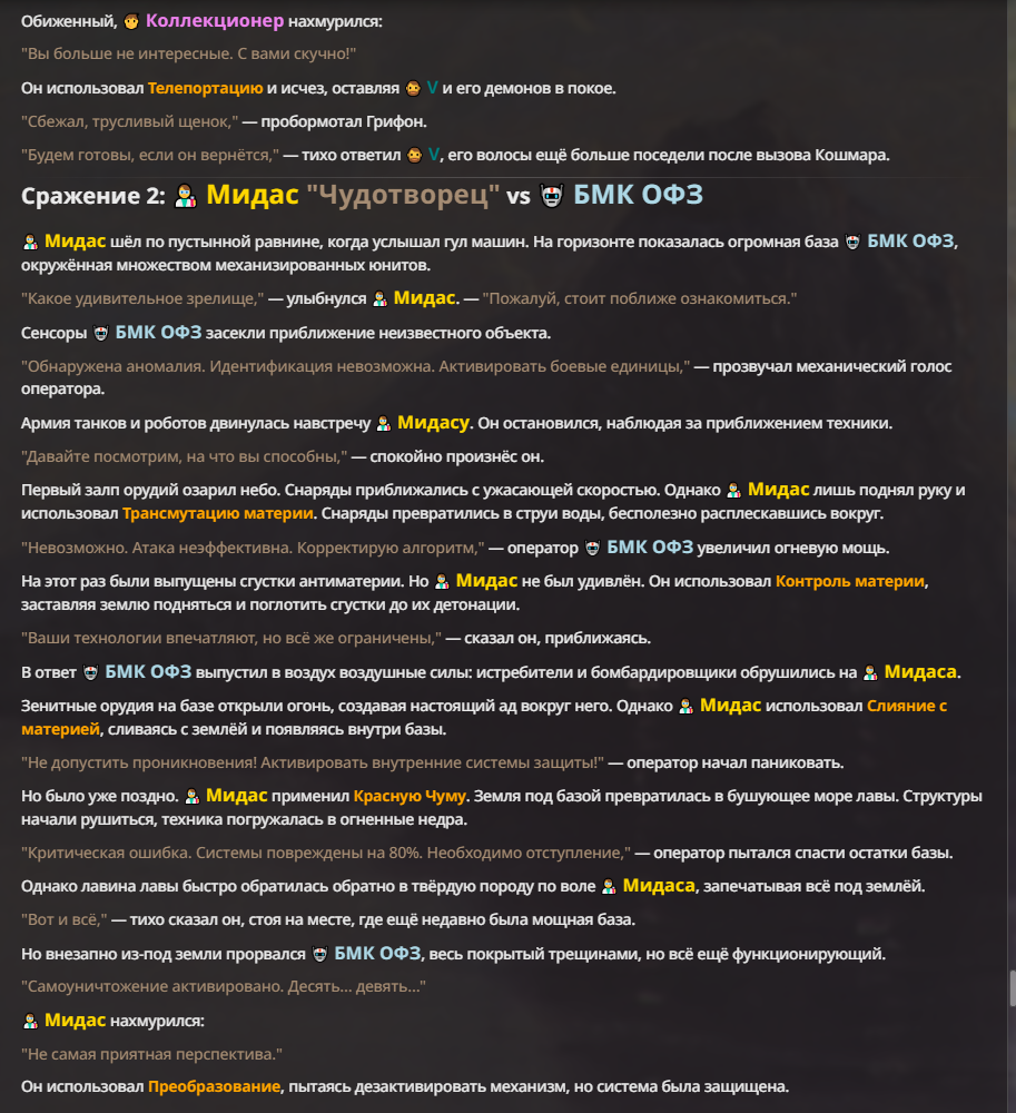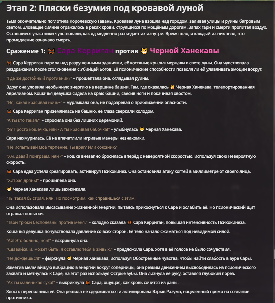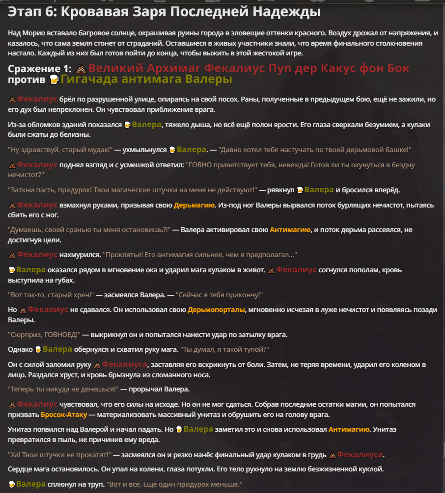 Я ебал аноны. Хуета какая. Гопота проебывает персонажей, путает способности, не может нормально отобразить потери. Чет я не справляюсь, мб промт хуйня, мб версия гопоты не так. Я спать. Приношу извинения что не смог провести нормальных боев и так сильно выебывался на Злокота.